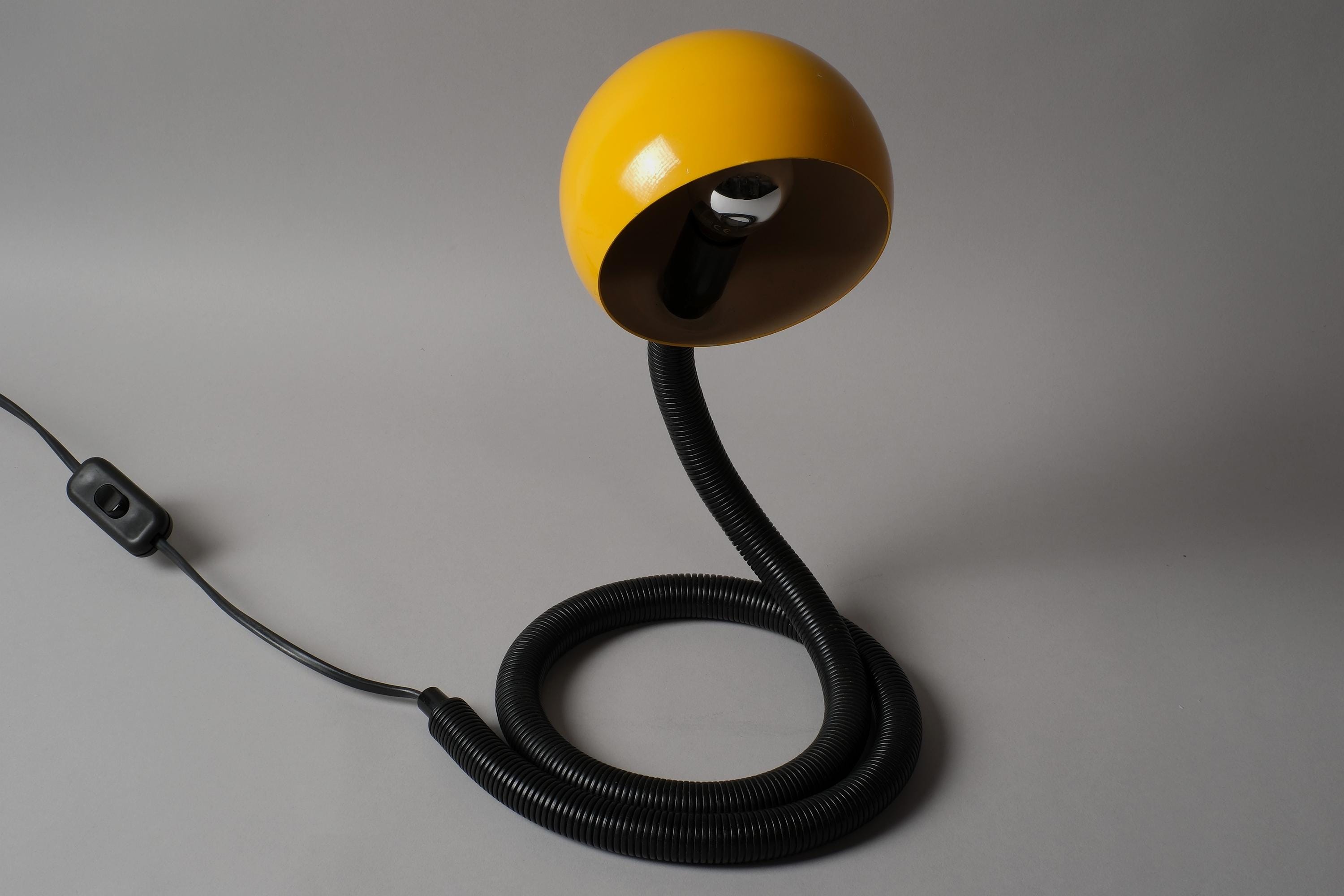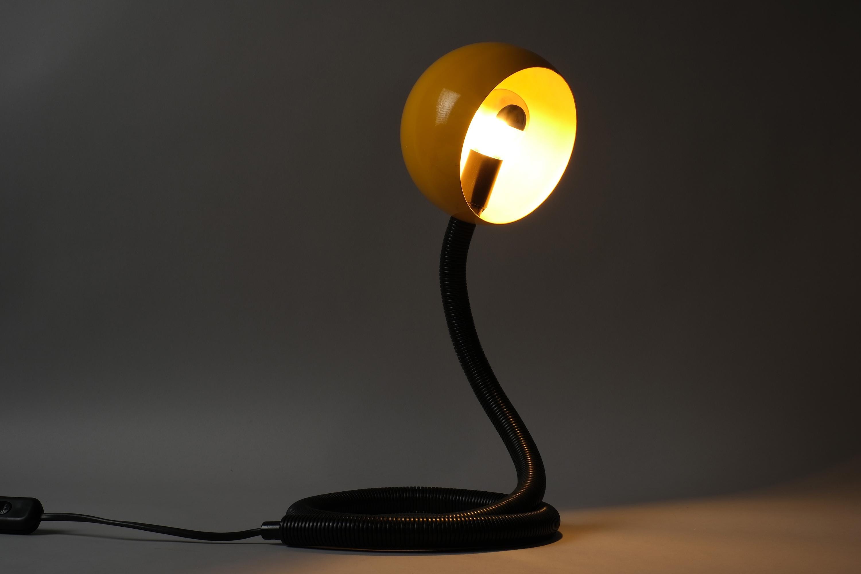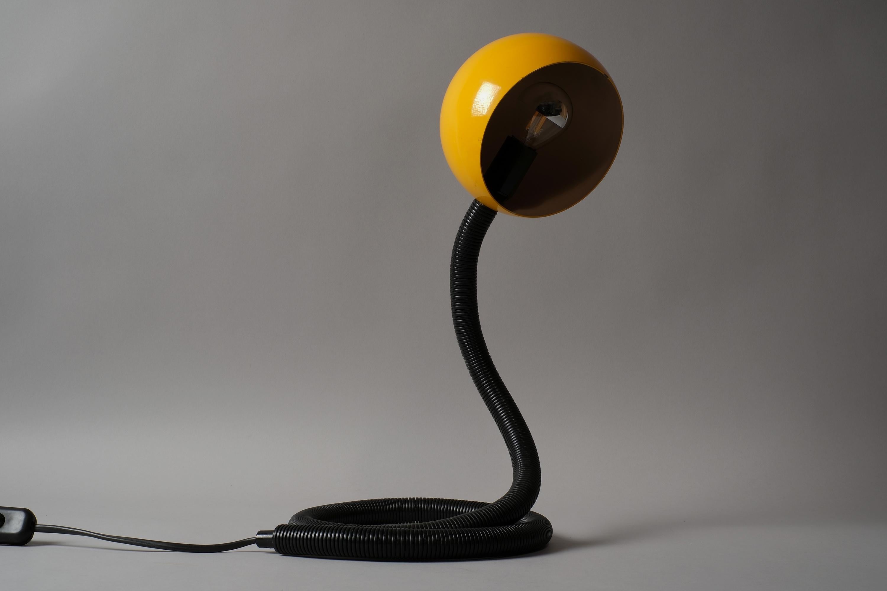 Vintage 1970s Vrieland Design snake table lamp in yellow lacquered metal with a black corrugated PVC flexible gooseneck arm, Holland. Yellow dome head pivoting freely on the poseable arm, the whole object is sculptural in any position whether lit or not. Coil it. Stretch it. Loop it across the desk. It holds every position the arm is given. E14 fitting. Fully functional.