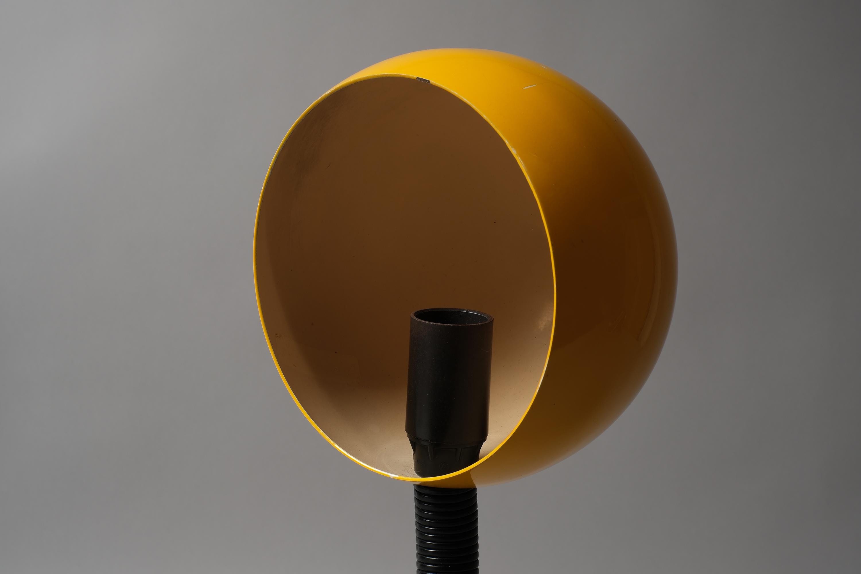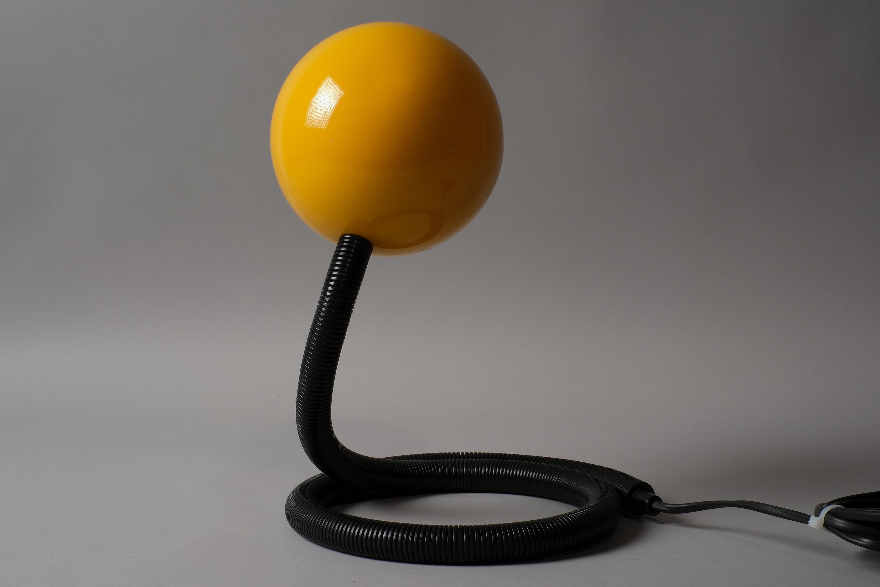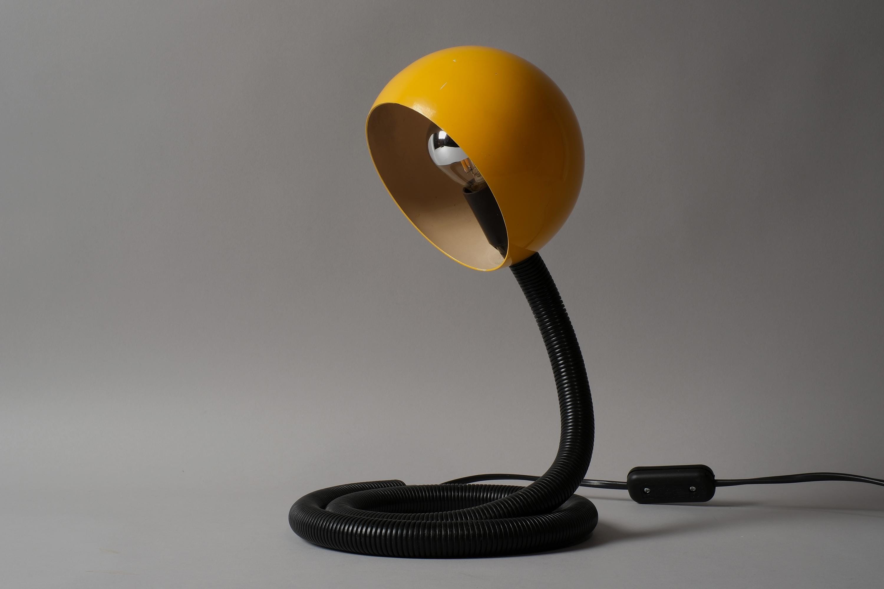 Vintage 1970s Vrieland Design snake table lamp in yellow lacquered metal with a black corrugated PVC flexible gooseneck arm, Holland. Yellow dome head pivoting freely on the poseable arm, the whole object is sculptural in any position whether lit or not. Coil it. Stretch it. Loop it across the desk. It holds every position the arm is given. E14 fitting. Fully functional.