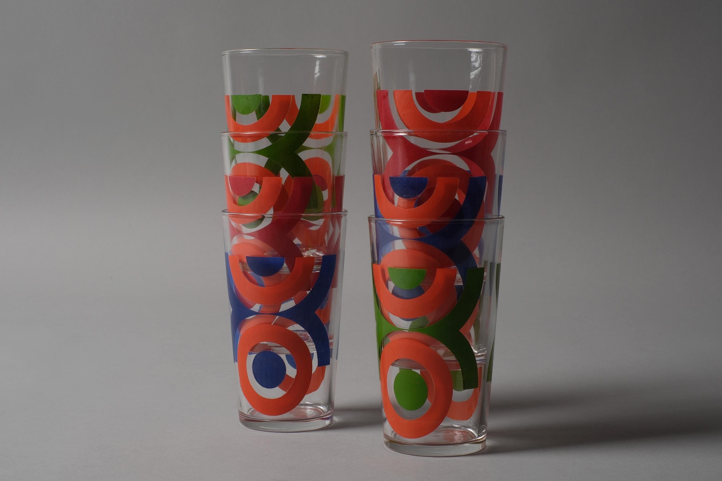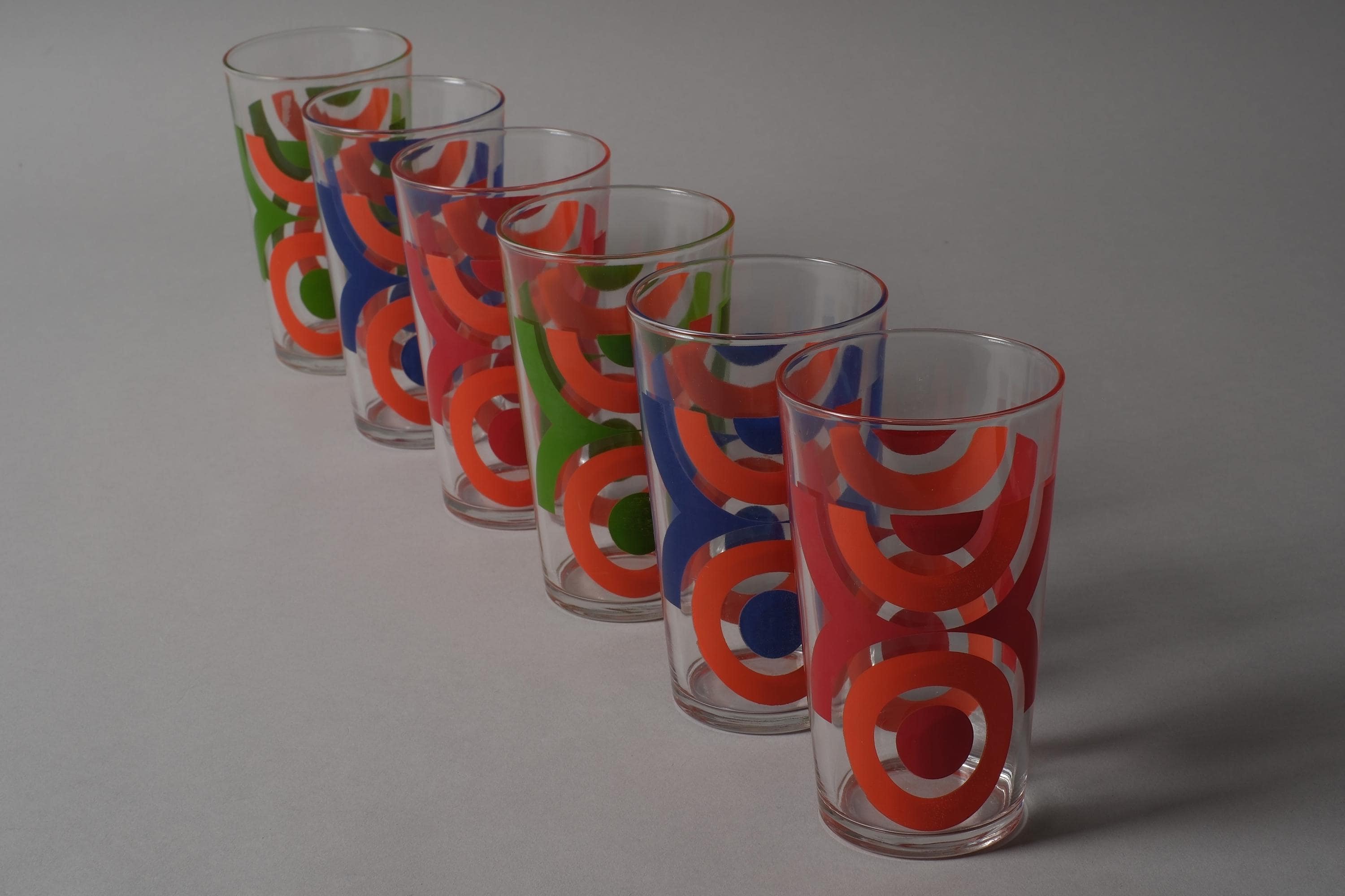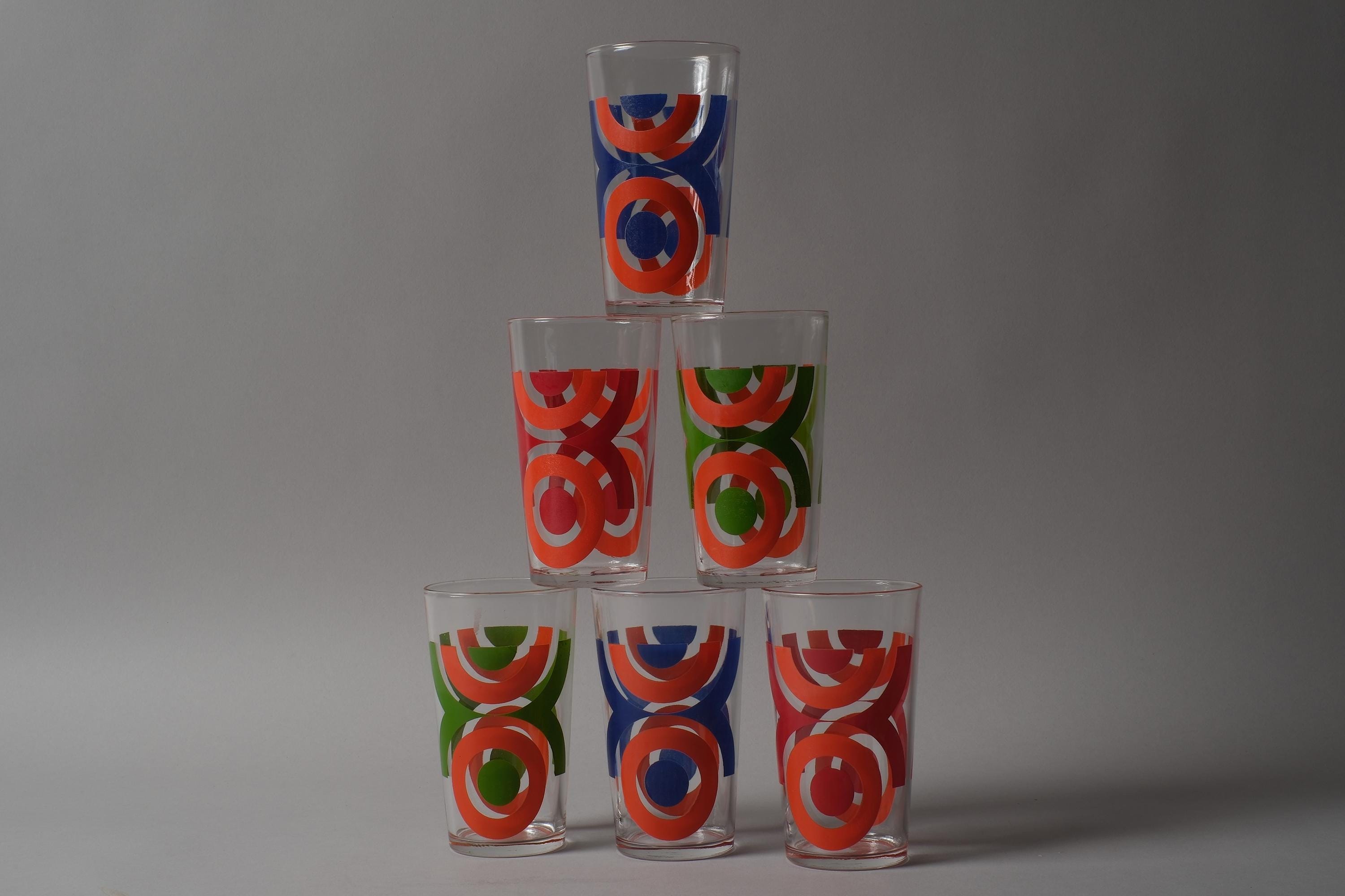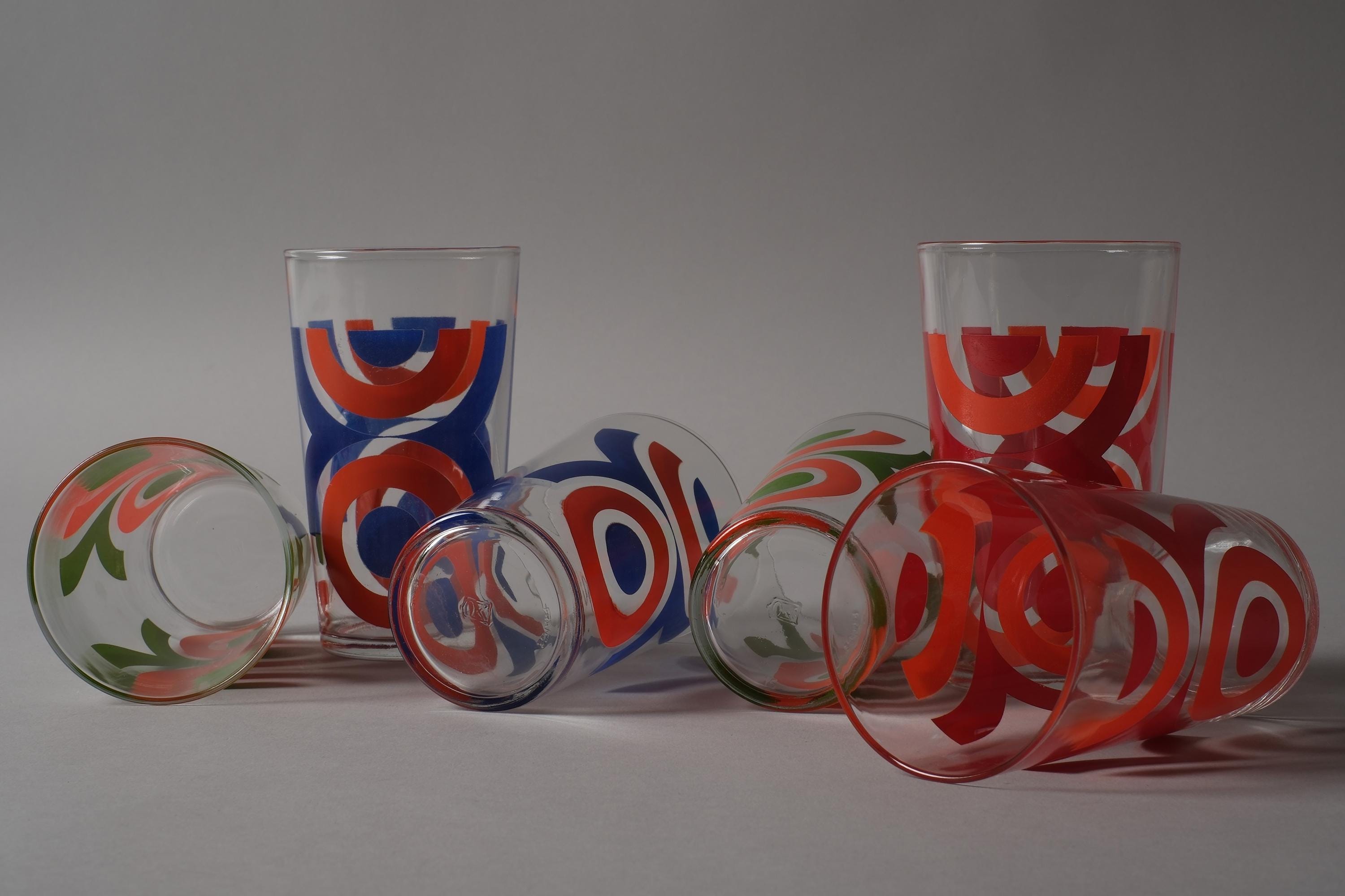 Vintage 1970s set of six tumbler glasses by VMC Reims (Verrerie Mécanique Champenoise), France, with abstract geometric prints in orange, red, blue and green, directly applied to the clear glass. Slightly tapered form, space age graphic mood. VMC Reims was one of the major French domestic glassware producers of the 20th century, known for their decorated tumblers and tableware that dressed French kitchens from the 1950s through the 1980s.