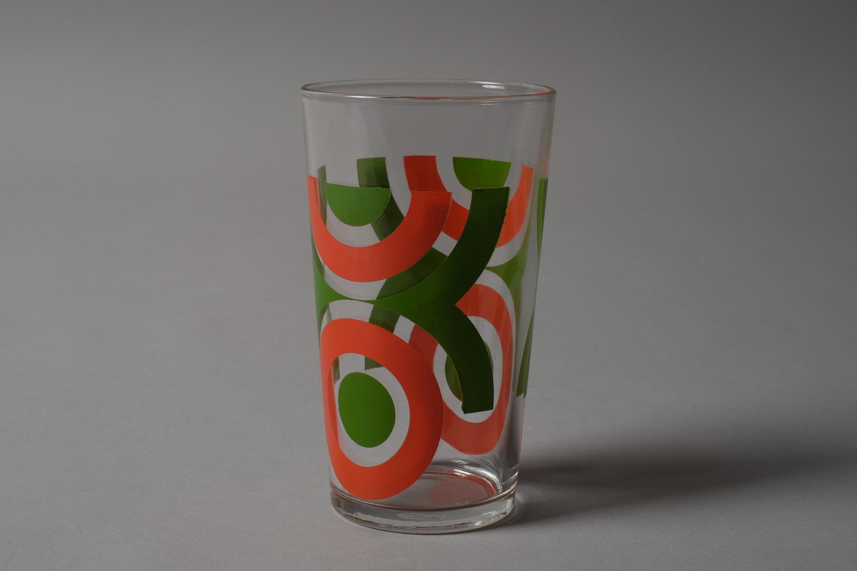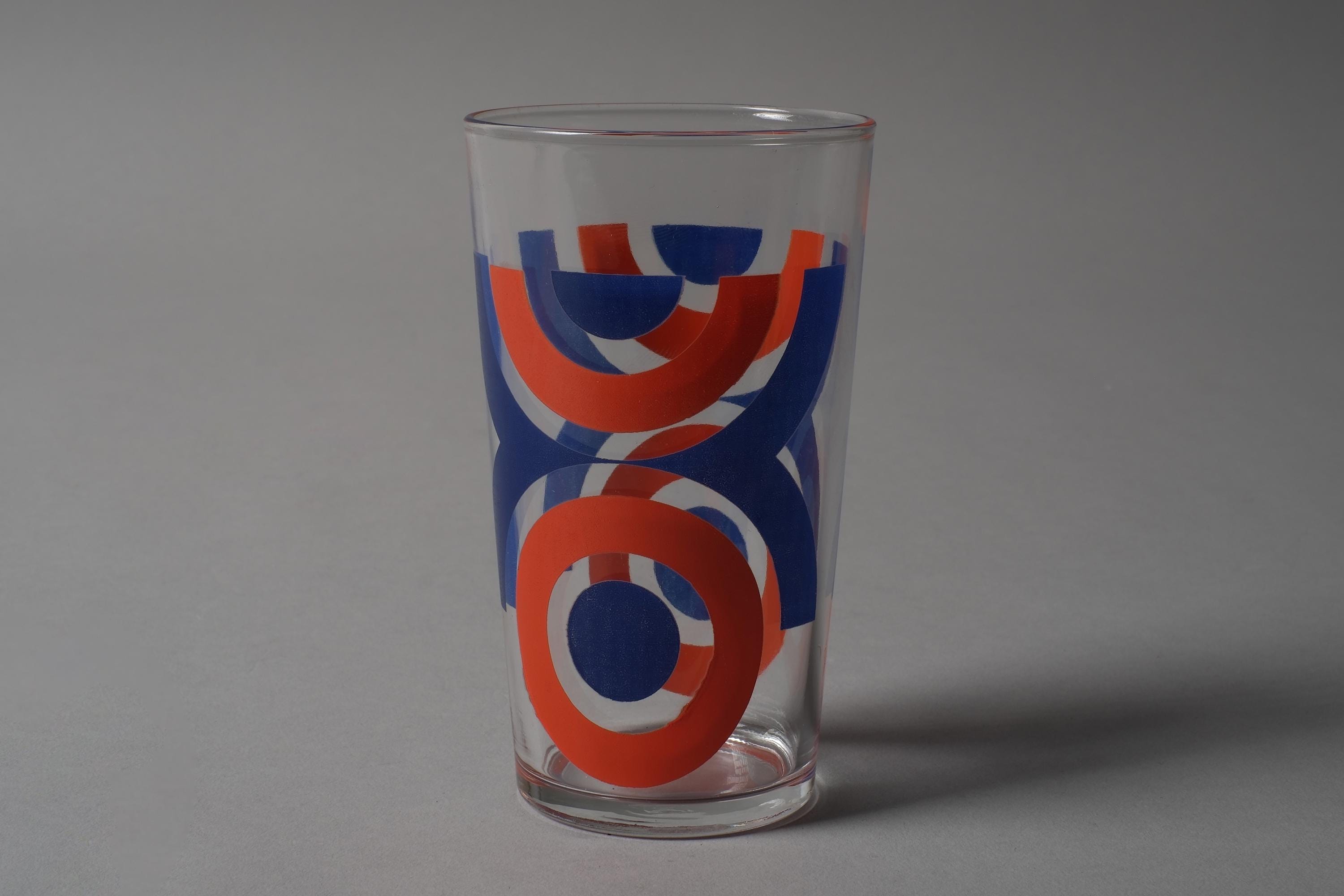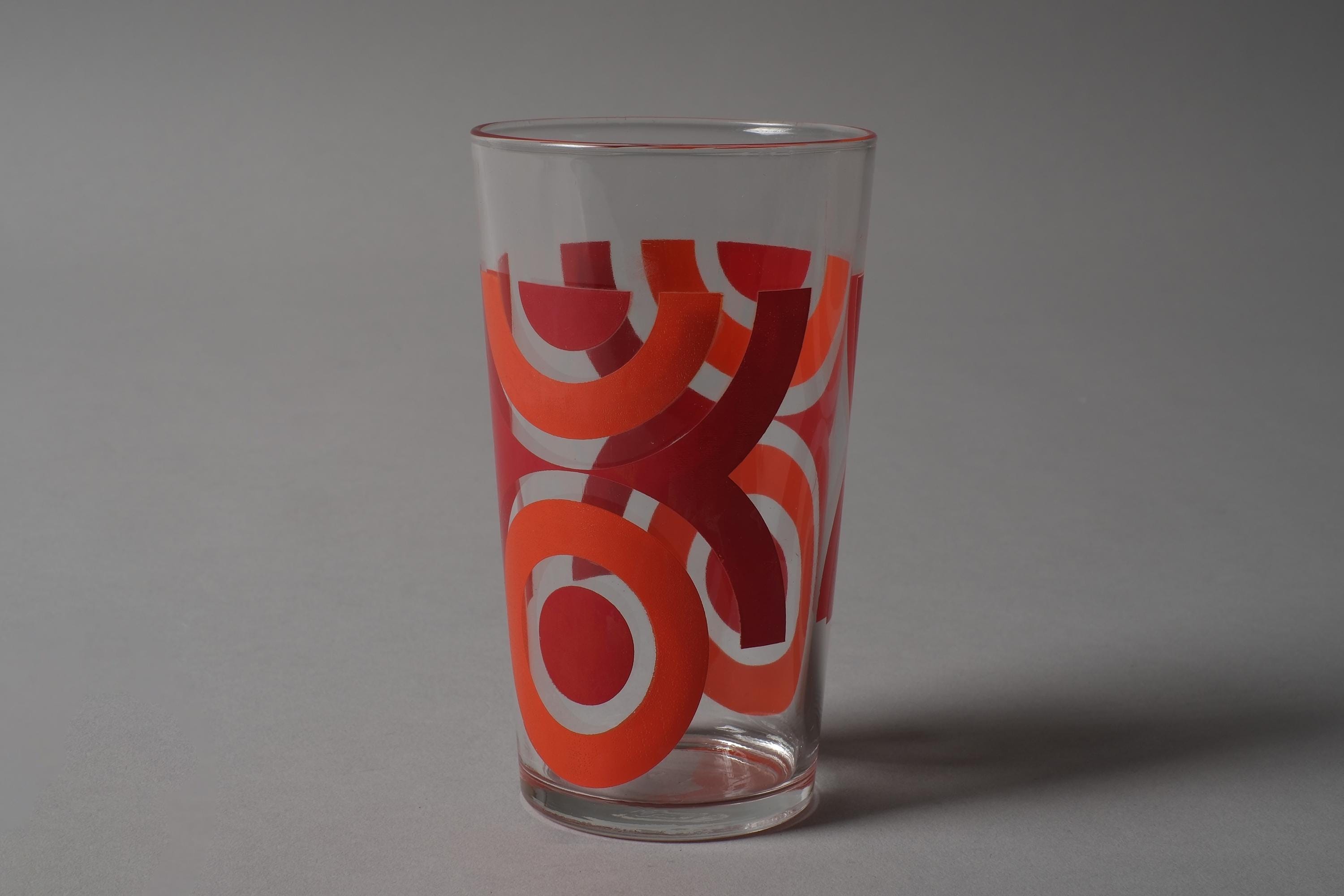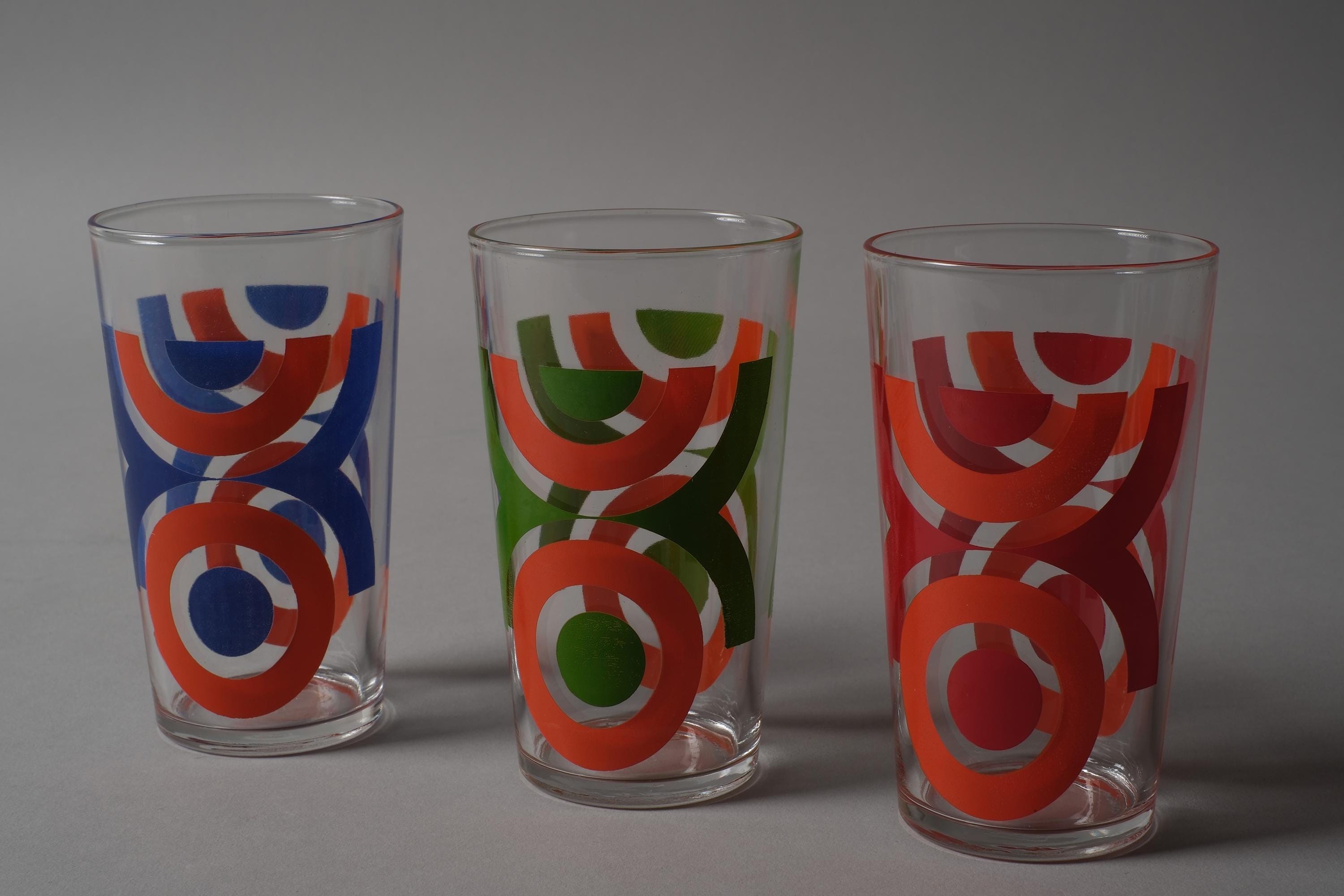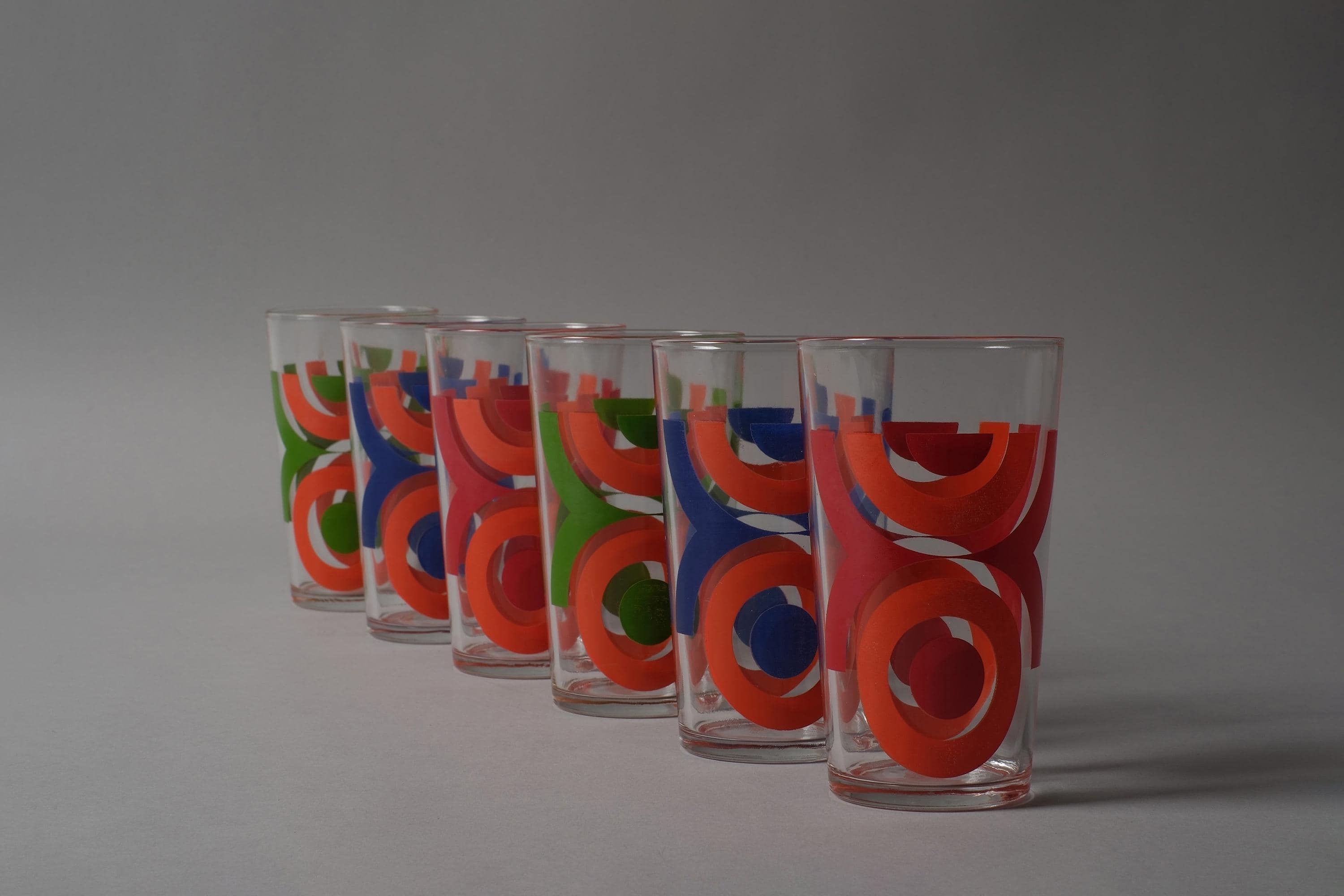 Vintage 1970s set of six tumbler glasses by VMC Reims (Verrerie Mécanique Champenoise), France, with abstract geometric prints in orange, red, blue and green, directly applied to the clear glass. Slightly tapered form, space age graphic mood. VMC Reims was one of the major French domestic glassware producers of the 20th century, known for their decorated tumblers and tableware that dressed French kitchens from the 1950s through the 1980s.