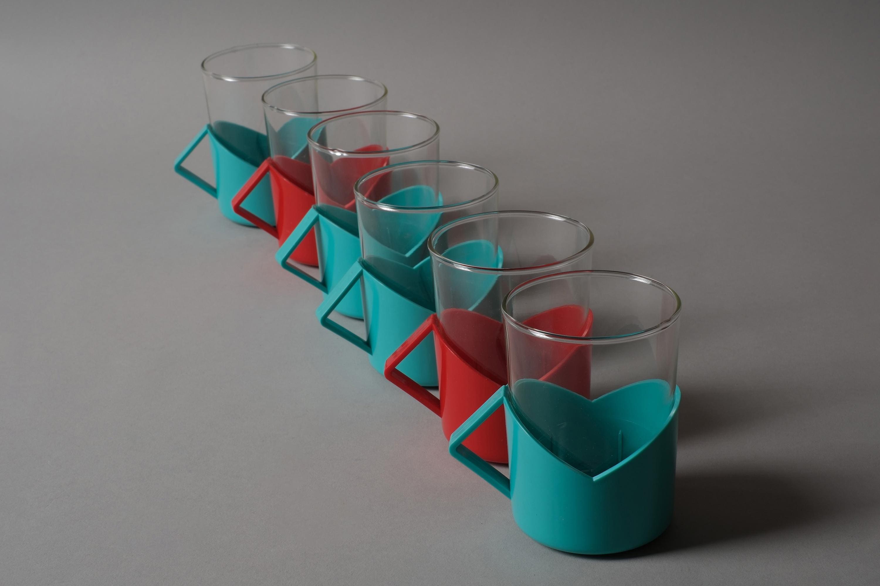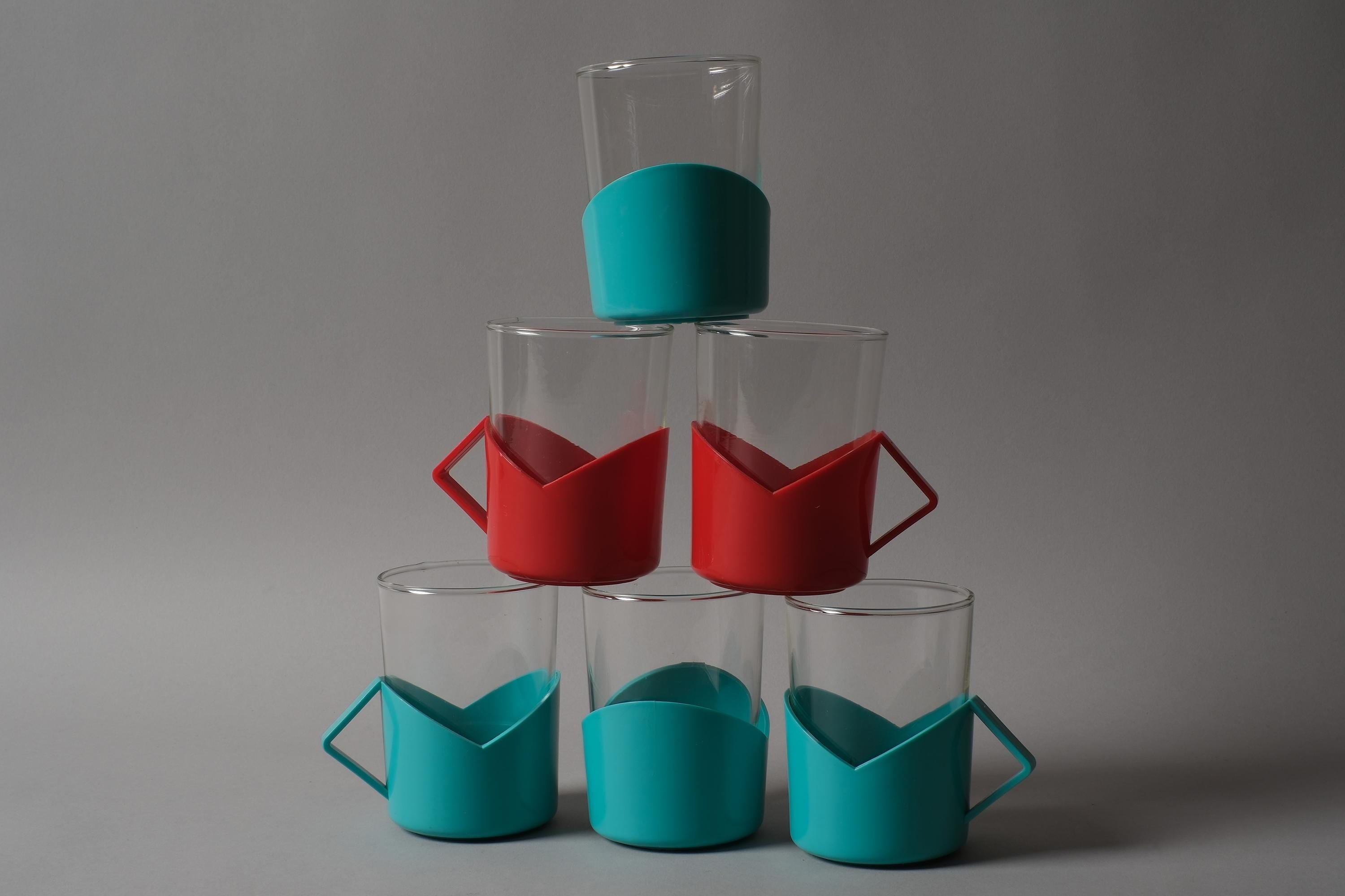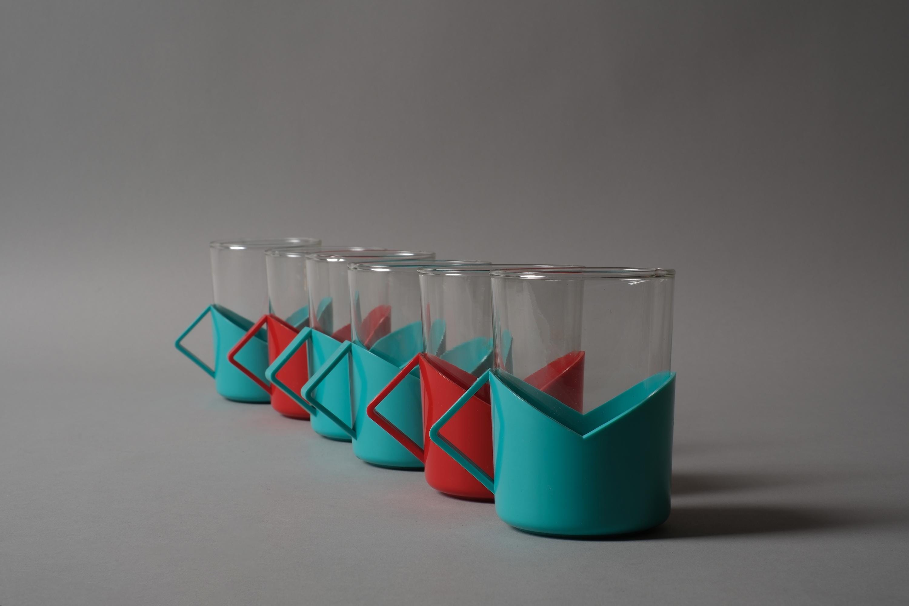 Vintage 1980s set of six glass mugs slotted into bright aqua and red plastic holders by Randwyck, Holland. These sit squarely in an era when postmodernism was reshaping how Europe thought about colour, plastic, and everyday objects. Clear glass cylinders inside moulded plastic sleeves for washing, the handles are a simple triangle. Practical, playful, unmistakably of its decade.
