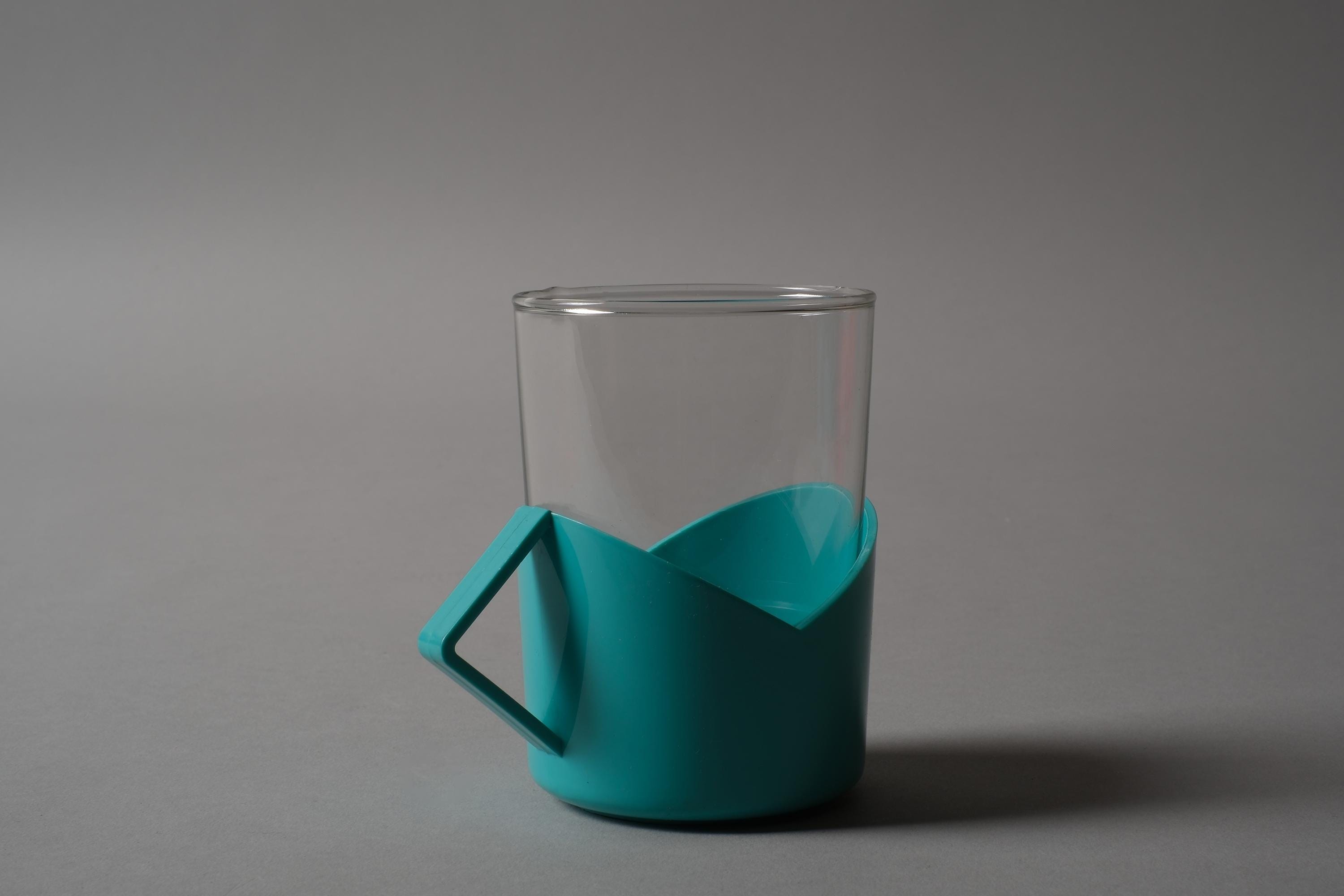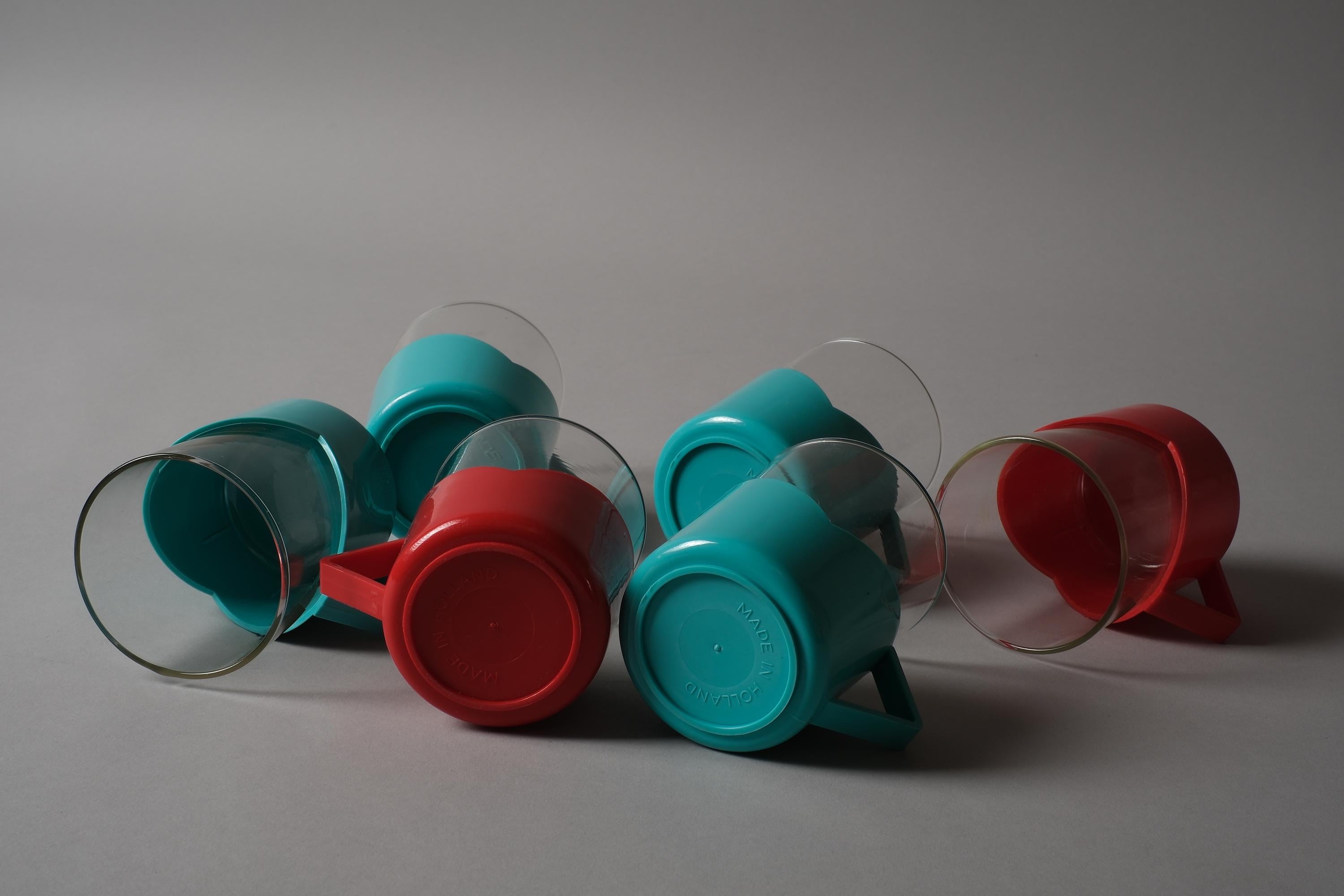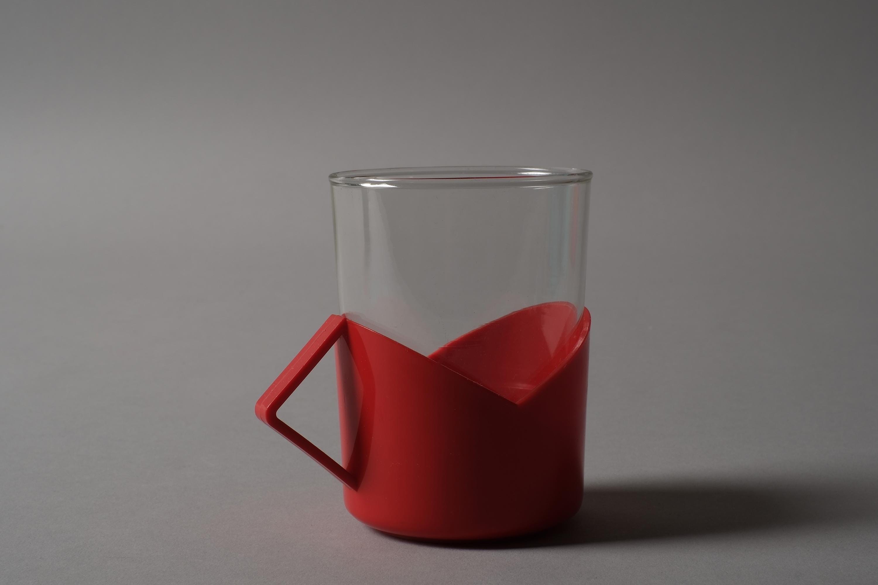 Vintage 1980s set of six glass mugs slotted into bright aqua and red plastic holders by Randwyck, Holland. These sit squarely in an era when postmodernism was reshaping how Europe thought about colour, plastic, and everyday objects. Clear glass cylinders inside moulded plastic sleeves for washing, the handles are a simple triangle. Practical, playful, unmistakably of its decade.