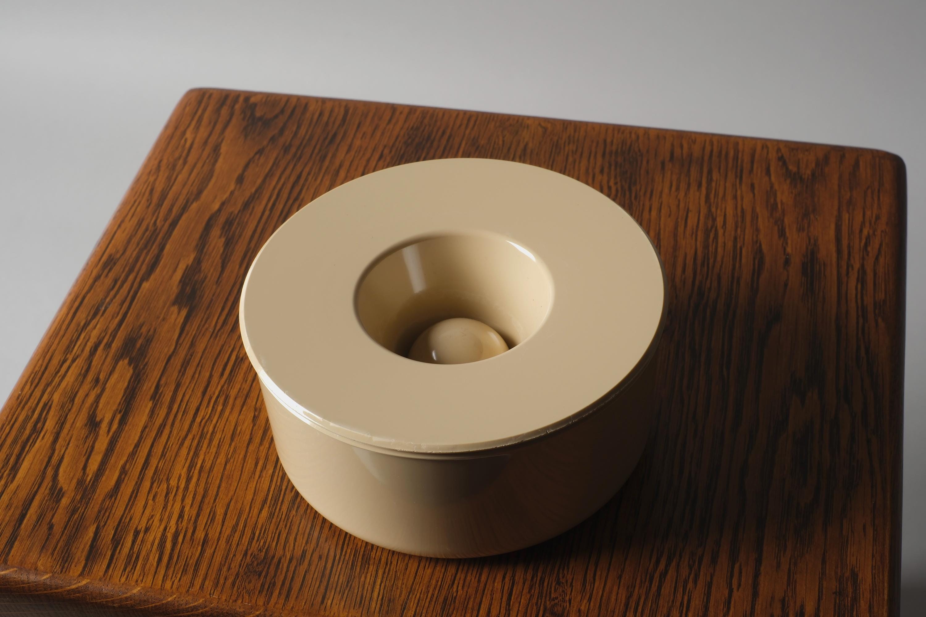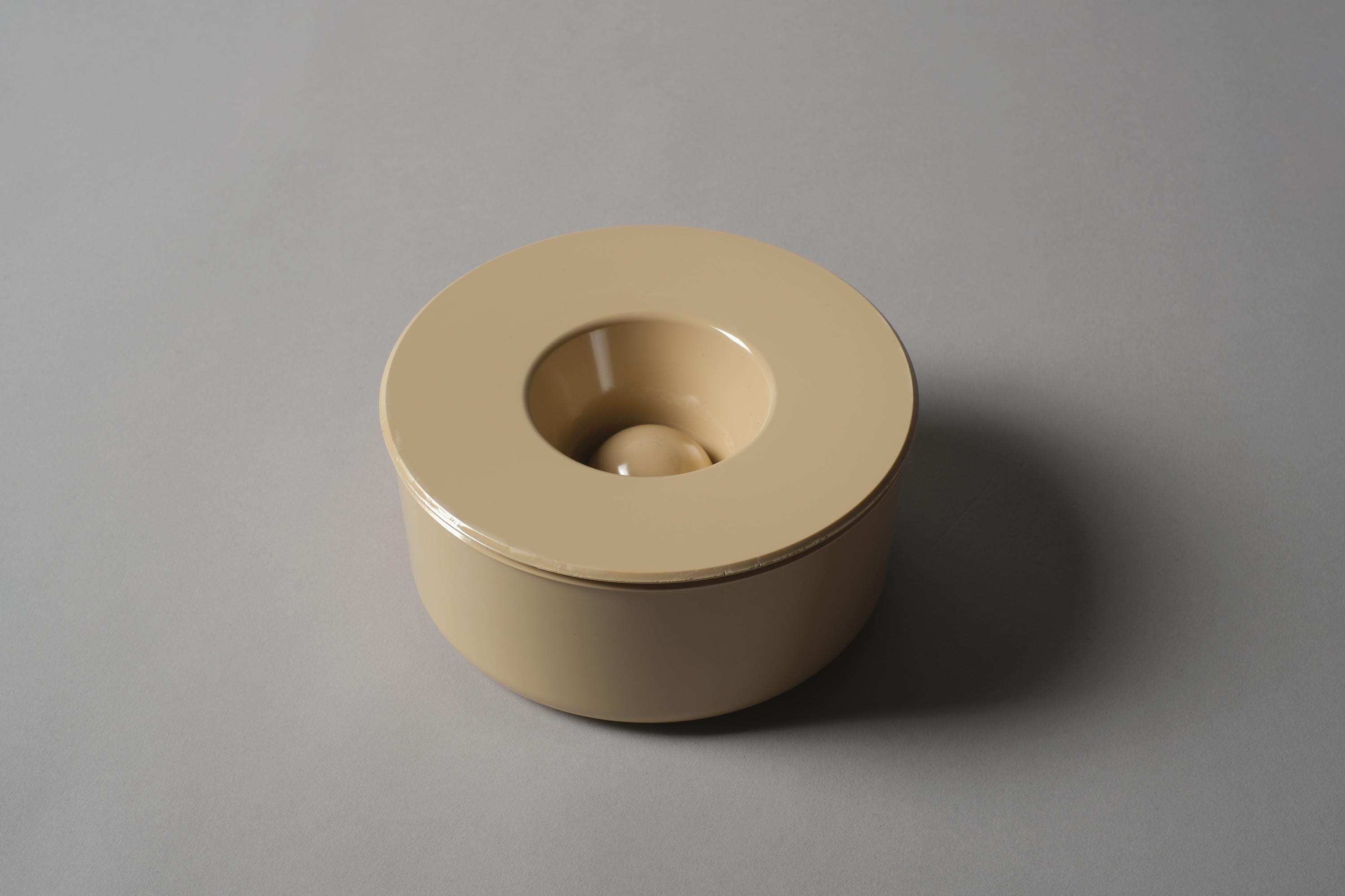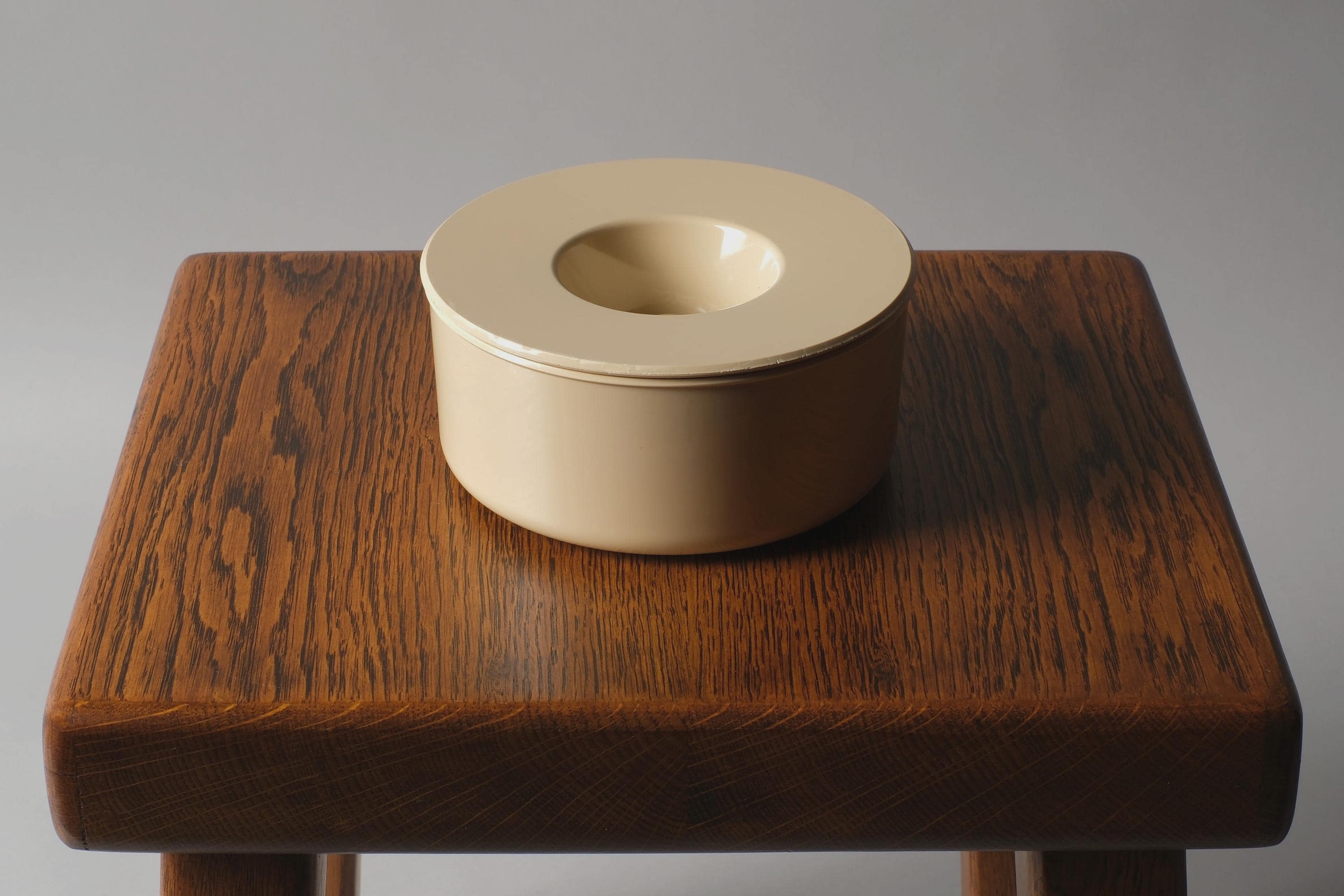 The Kulan, Swedish for "the ball", was designed by Gunnar Larsson for Gustavsberg in 1969 and became one of the defining ashtrays of Scandinavian space age design. A perfect disc with a central cylindrical well, satisfying in the hand, architectural on the table. Produced in both stoneware and melamine; this is the melamine version, lighter in weight and warmer to the touch, in a soft beige colourway. Marked underneath.