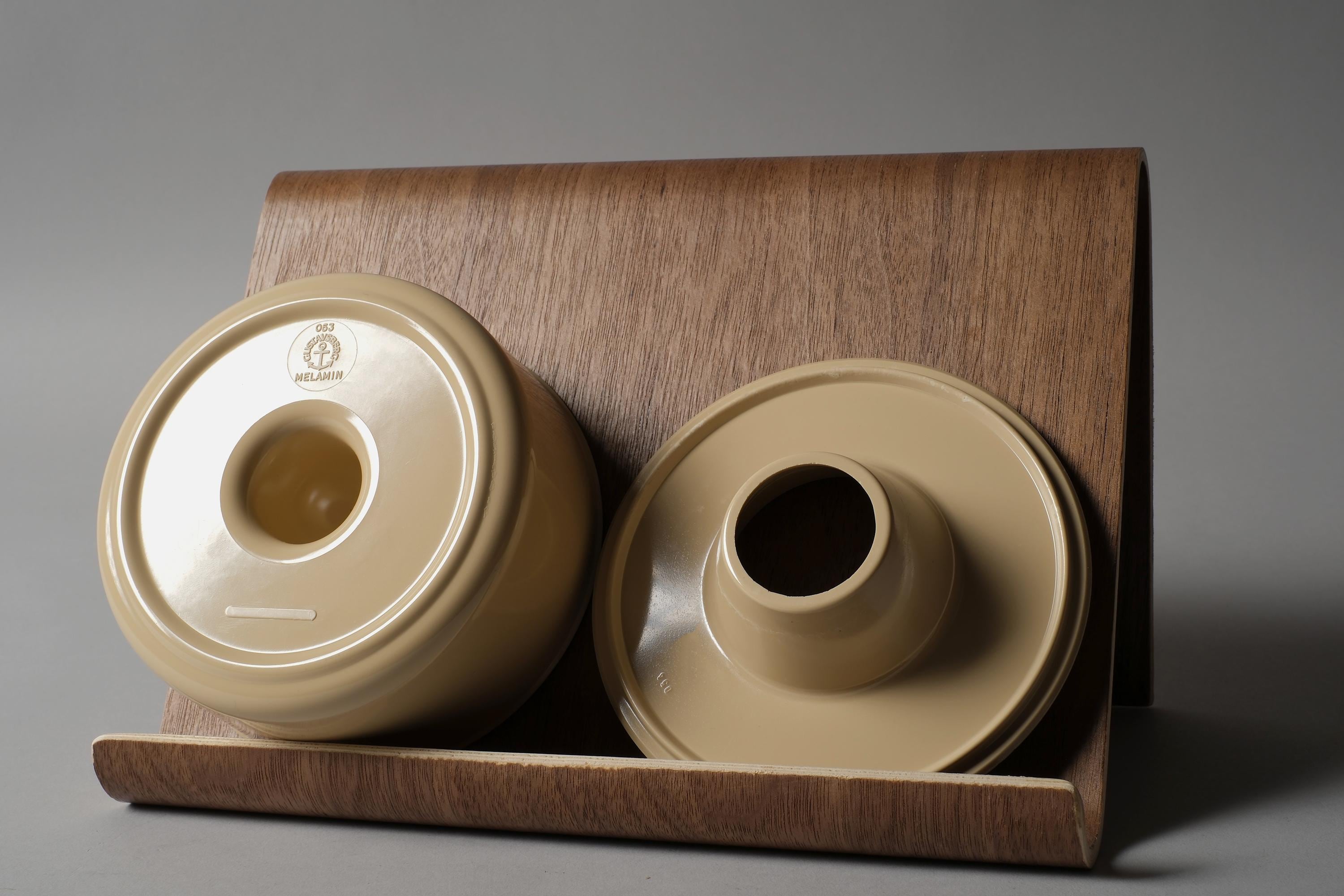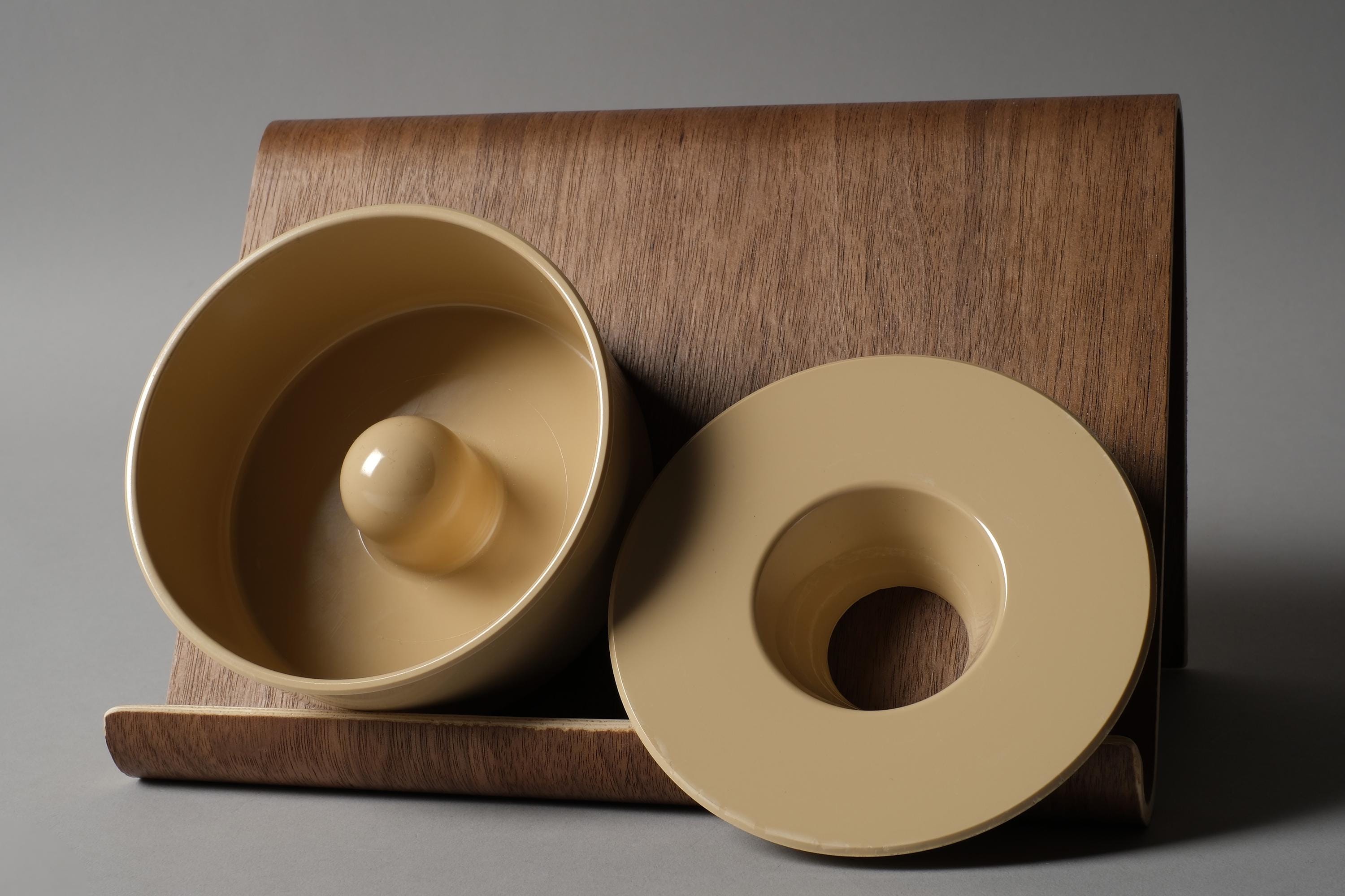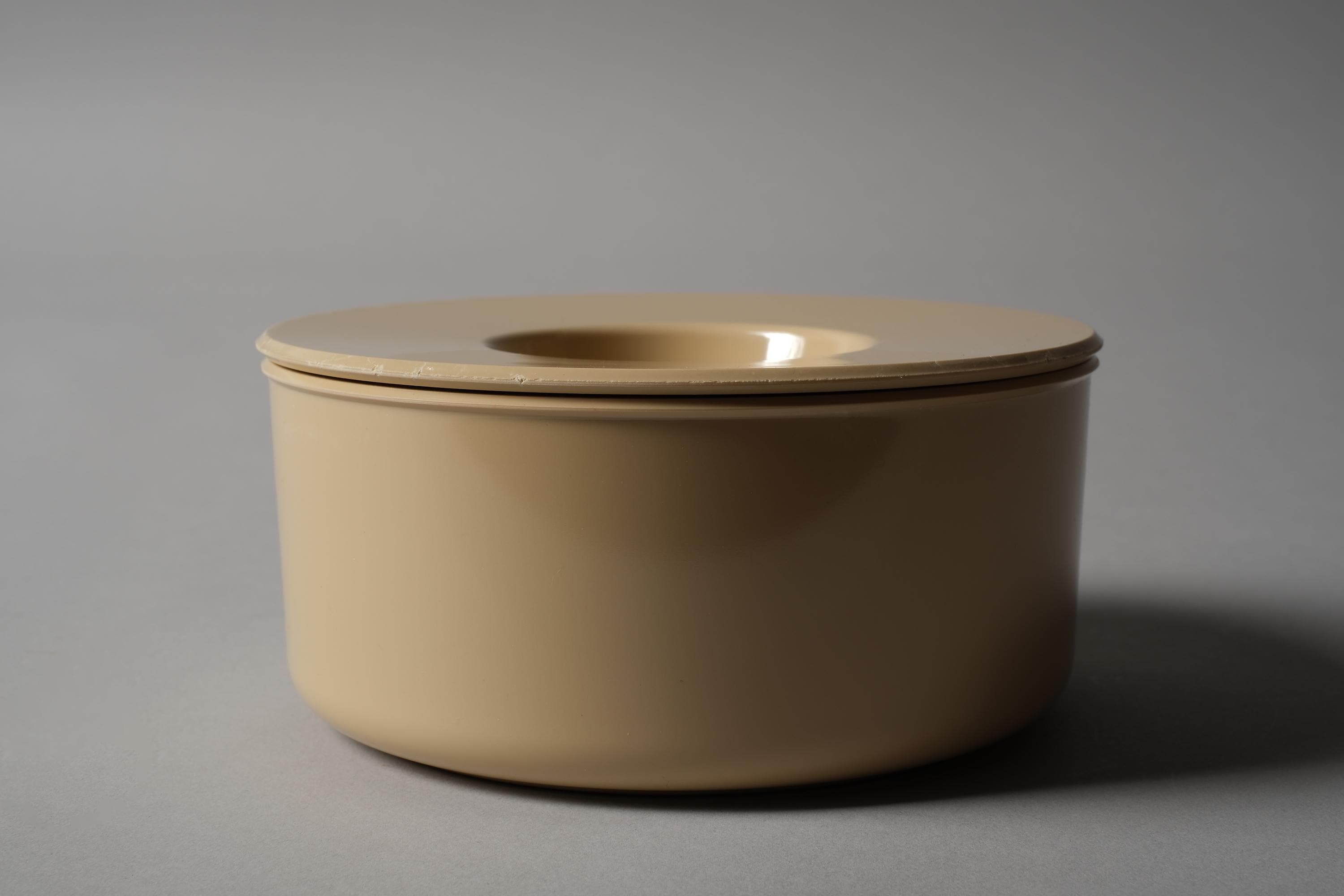 The Kulan, Swedish for "the ball", was designed by Gunnar Larsson for Gustavsberg in 1969 and became one of the defining ashtrays of Scandinavian space age design. A perfect disc with a central cylindrical well, satisfying in the hand, architectural on the table. Produced in both stoneware and melamine; this is the melamine version, lighter in weight and warmer to the touch, in a soft beige colourway. Marked underneath.