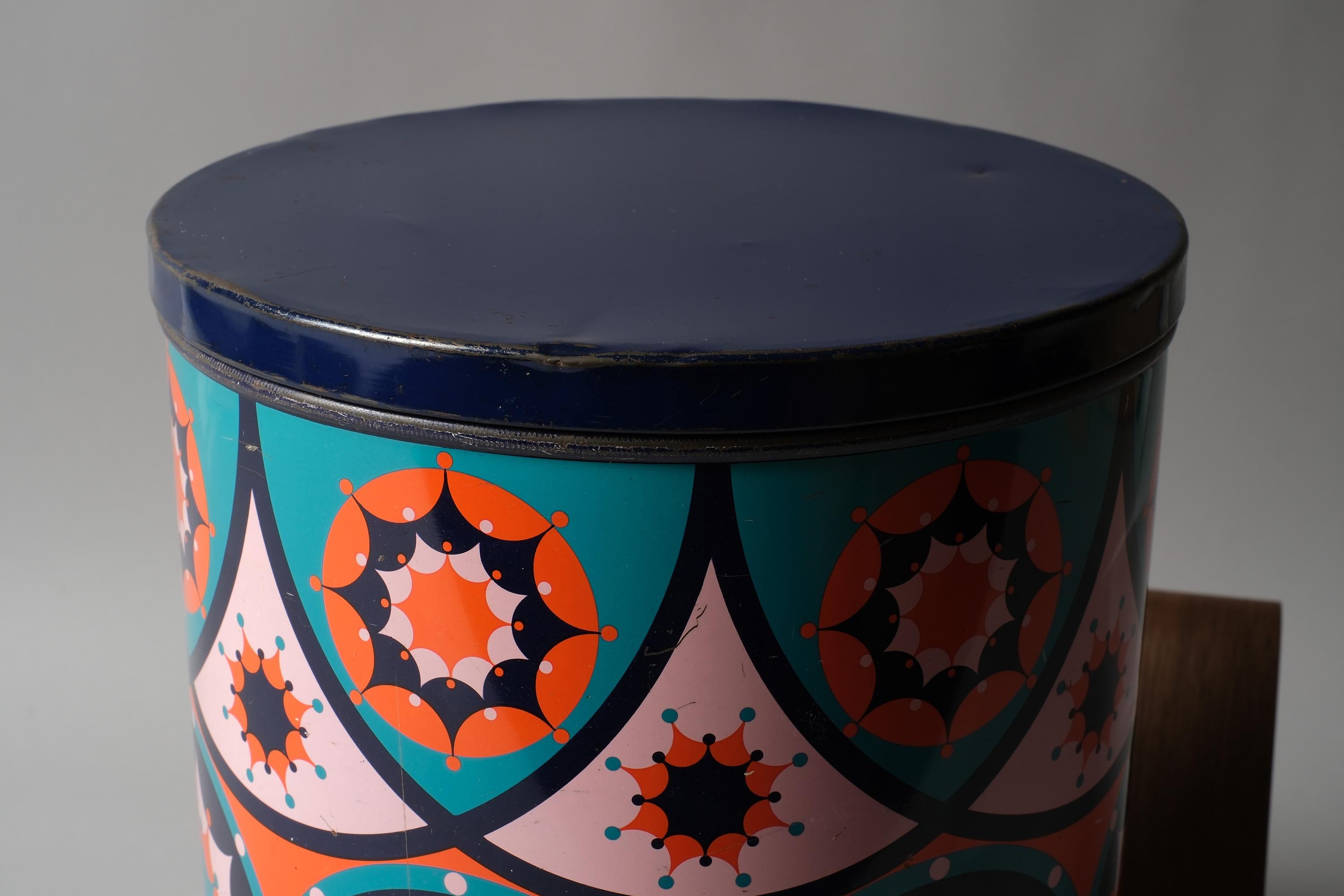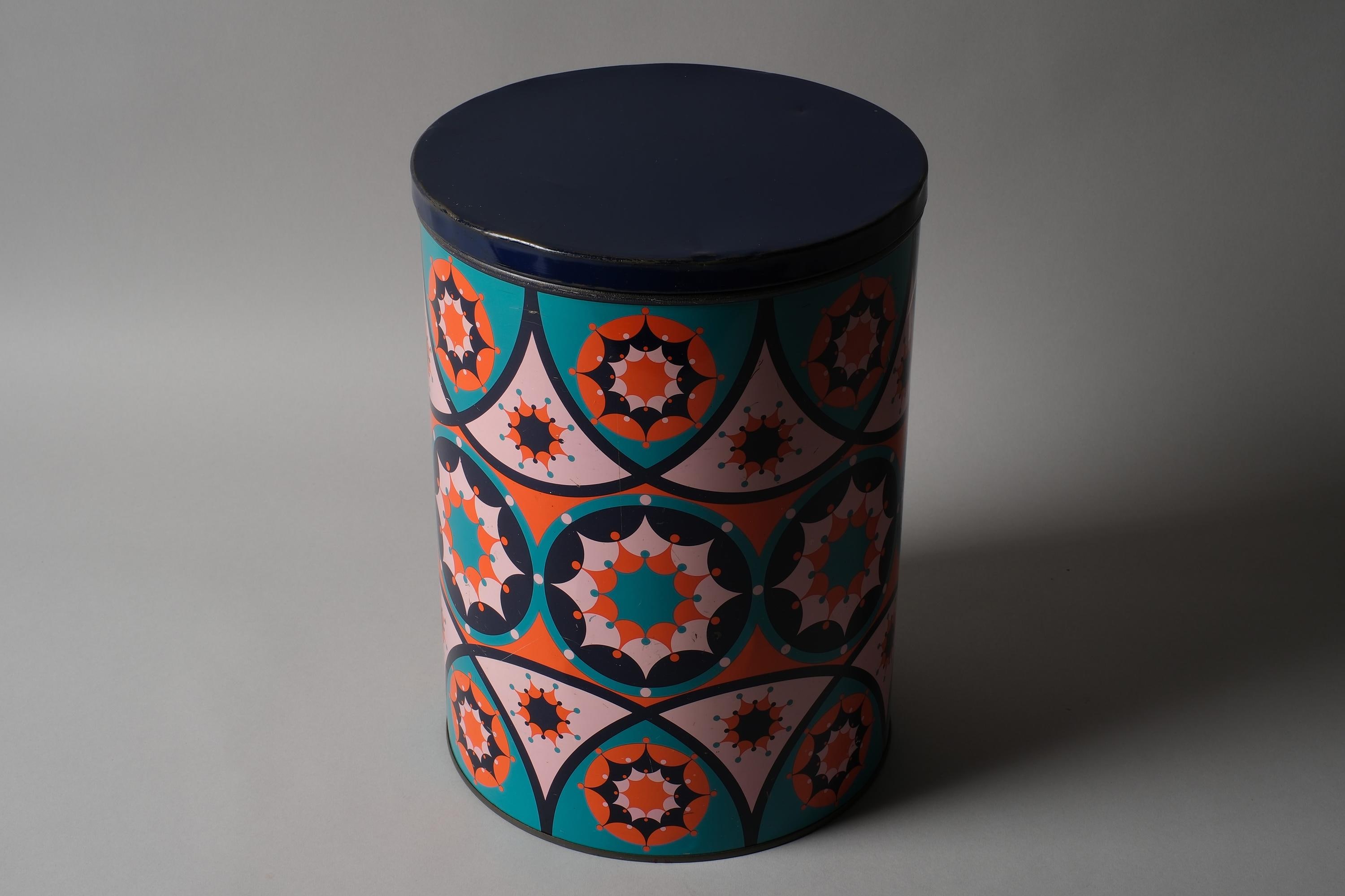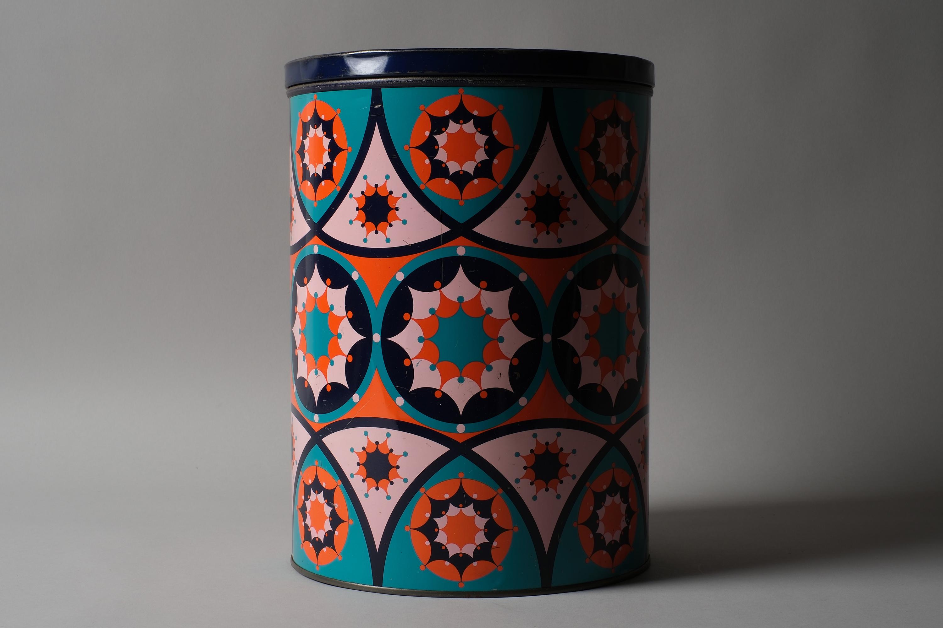 A large tin canister from Tomado Holland, wrapped in a hypnotic geometric pattern of stars and medallions in teal, orange, pink and deep navy. Tomado was one of the defining Dutch domestic manufacturers of the twentieth century, founded in 1923 in Dordrecht, best known for their modular wire shelving systems that furnished Dutch kitchens and hallways, but also produced a wide catalogue of decorated metalware throughout the 1960s and 1970s. Generous 8-litre capacity, tight-fitting lid, brass-toned interior.