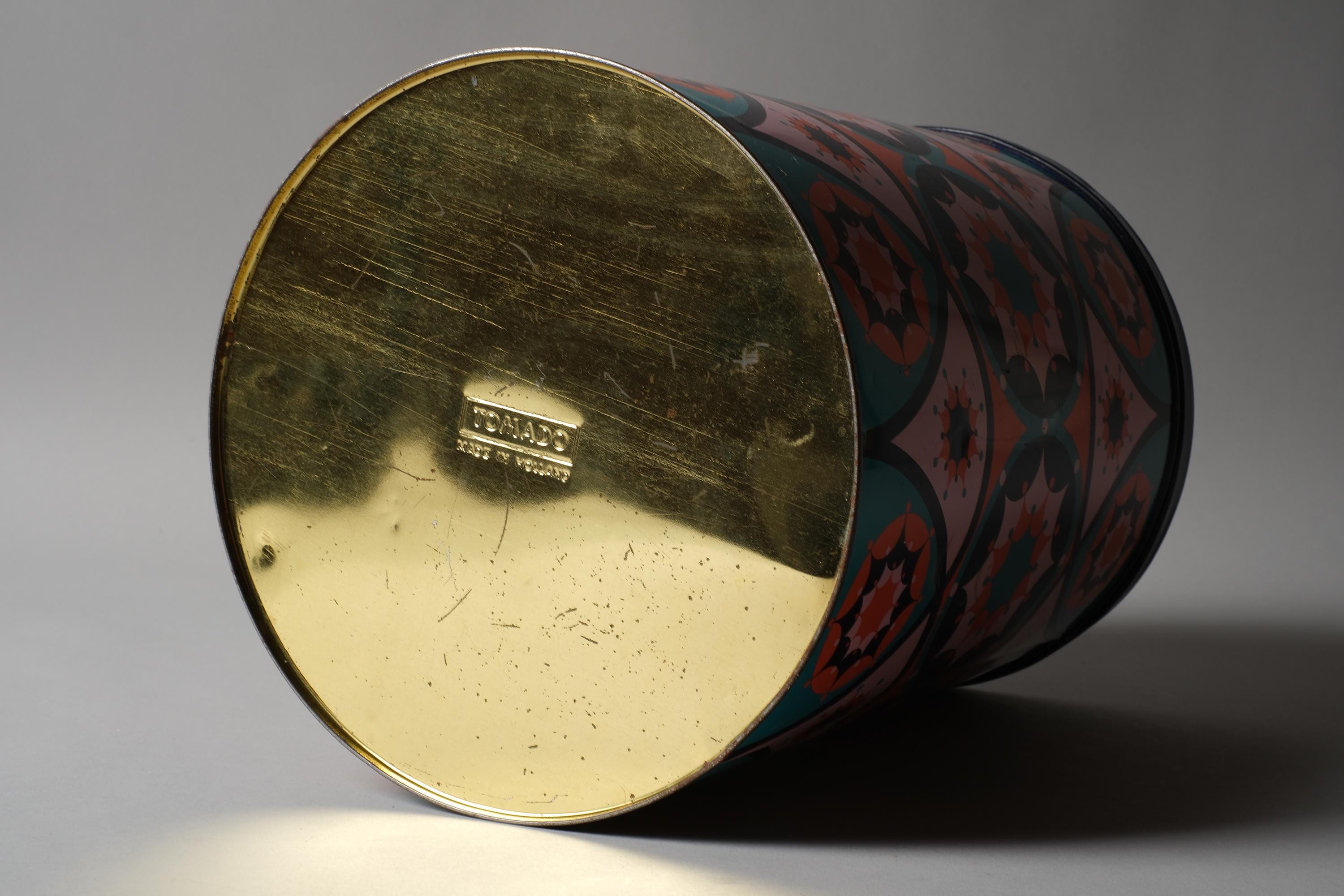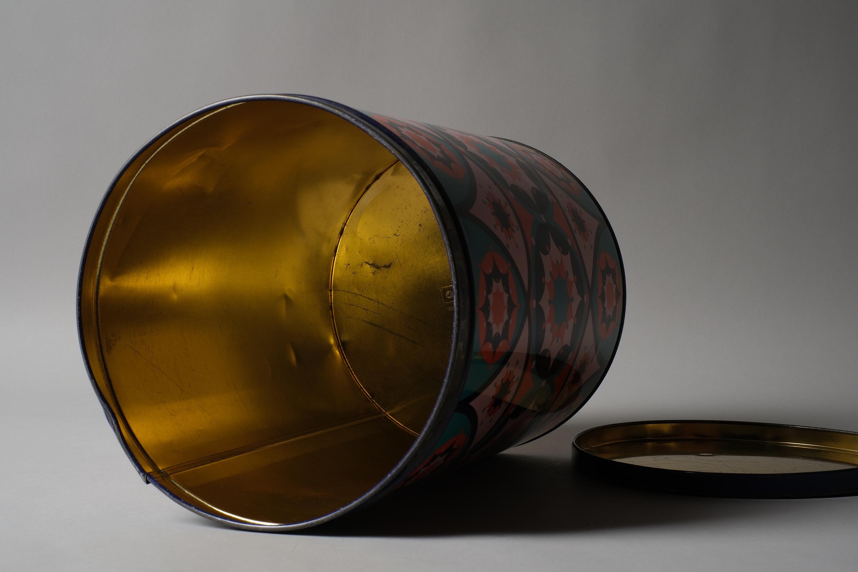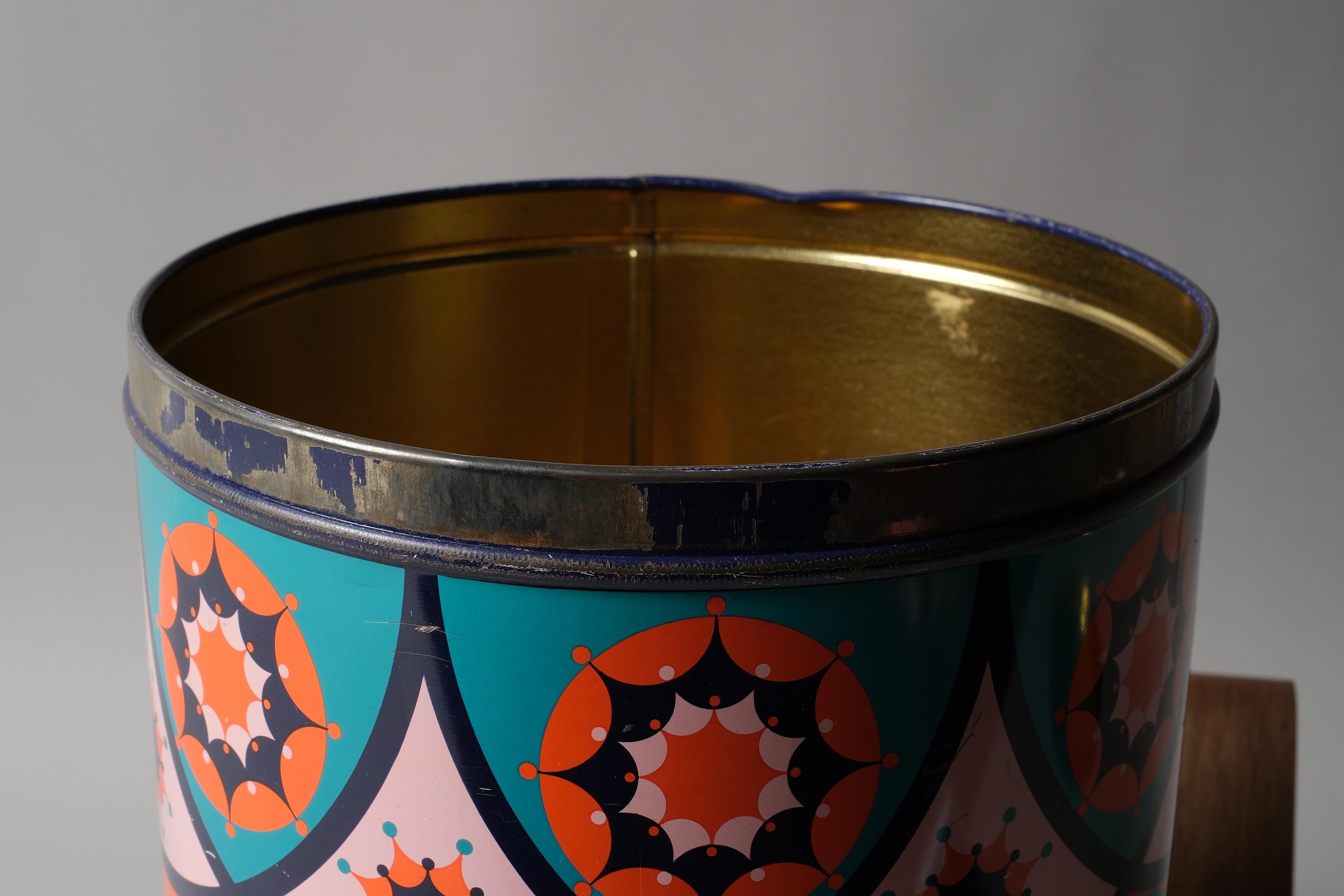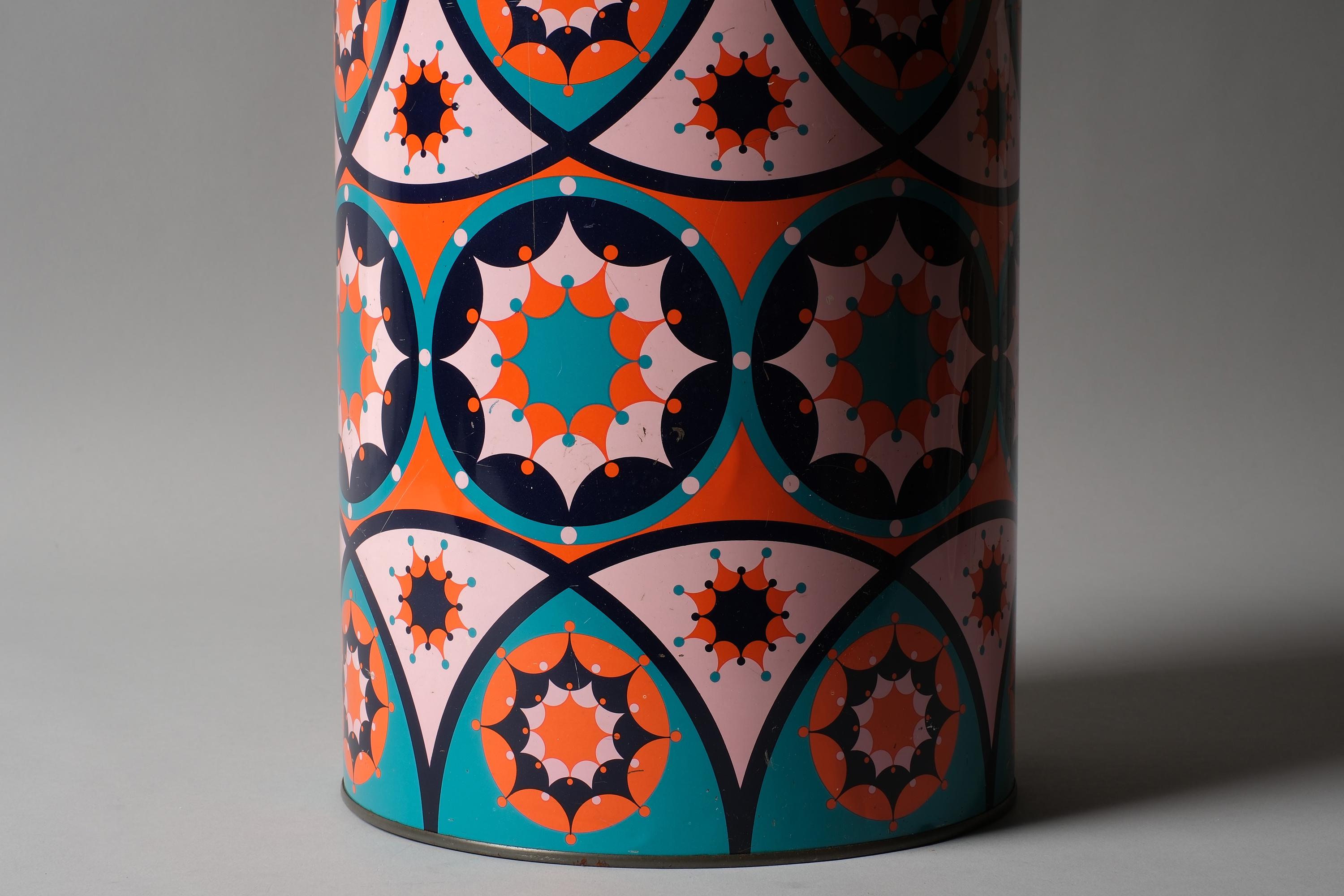 A large tin canister from Tomado Holland, wrapped in a hypnotic geometric pattern of stars and medallions in teal, orange, pink and deep navy. Tomado was one of the defining Dutch domestic manufacturers of the twentieth century, founded in 1923 in Dordrecht, best known for their modular wire shelving systems that furnished Dutch kitchens and hallways, but also produced a wide catalogue of decorated metalware throughout the 1960s and 1970s. Generous 8-litre capacity, tight-fitting lid, brass-toned interior.