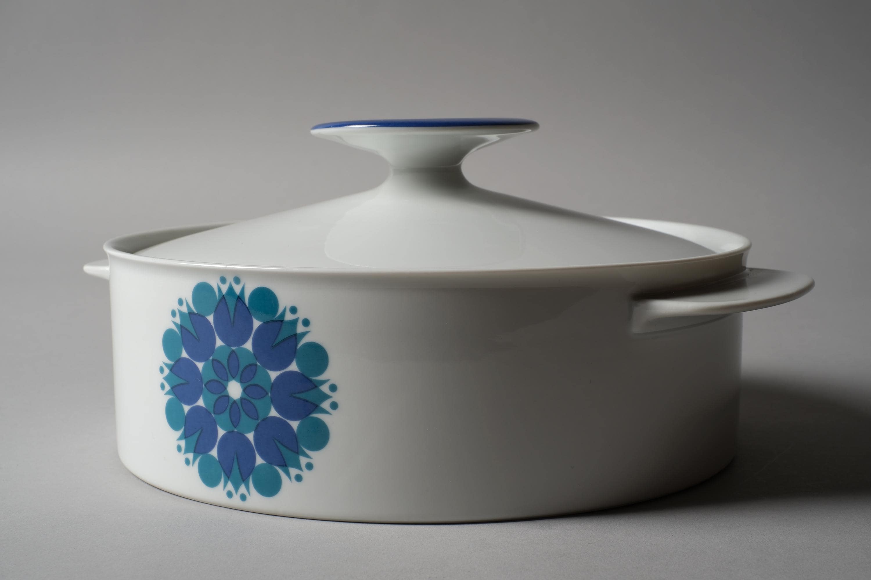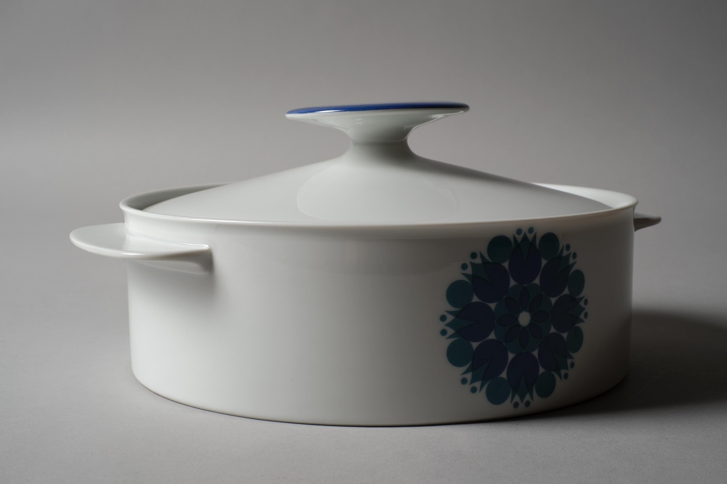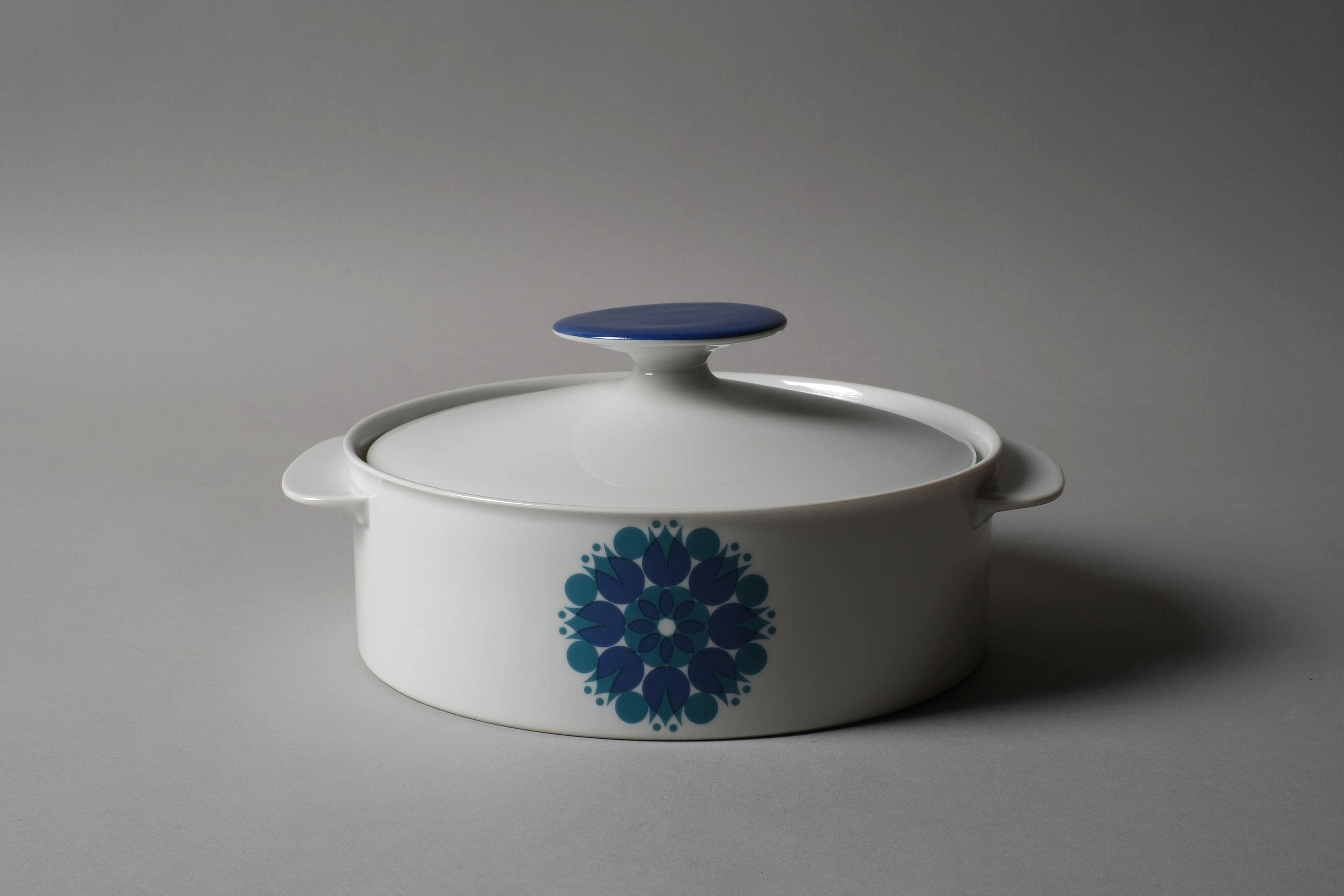 Vintage 1970s porcelain soup tureen, soupière, by Thomas, the modernist arm of Rosenthal, decorated with the Pinwheel pattern, an iconic radiating blue medallion. The profile is low and wide with a gently tapered body, two small lug handles tucked close to the rim and a domed lid topped with a matching blue disc finial. The body is bright white glazed porcelain, cool and heavy in the hand.