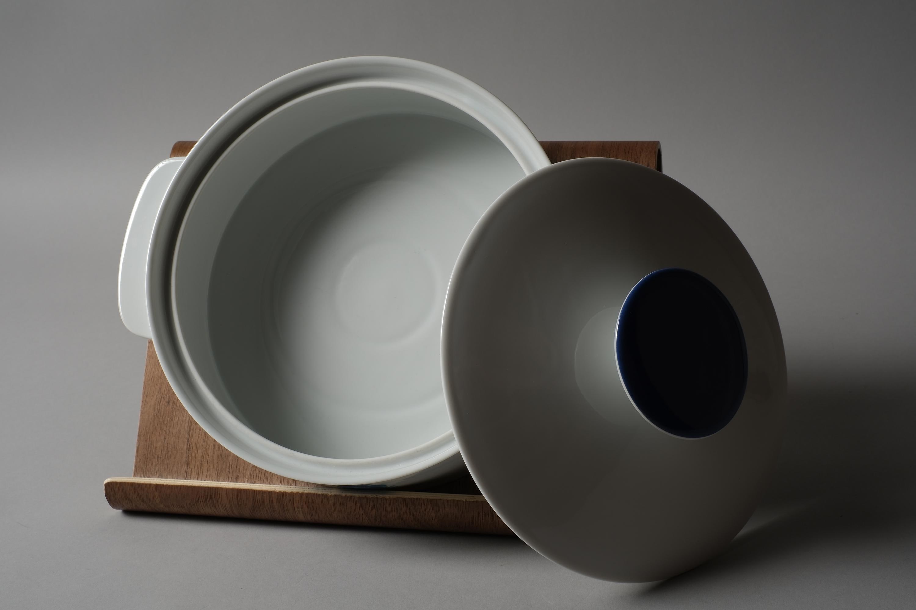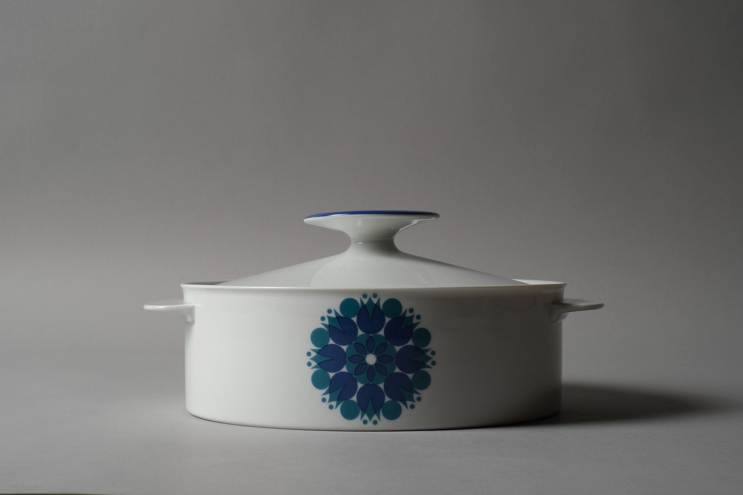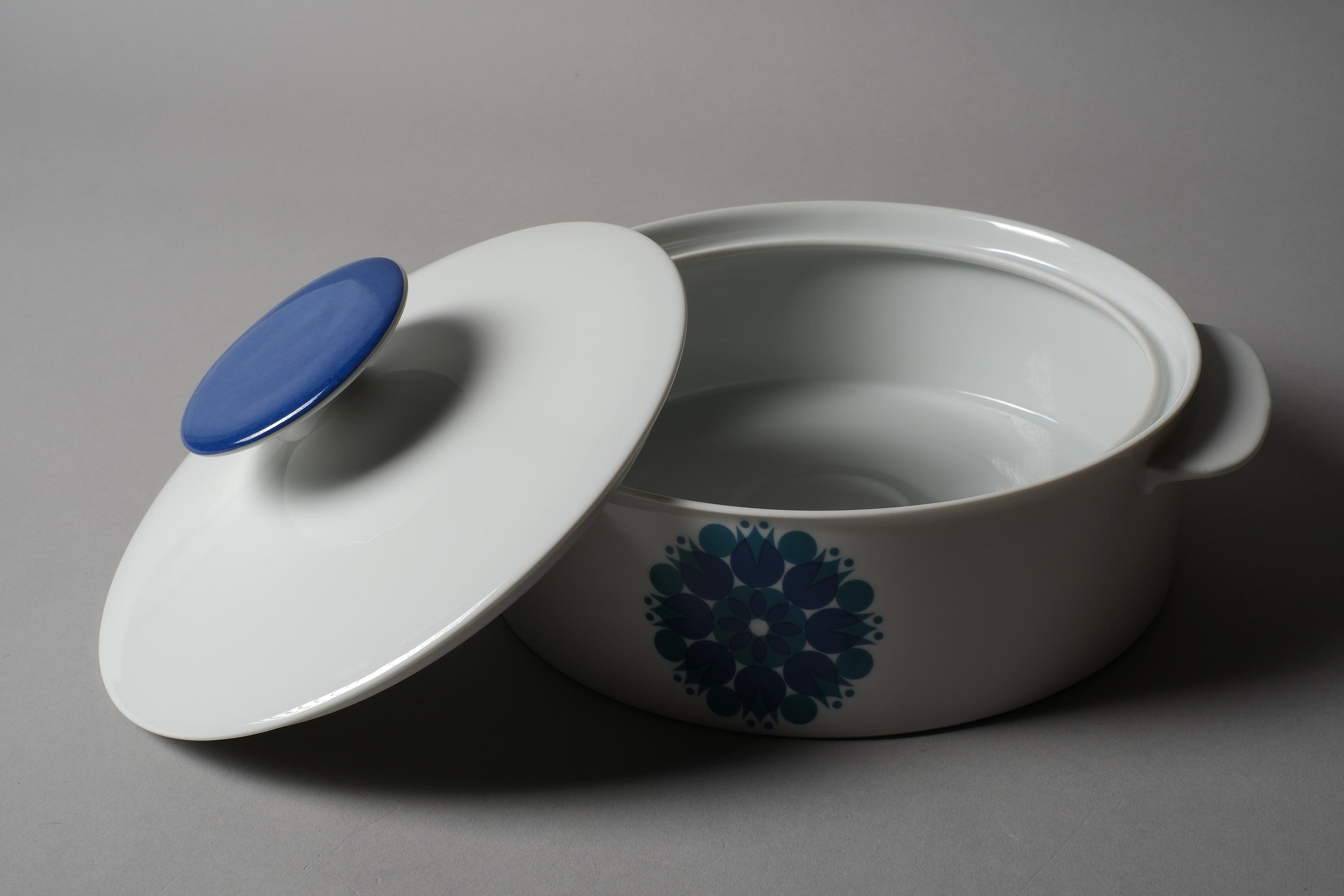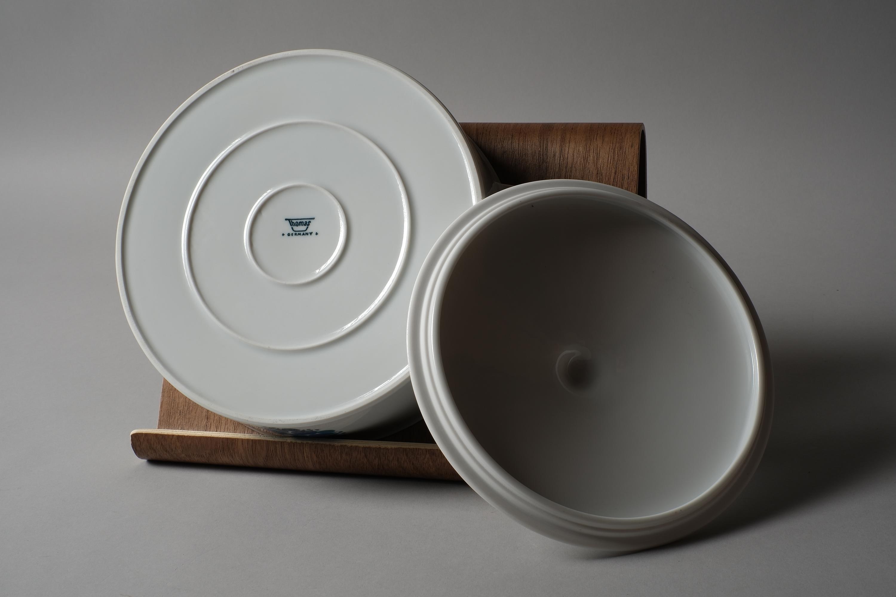 Vintage 1970s porcelain soup tureen, soupière, by Thomas, the modernist arm of Rosenthal, decorated with the Pinwheel pattern, an iconic radiating blue medallion. The profile is low and wide with a gently tapered body, two small lug handles tucked close to the rim and a domed lid topped with a matching blue disc finial. The body is bright white glazed porcelain, cool and heavy in the hand.