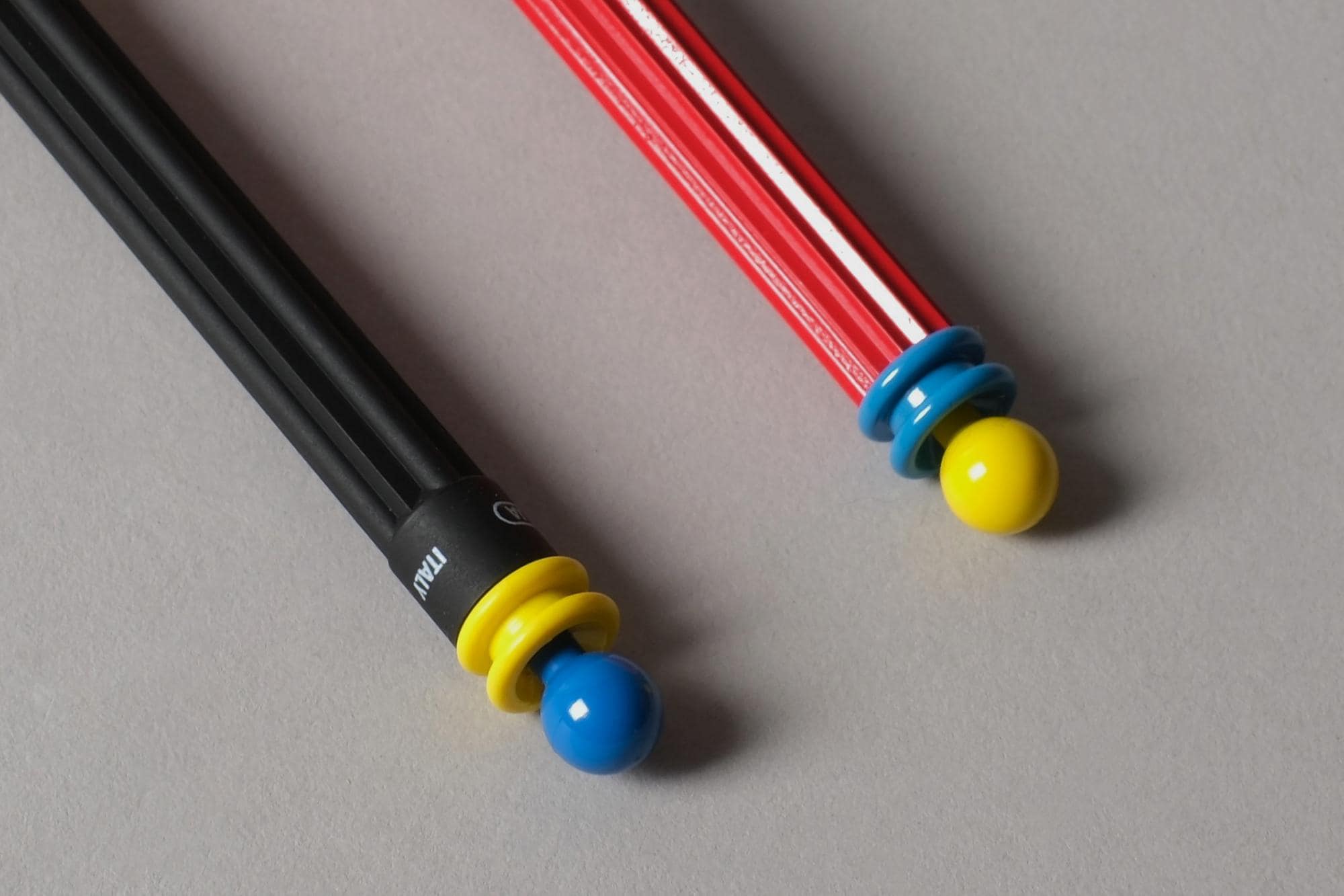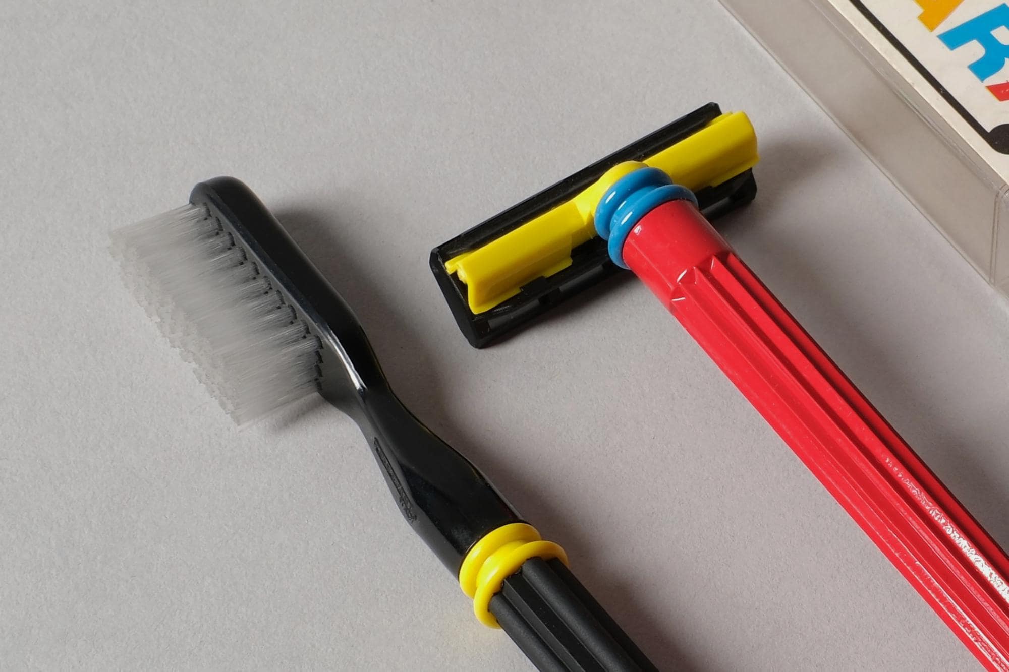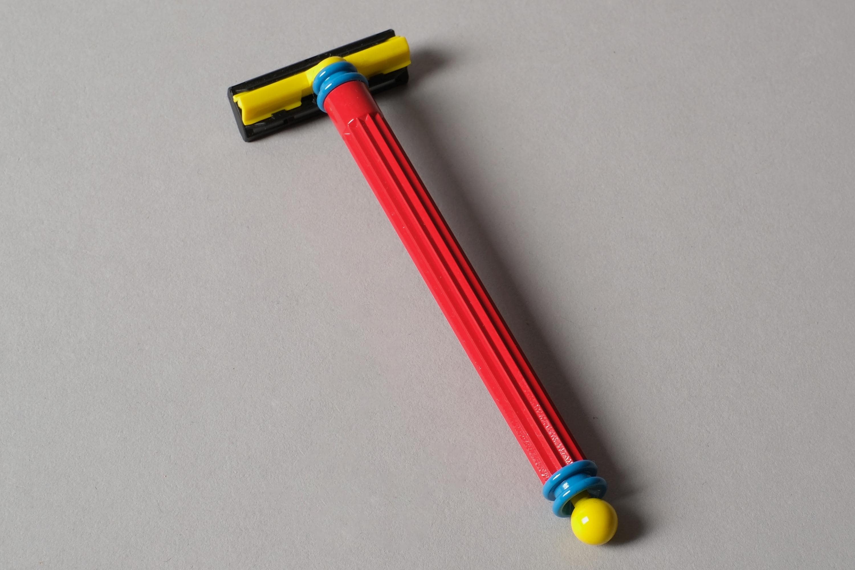Red tubular bodies, black heads, yellow and blue ball-jointed accents at the tips: the Bauhaus primary palette filtered through 1980s Italian irony. New old stock, never used, box included for the toothbrush, razor is new without box.