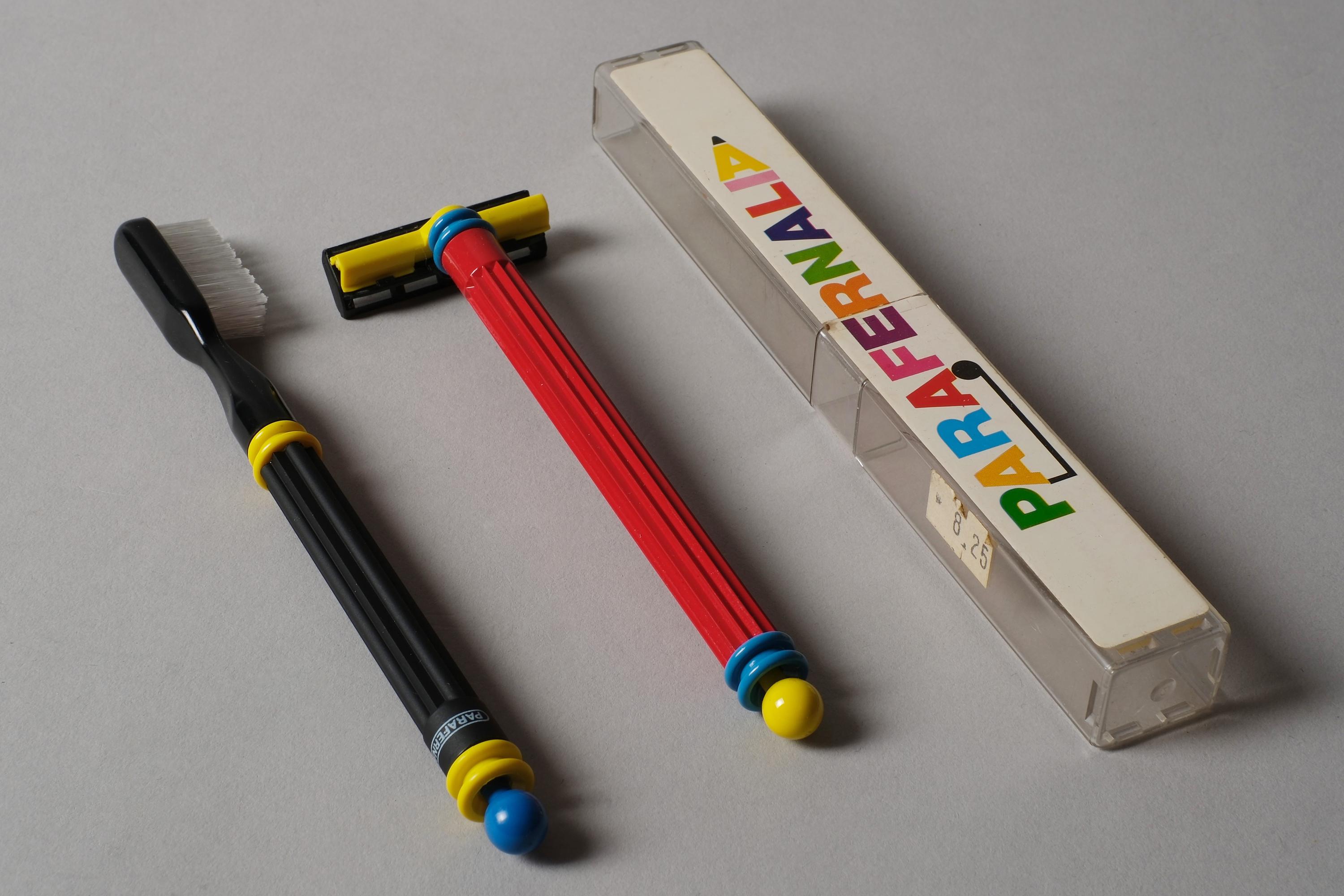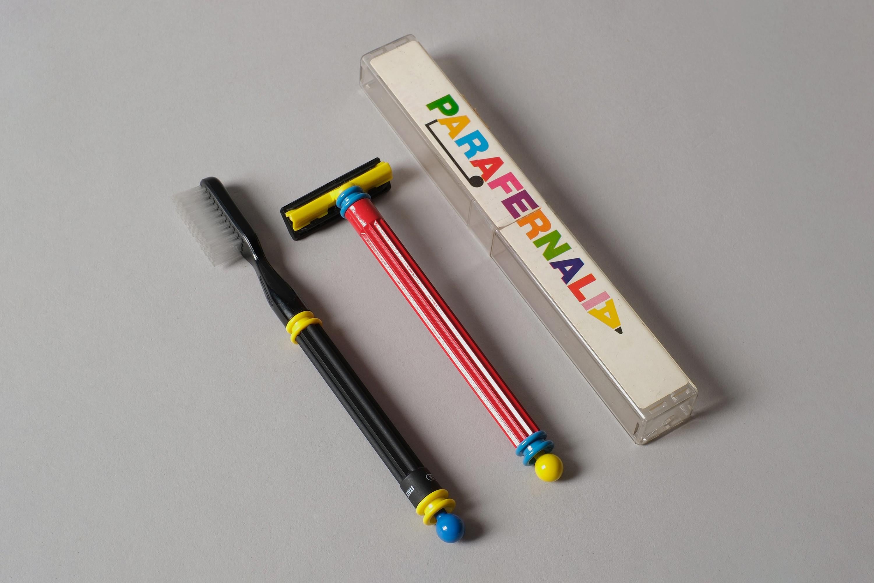 A brand new, unused toothbrush and shaving razor by Parafernalia, Italy, still in their original packaging. Parafernalia operated in the Memphis Milano orbit of the 1980s, applying the movement's primary colour language and geometric rigour to everyday objects like pens, rulers, and bathroom accessories turning the mundane into manifesto.
