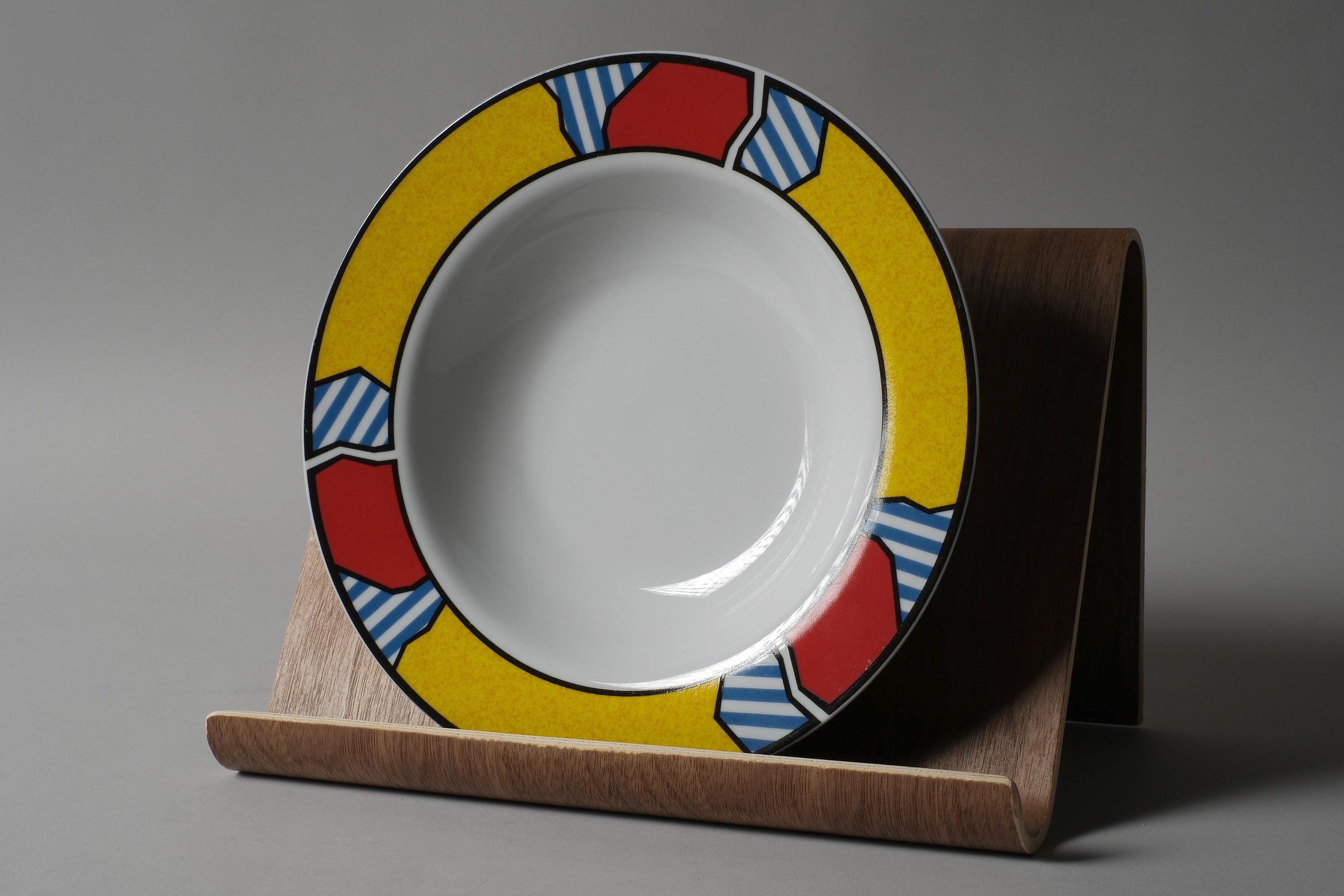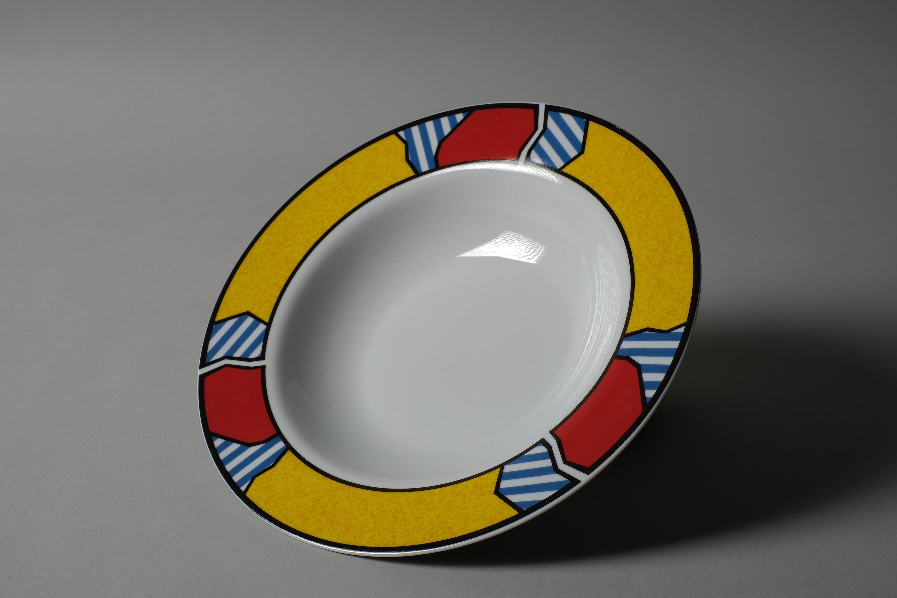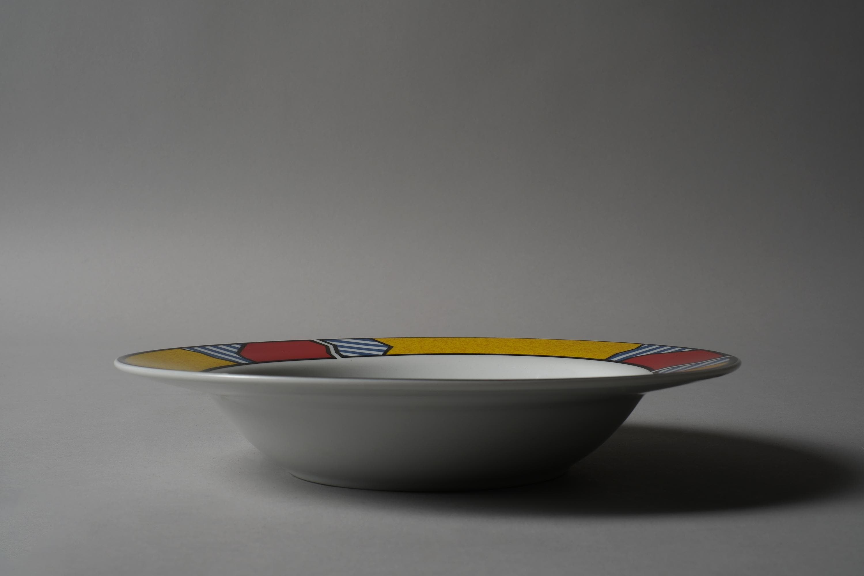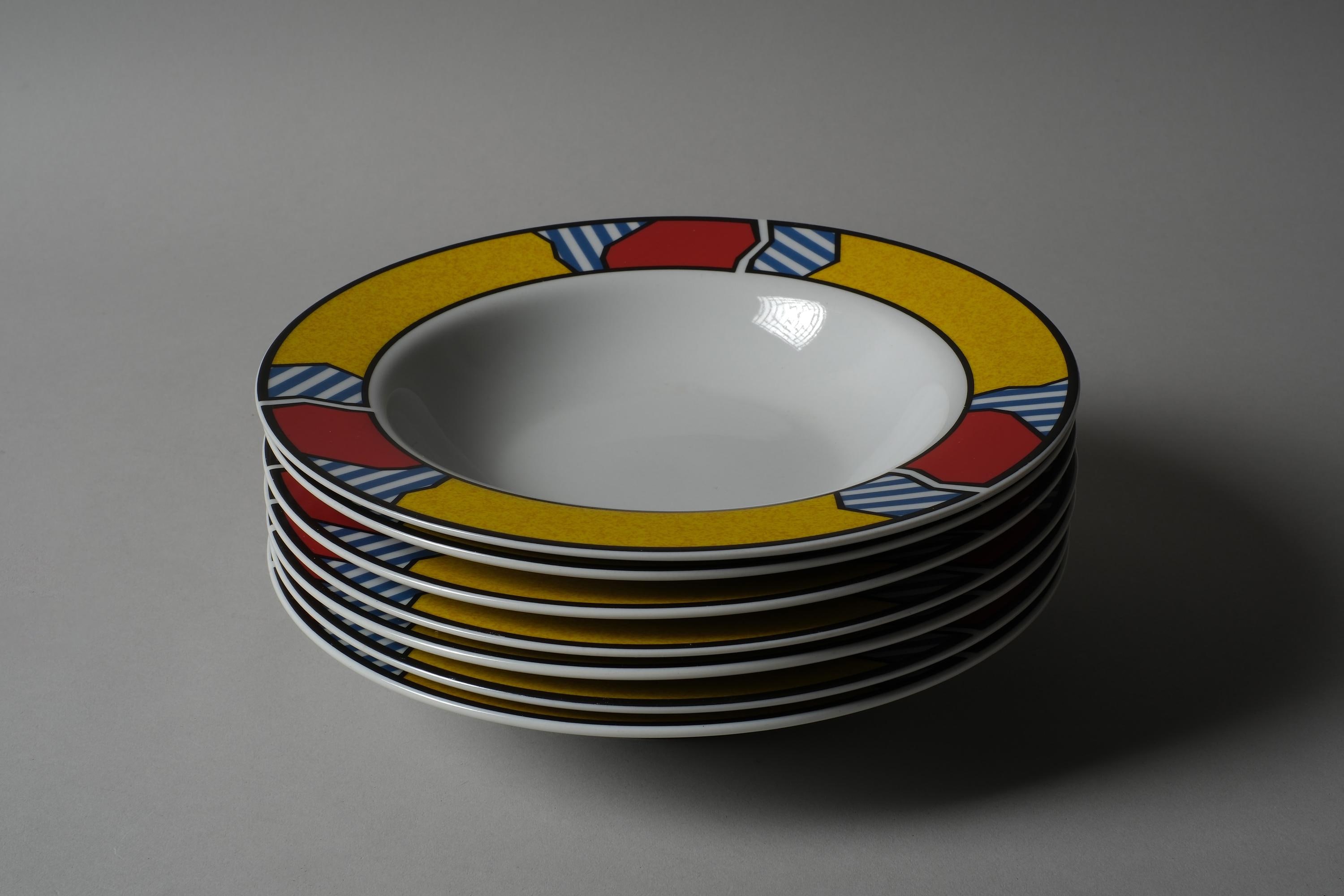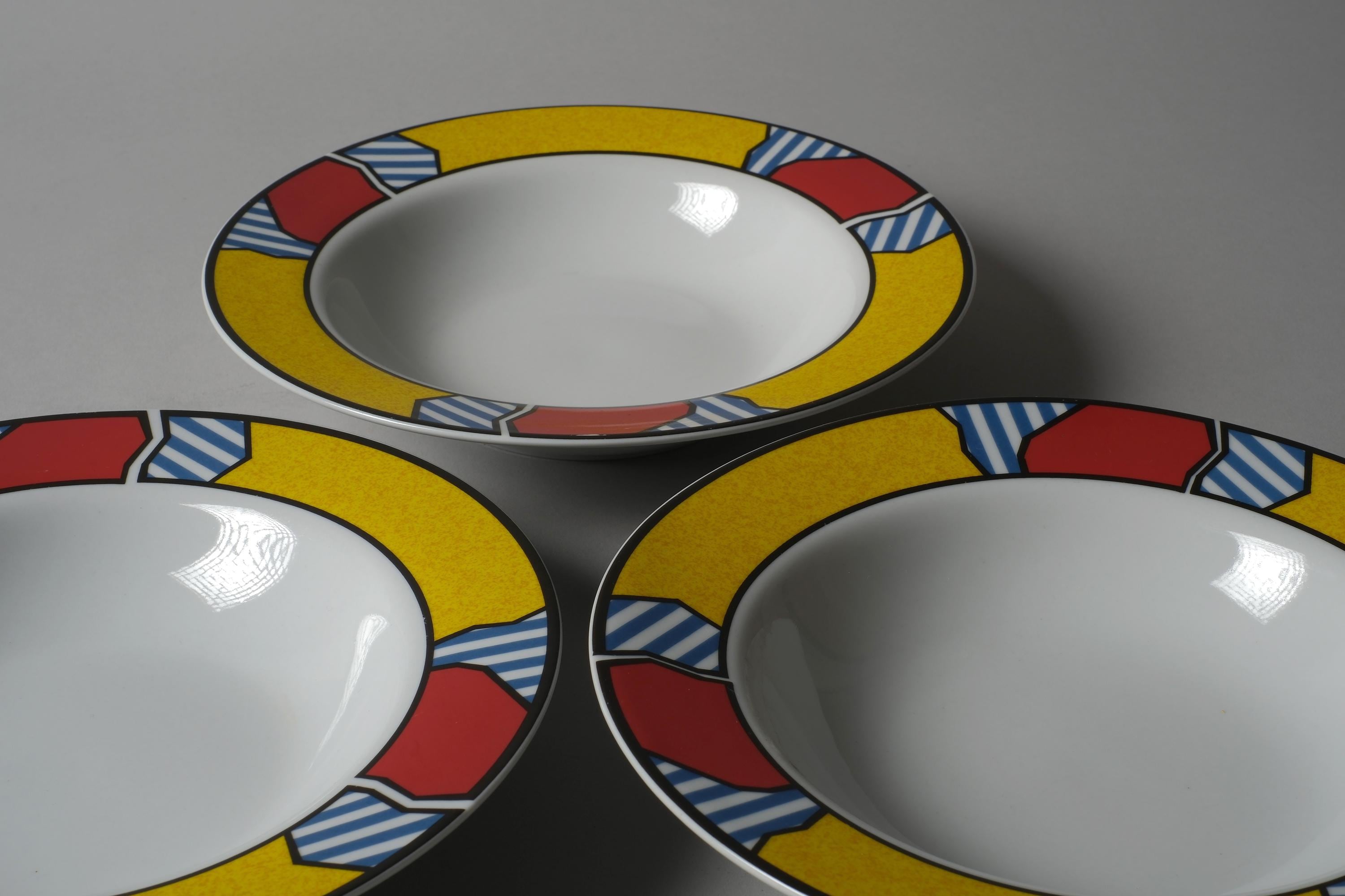 Vintage 1980s set of seven porcelain soup or pasta plates by Studio Concept. The plates have a wide yellow band that runs the full rim, broken by red rectangular blocks and blue diagonal brushstroke motifs which is a Memphis-influenced decorative pattern applied to ultra-fine porcelain. Deep bowl profile, clean white interior. Oven, dishwasher and microwave safe per the backstamp.