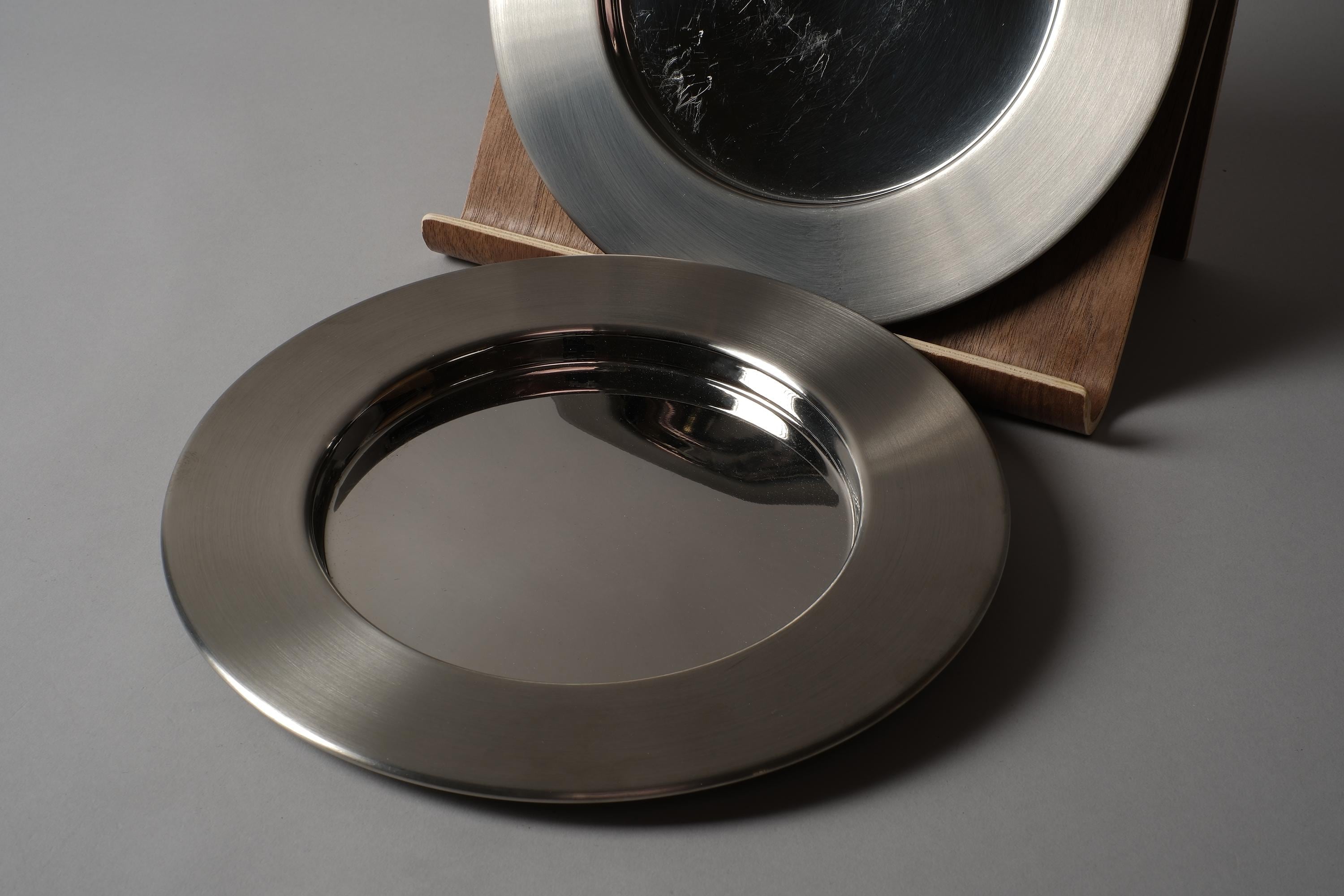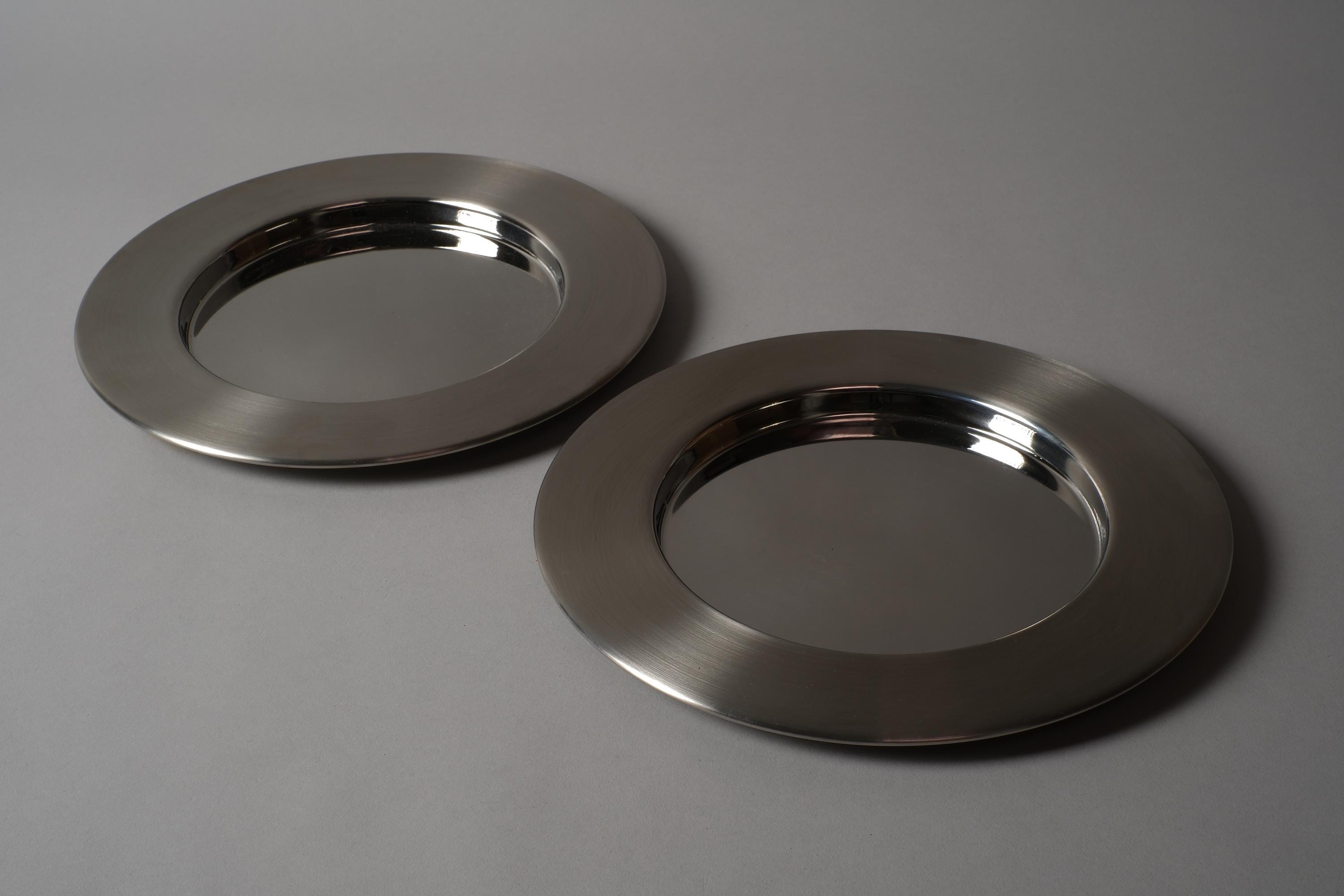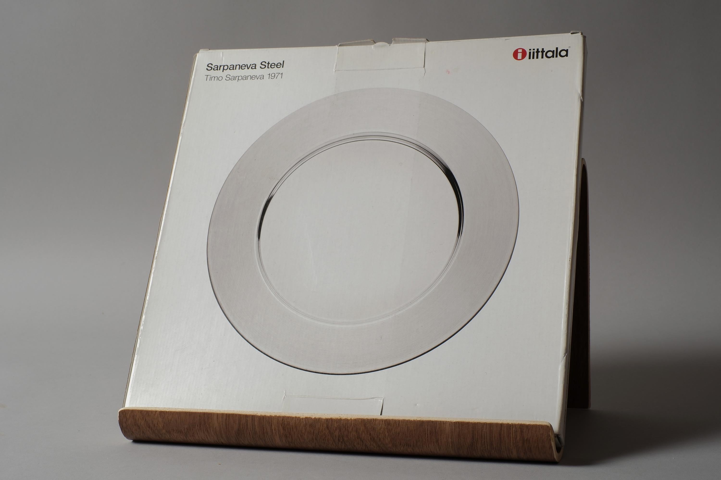 Pair of stainless steel serving platters, Sarpaneva collection, designed by Timo Sarpaneva for Iittala, Finland, 1971. A wide brushed steel rim surrounds a polished recessed centre. The contrast between matt and mirror finish is the only decoration. Minimal, precise, functional. Both original boxes present. Surface scratches to the polished centre consistent with age and use.