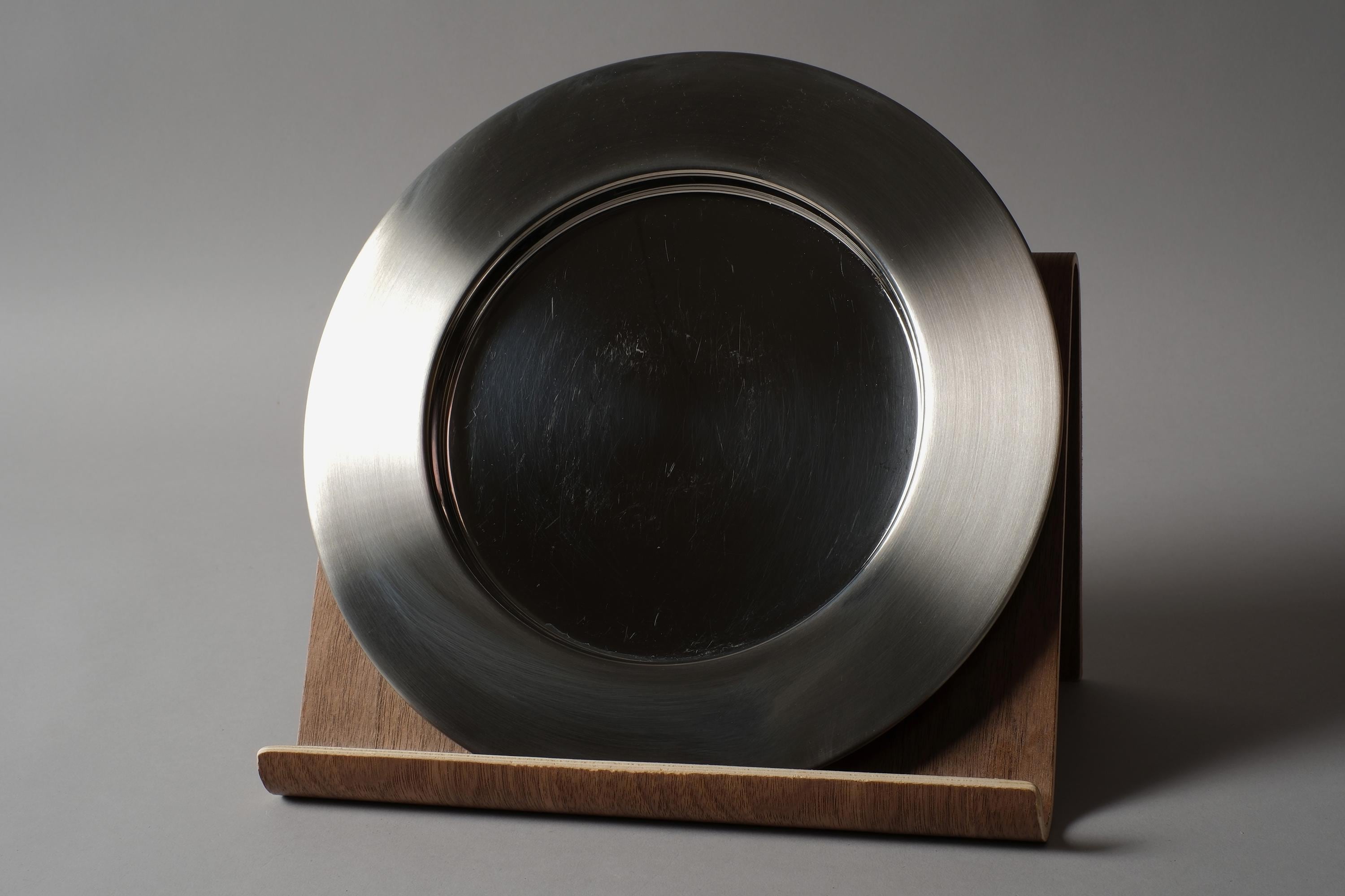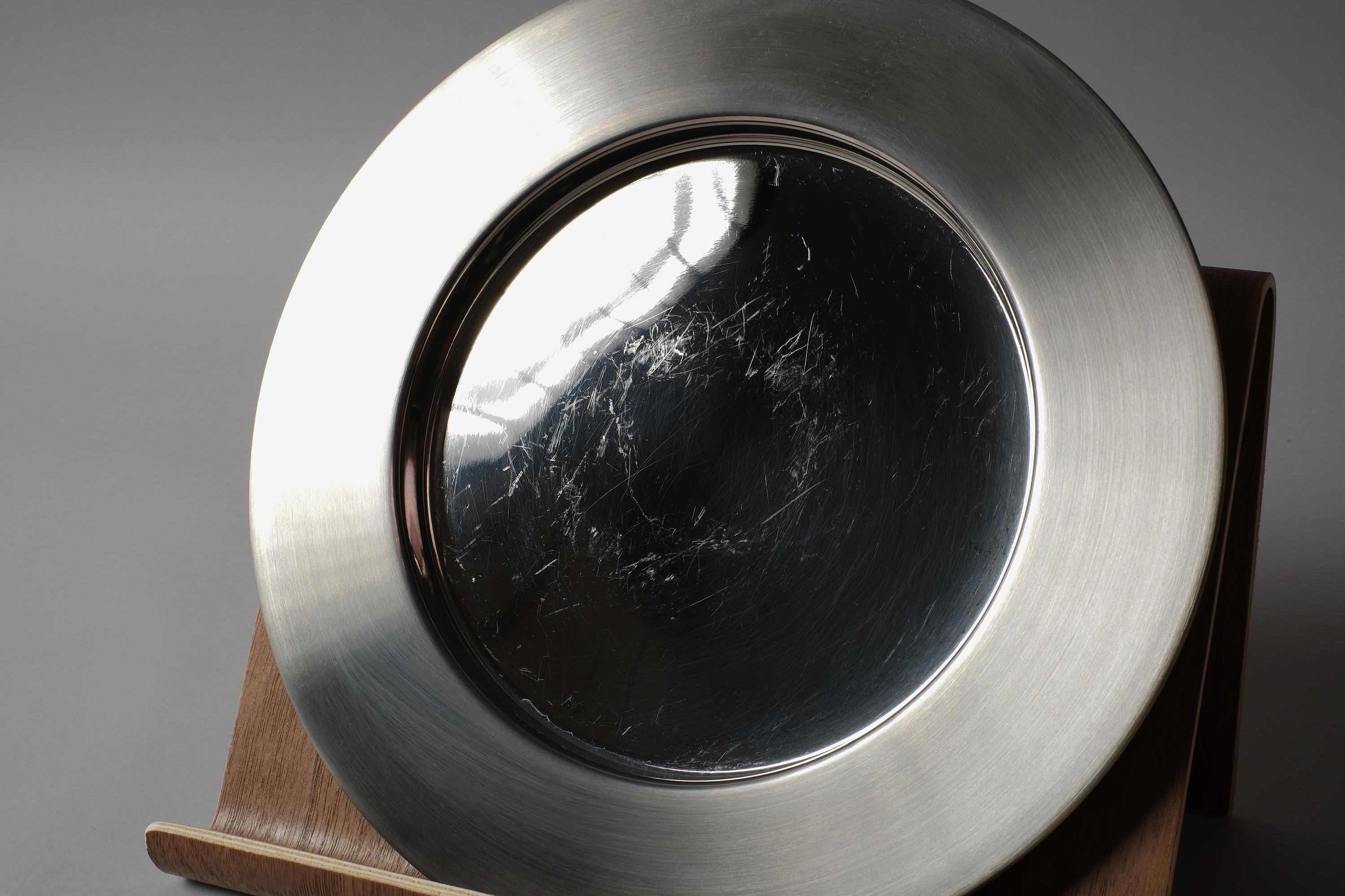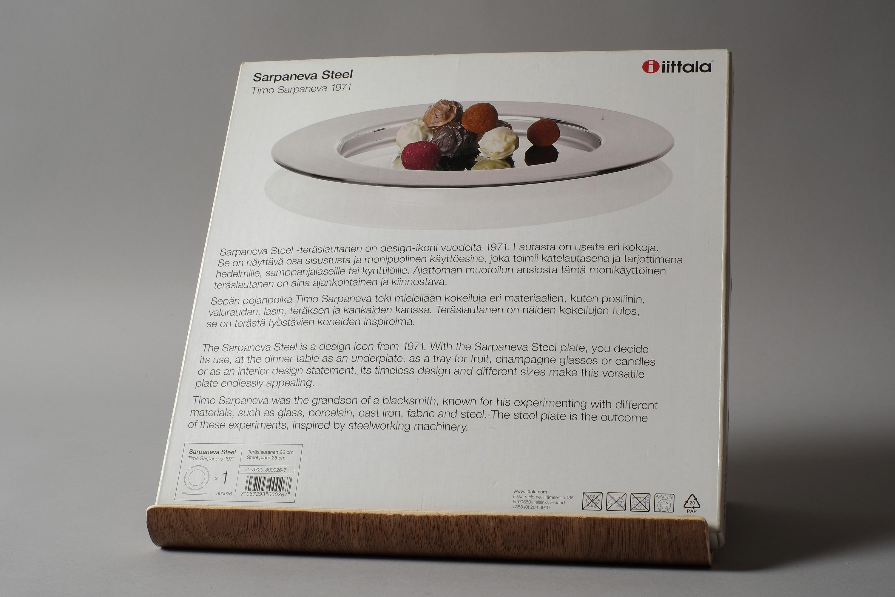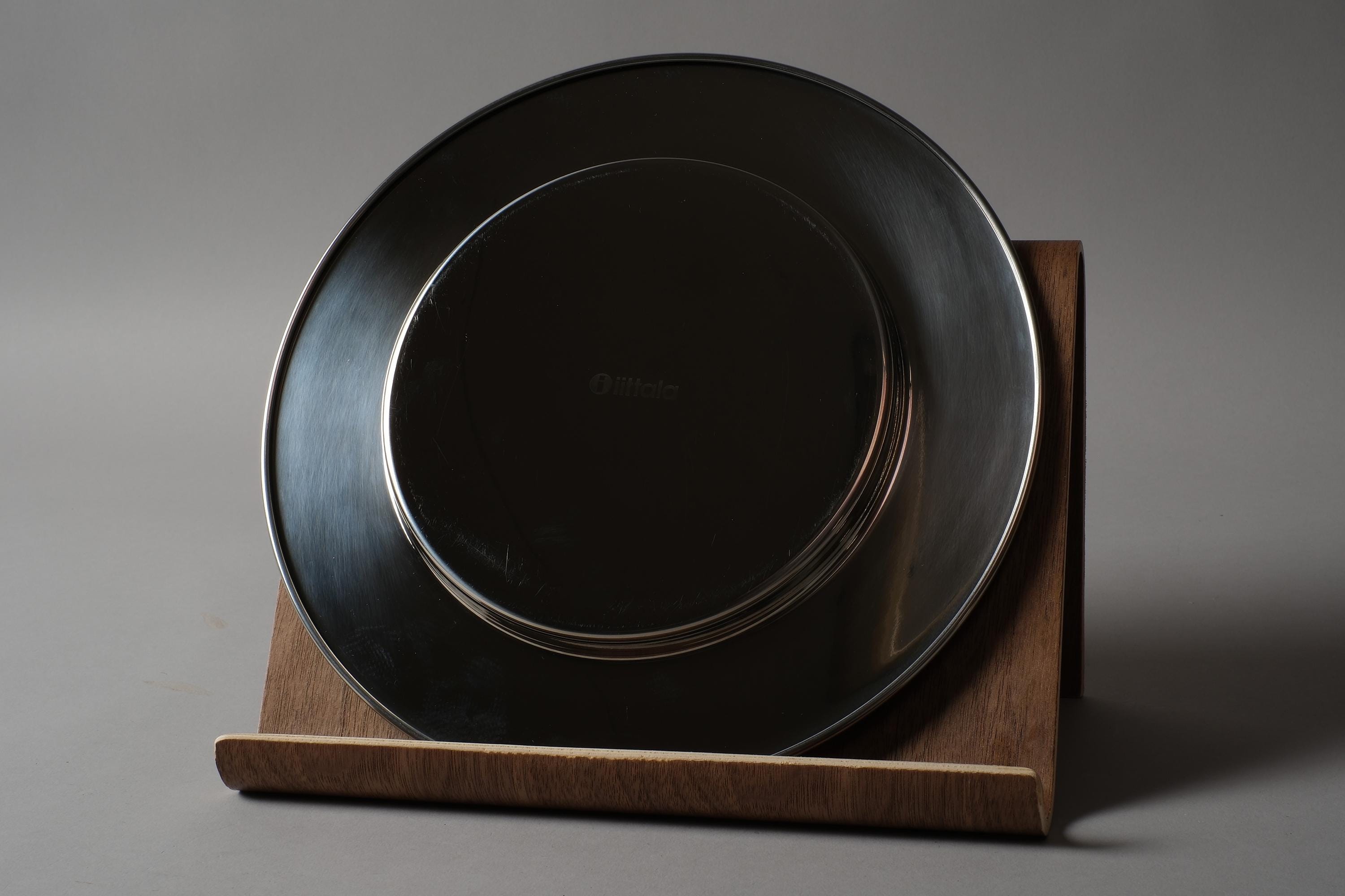 Pair of stainless steel serving platters, Sarpaneva collection, designed by Timo Sarpaneva for Iittala, Finland, 1971. A wide brushed steel rim surrounds a polished recessed centre. The contrast between matt and mirror finish is the only decoration. Minimal, precise, functional. Both original boxes present. Surface scratches to the polished centre consistent with age and use.