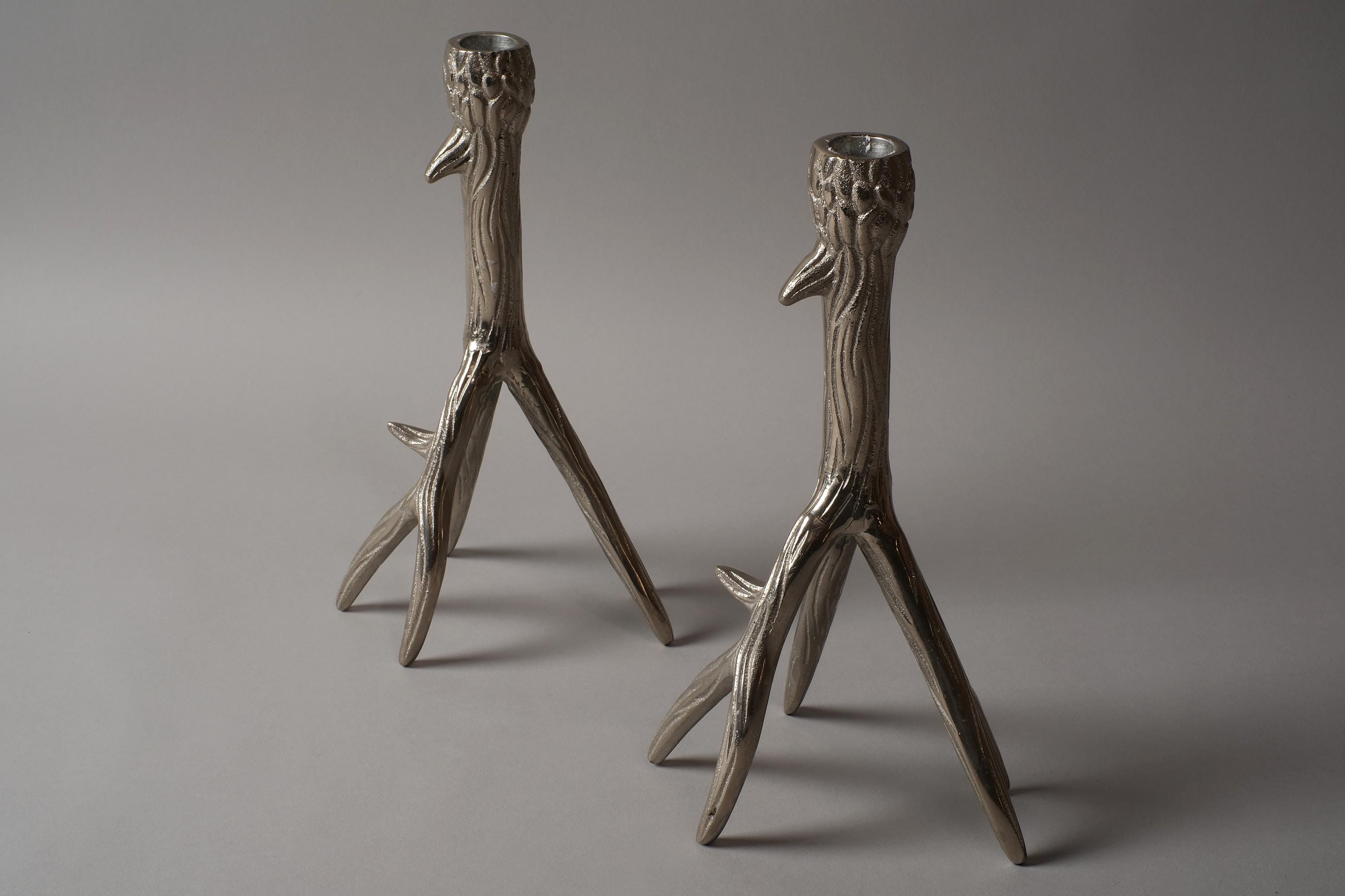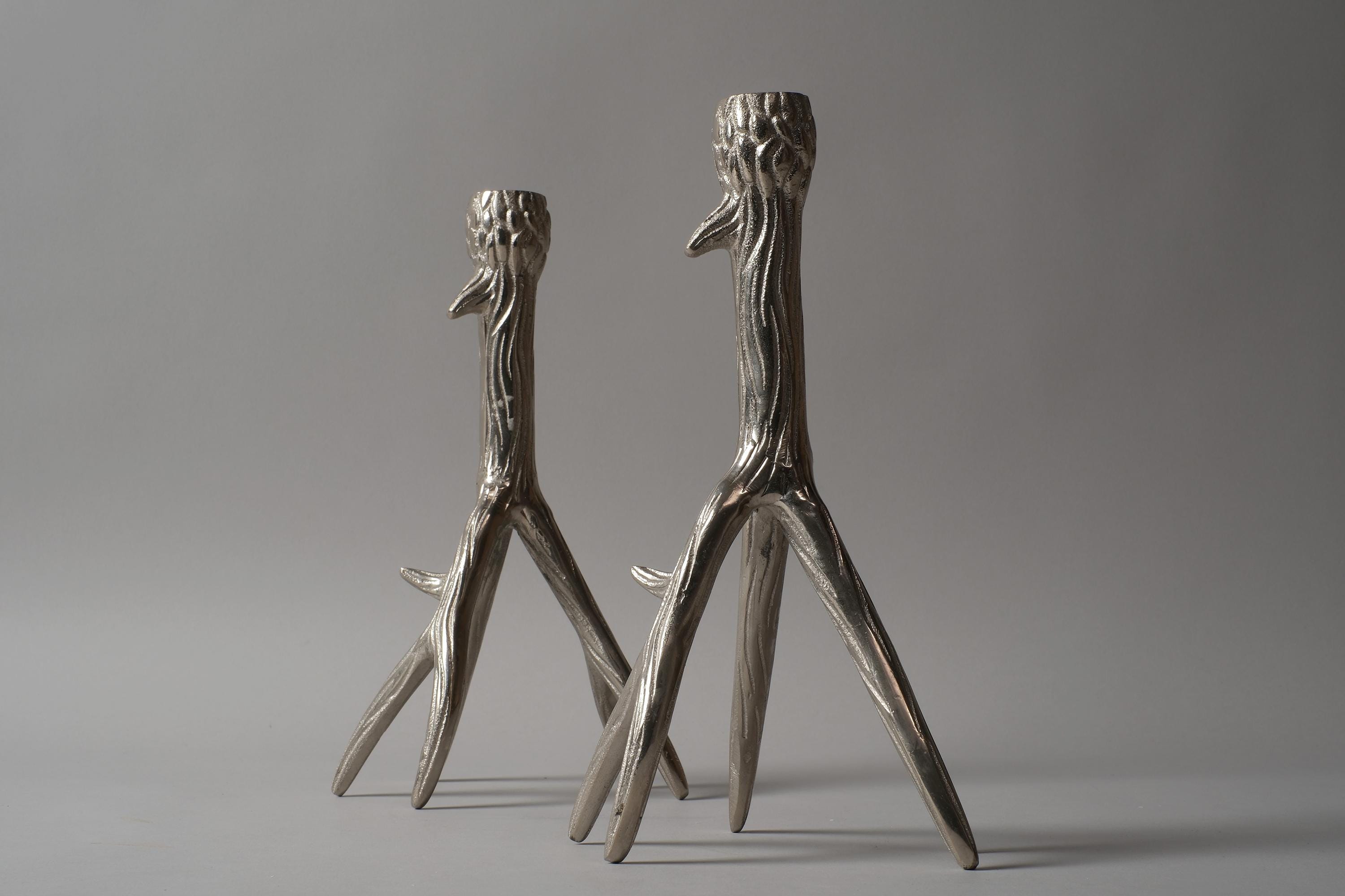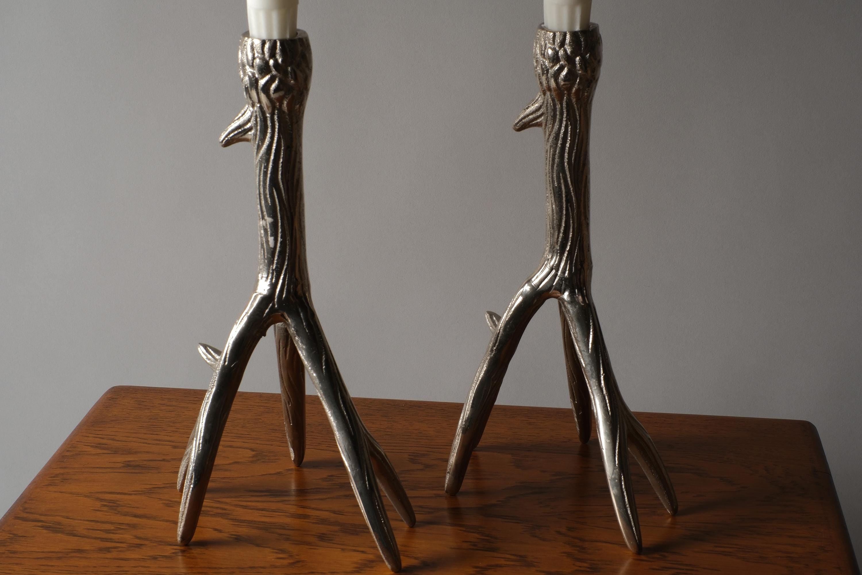 Pair of cast aluminium candlestick holders in the form of tree branches. Each piece stands on three splayed root-like legs, the trunk rises to a single candle socket at the crown. The surface is cast with bark texture throughout with faux bois treatment in polished aluminium with a silver finish.