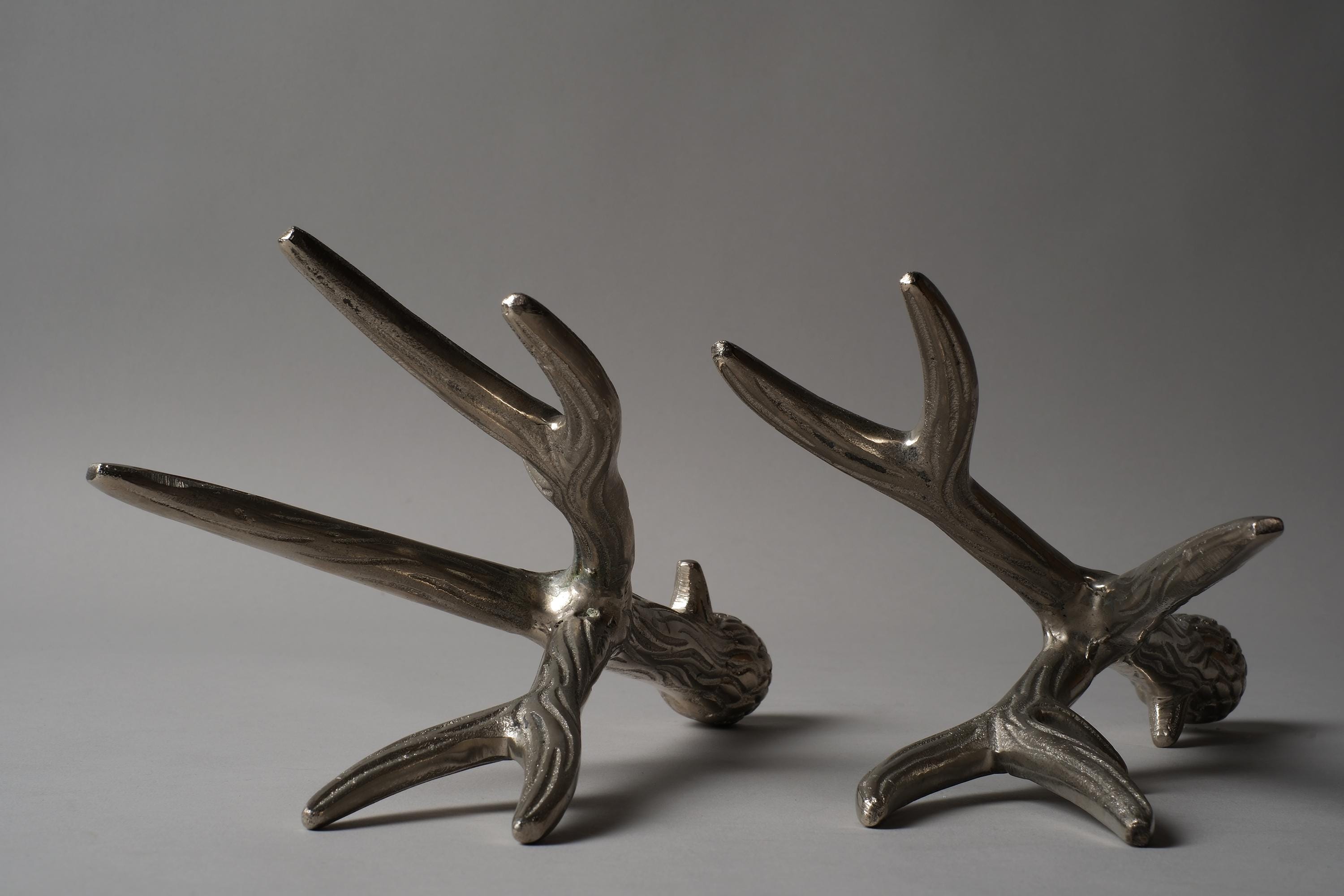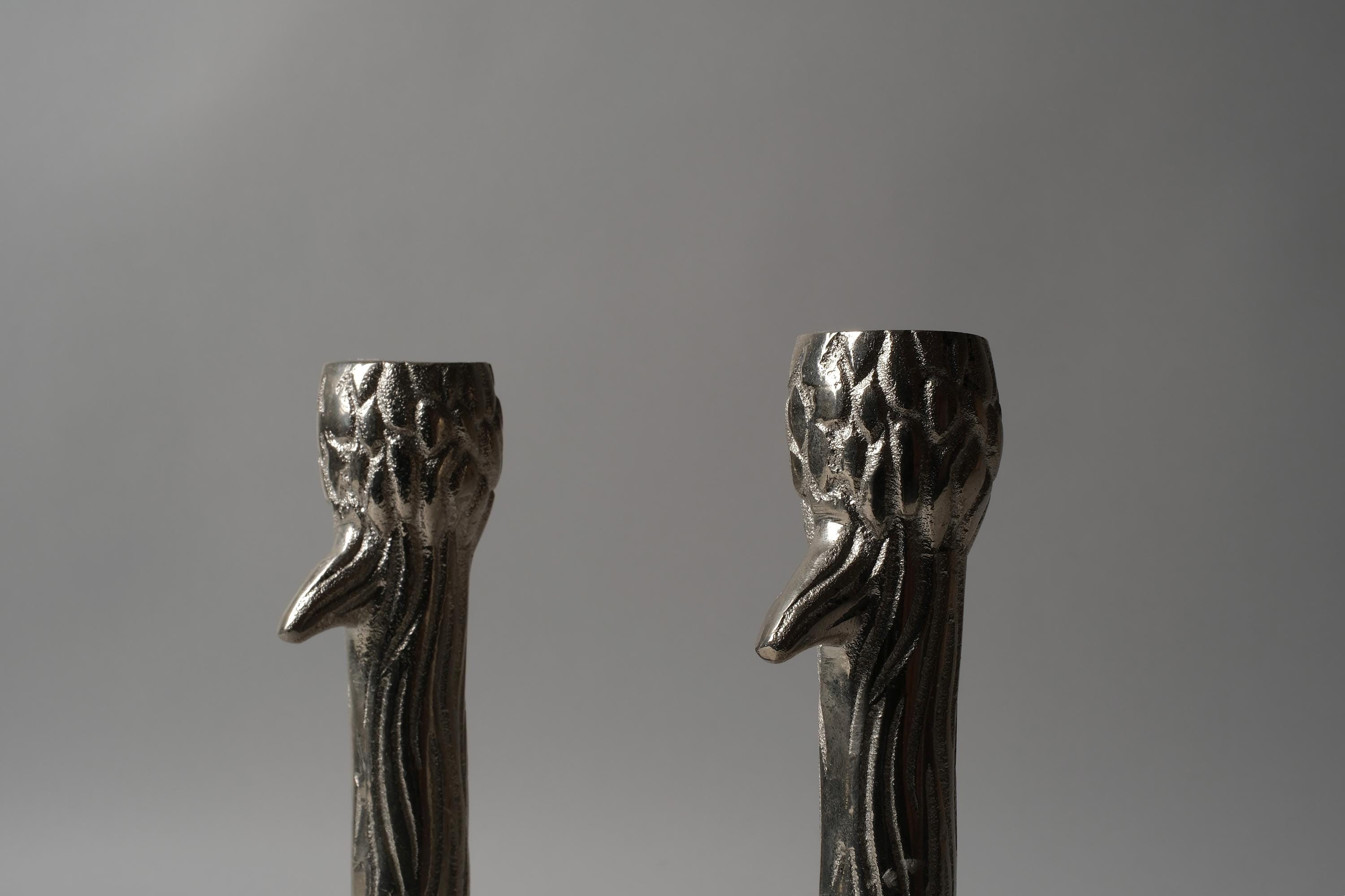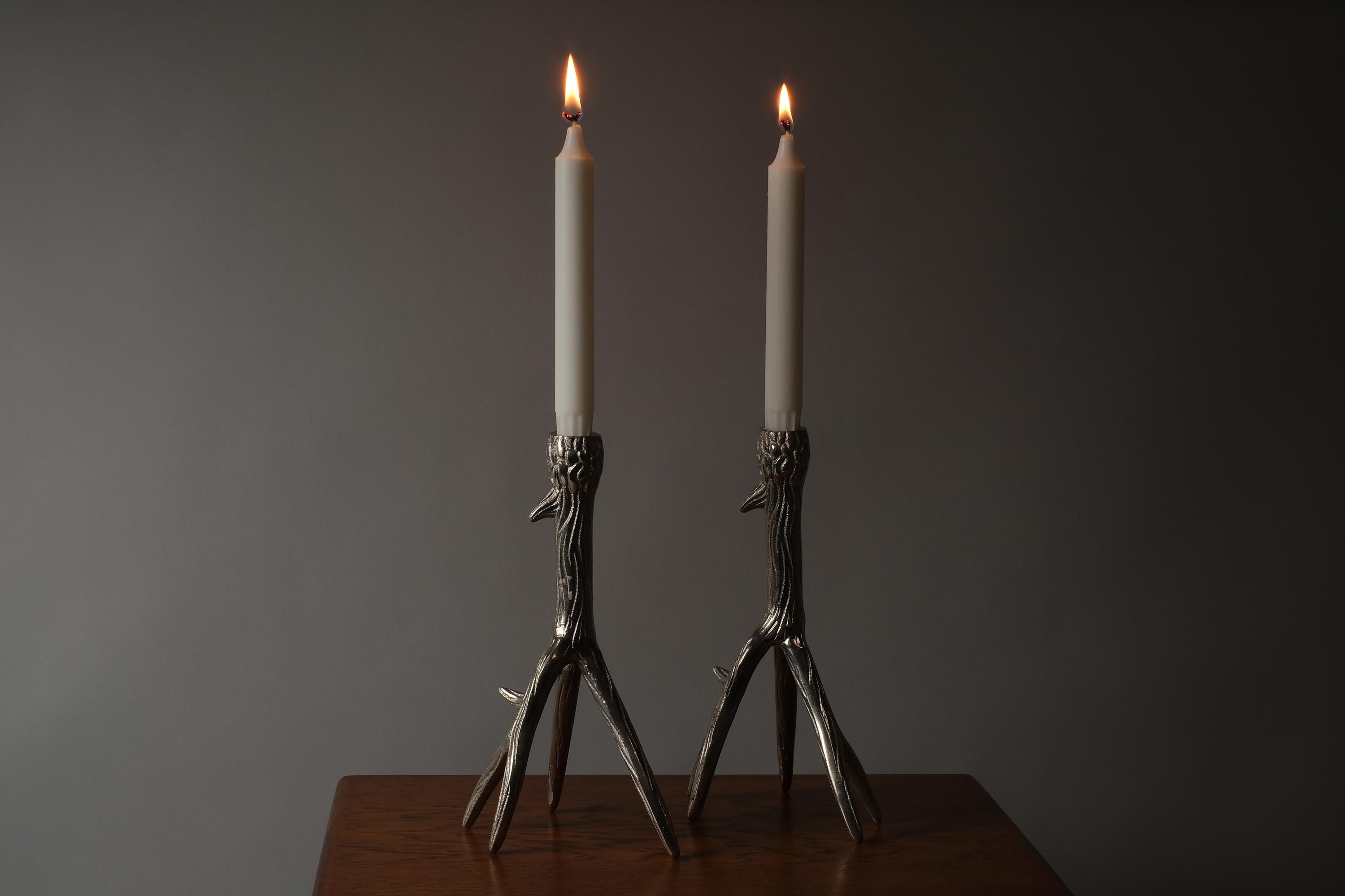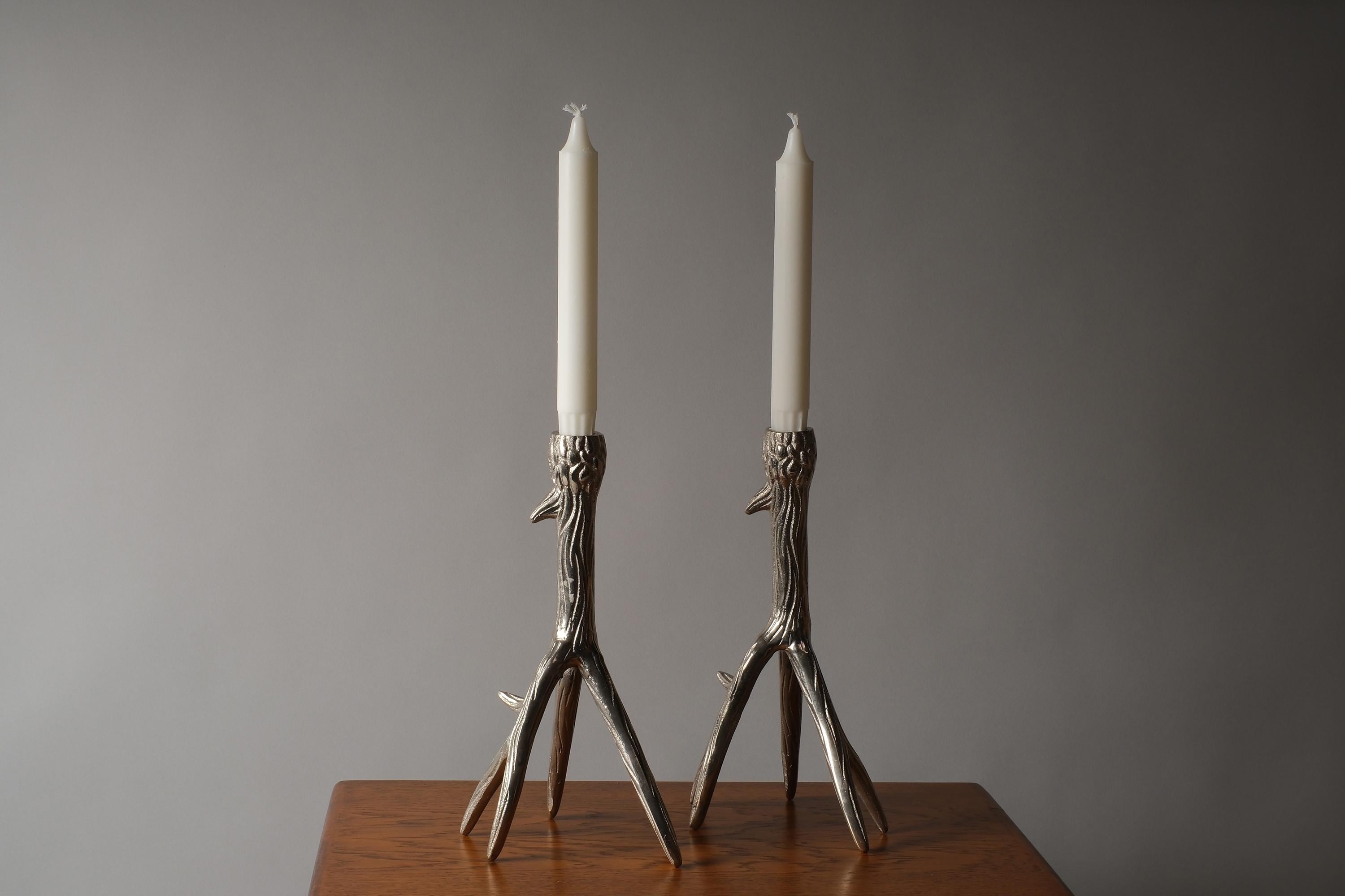 Pair of cast aluminium candlestick holders in the form of tree branches. Each piece stands on three splayed root-like legs, the trunk rises to a single candle socket at the crown. The surface is cast with bark texture throughout with faux bois treatment in polished aluminium with a silver finish.