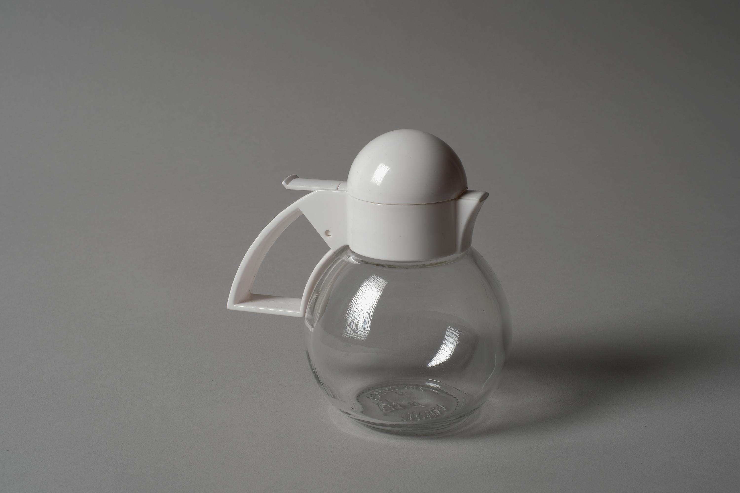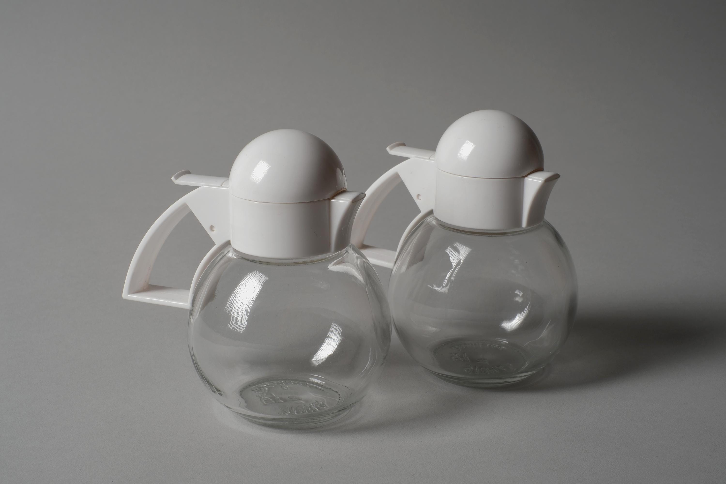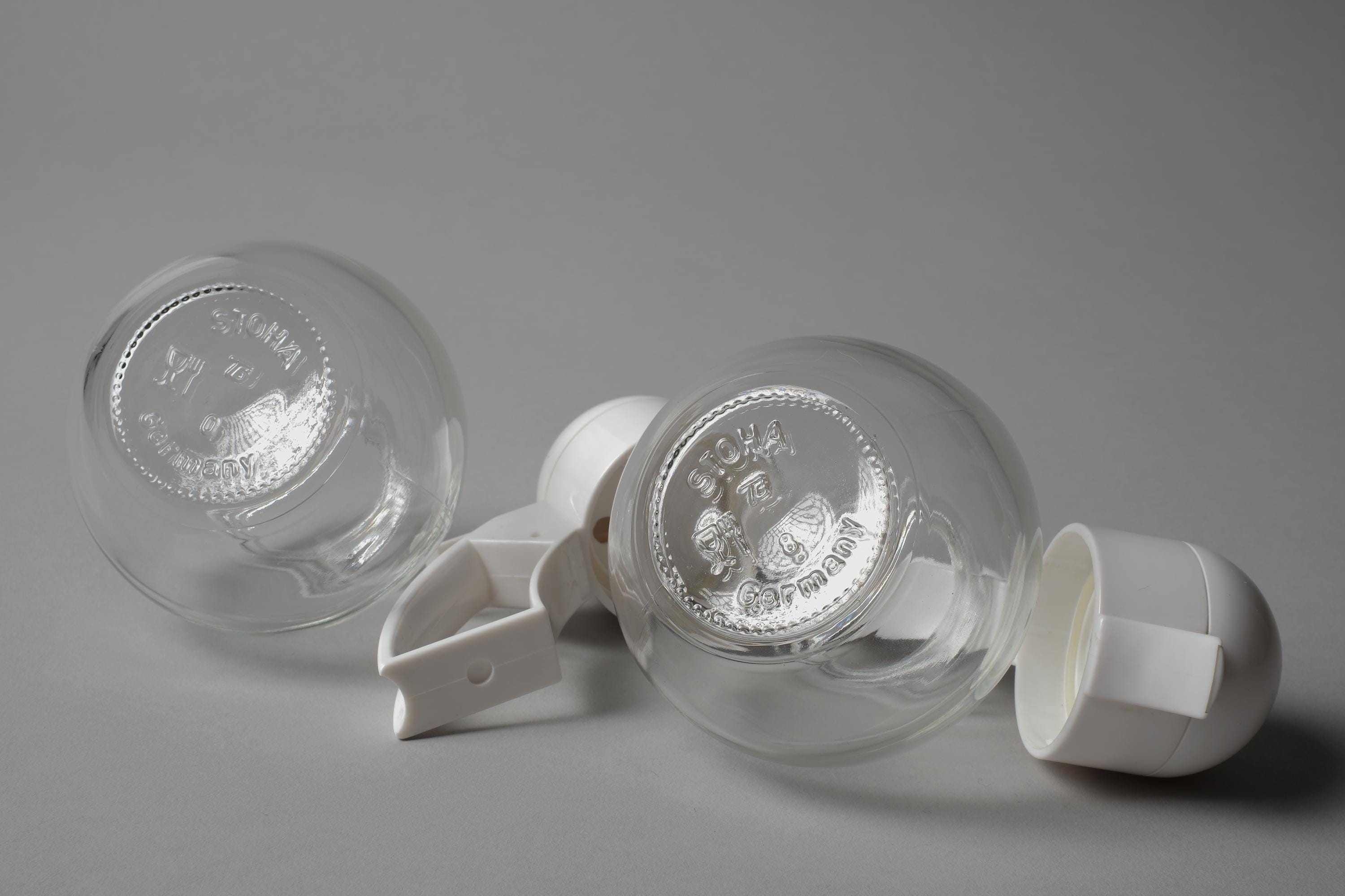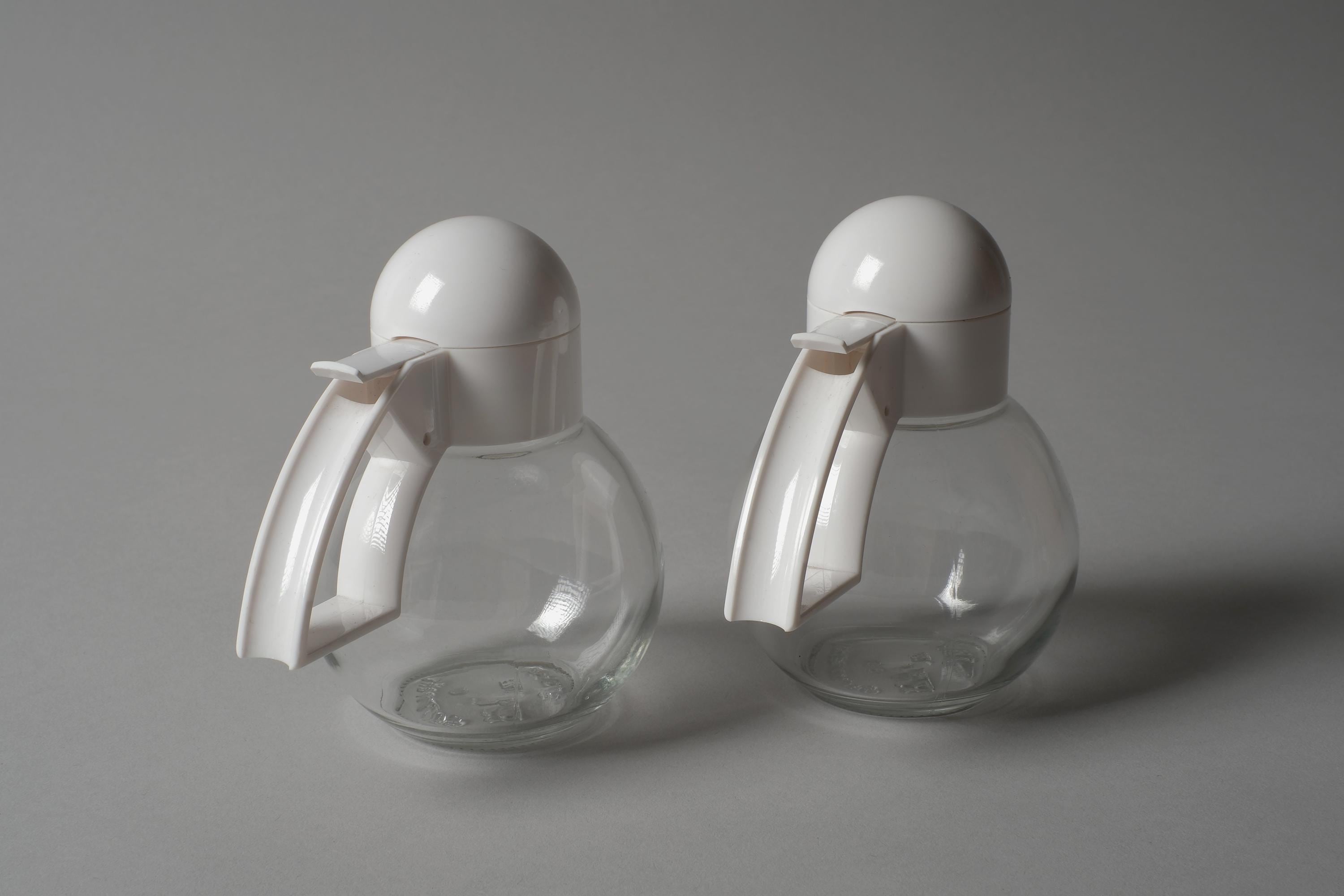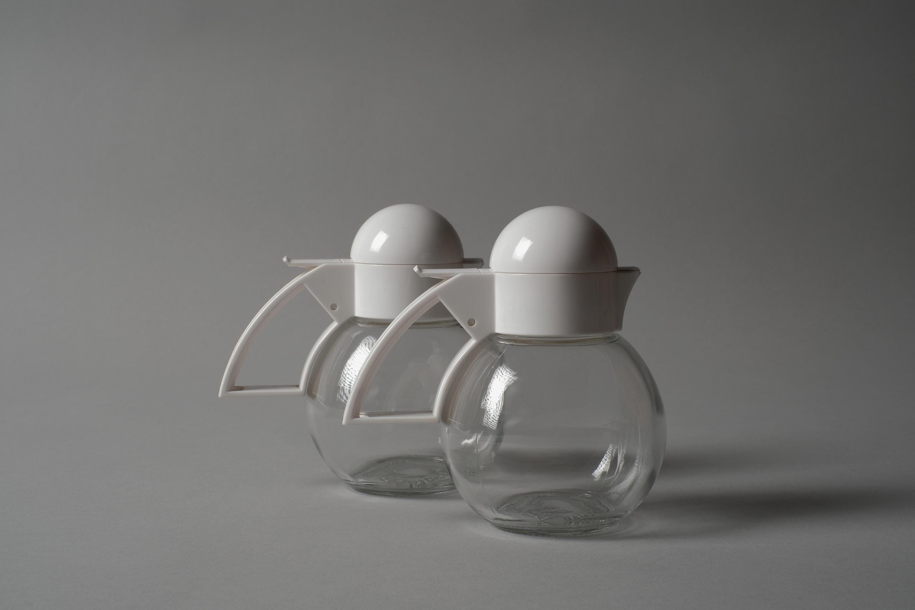 Vintage 1980s pair of glass condiment dispensers by Stoha, West Germany. Spherical clear glass bodies with white plastic lids in the form of a stylised bird head, a hinged beak opens for pouring on one, a flip-top on the other. Intended as a cream and sugar set. Stoha marked on the base. In new condition.