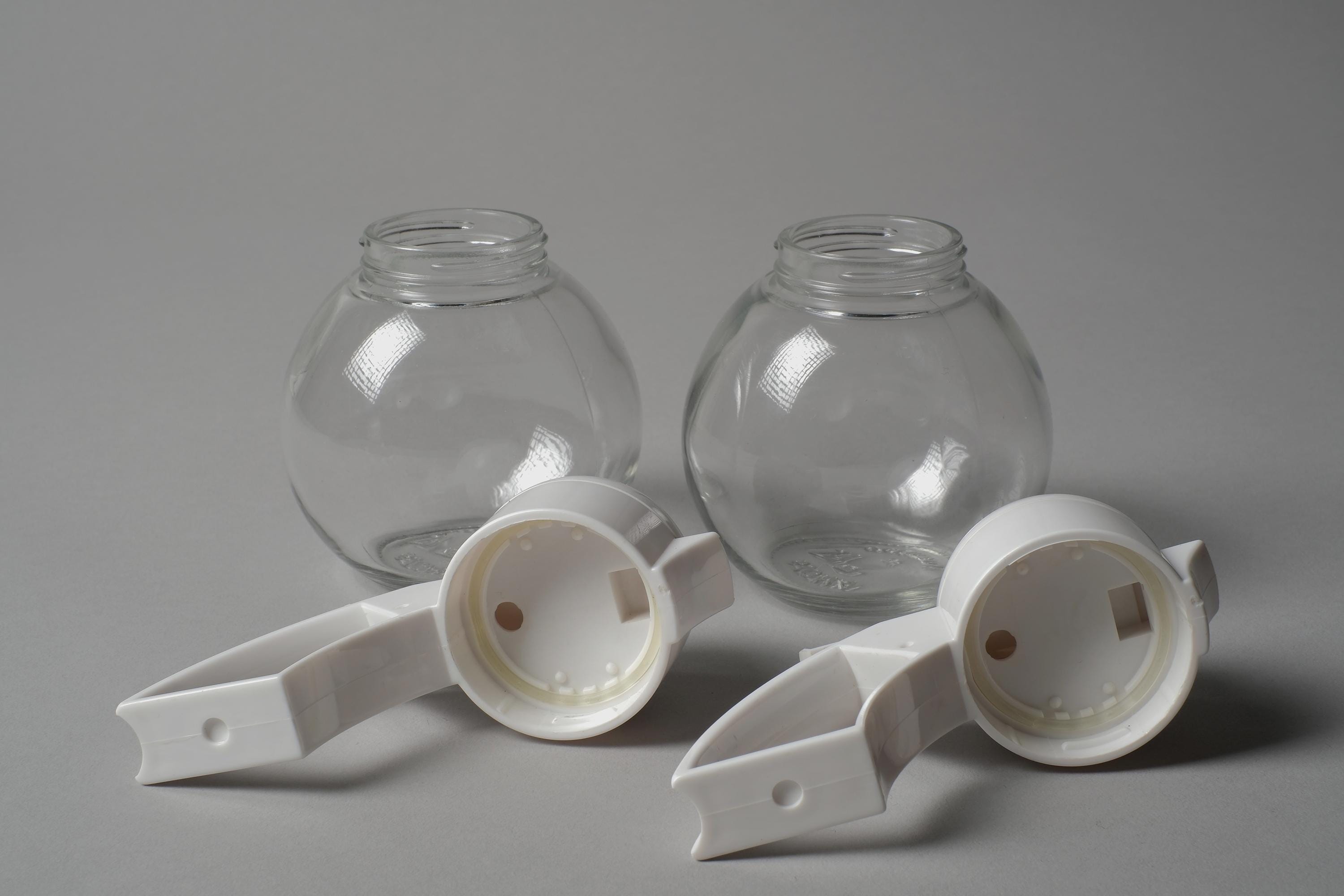 • Material: Clear glass, white plastic lids.