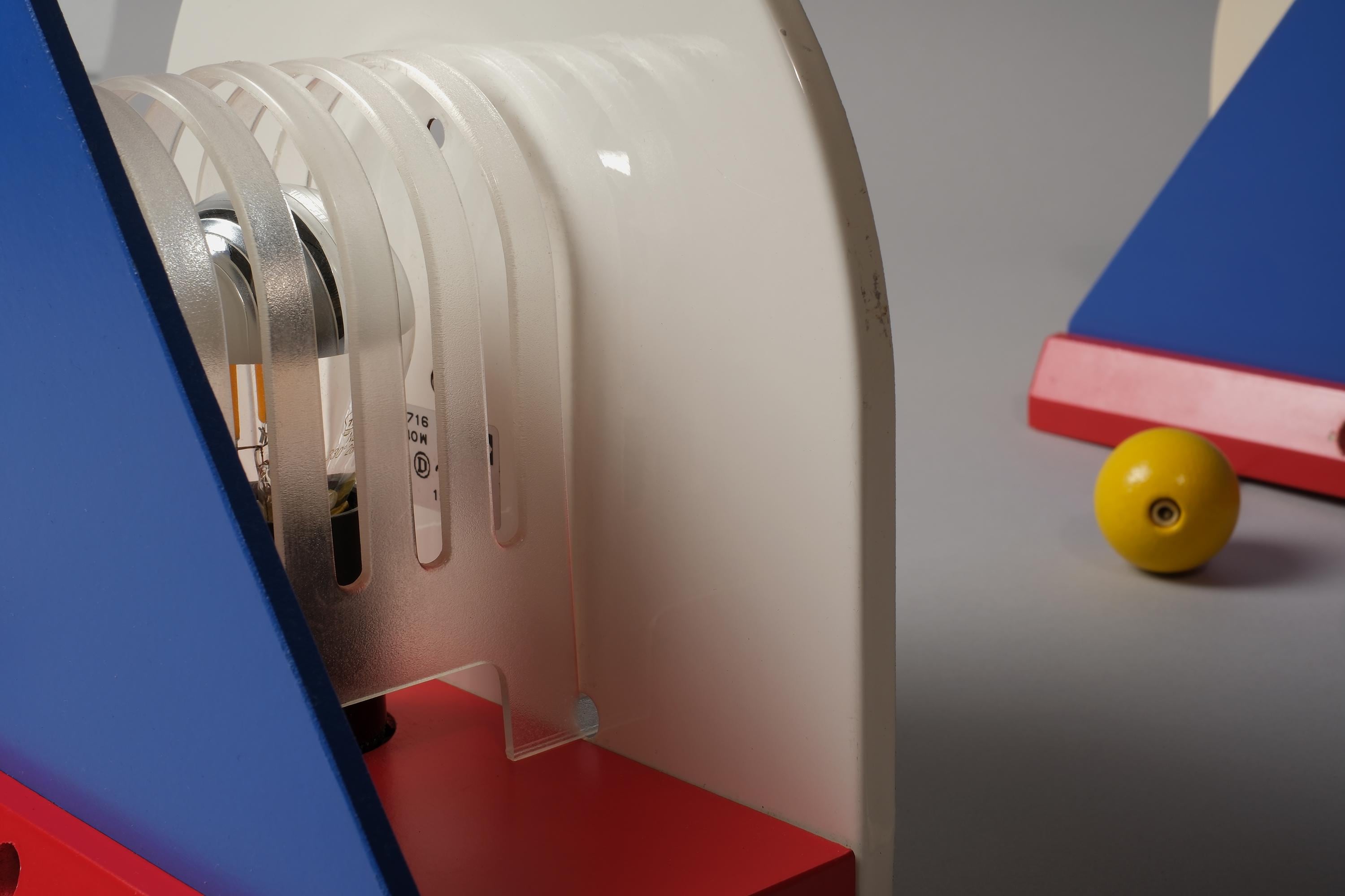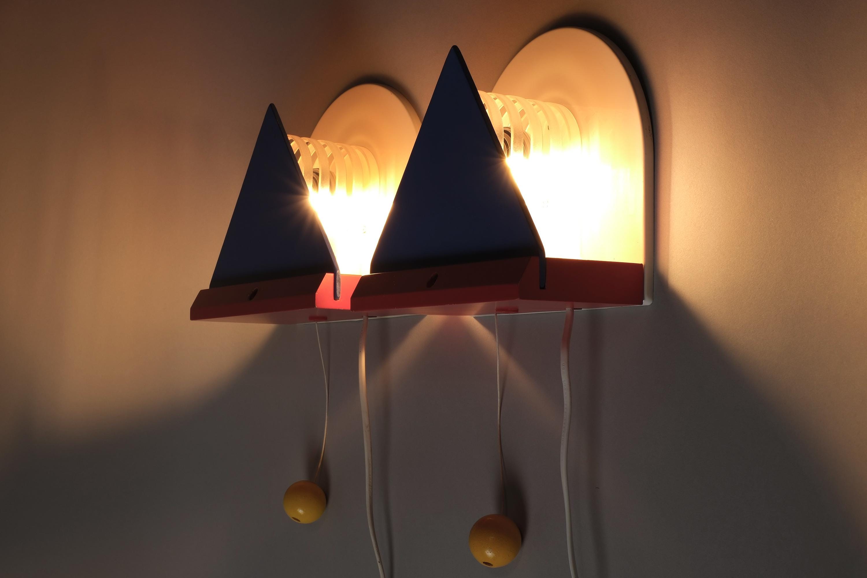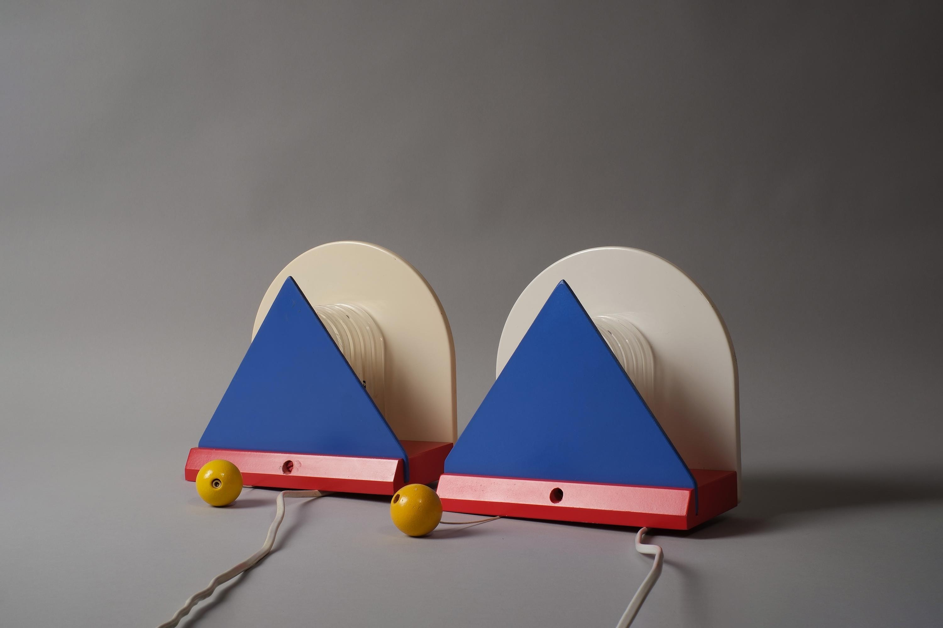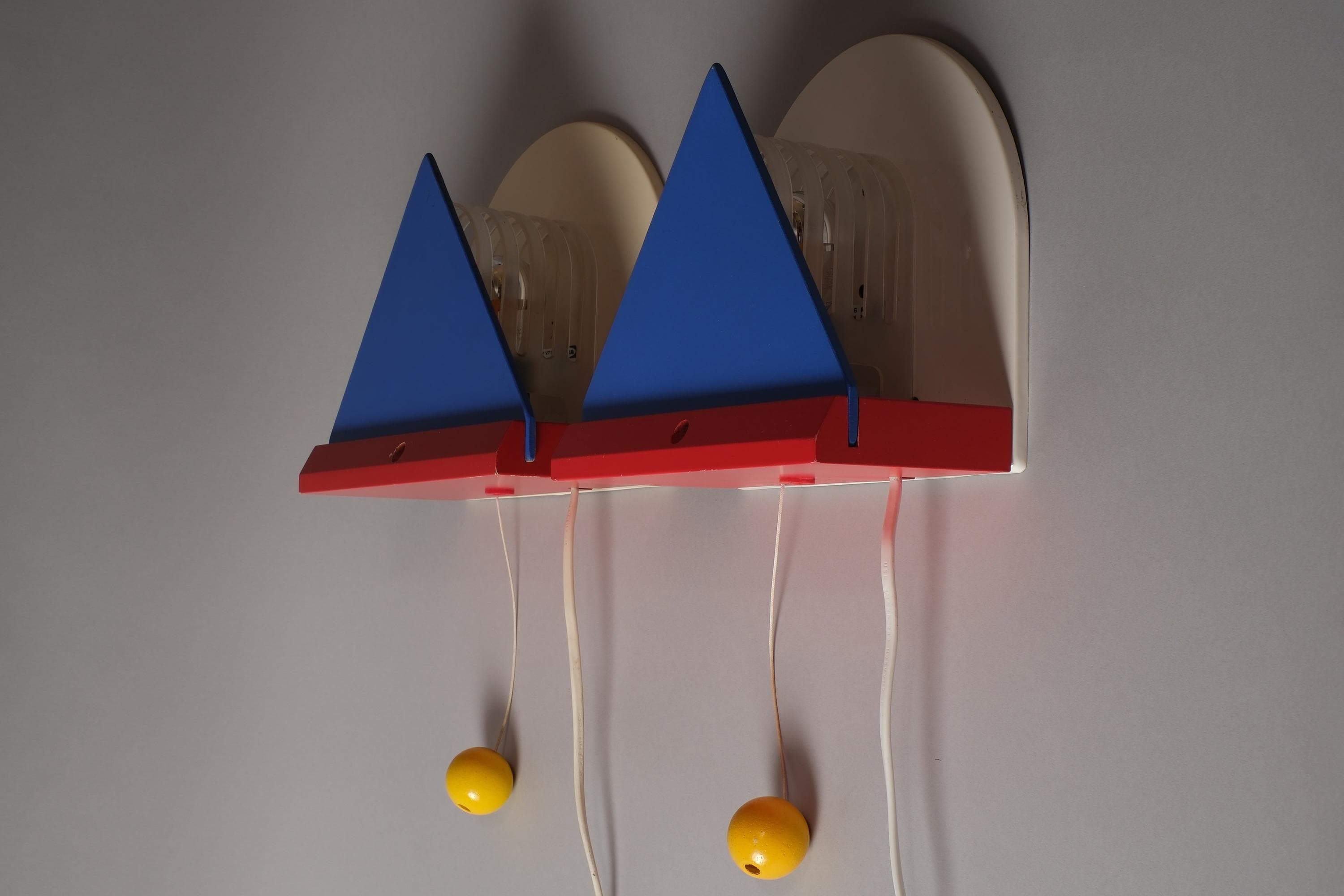Vintage pair of 1987 Stoja V716 wall lamps by IKEA. A white semicircular plastic base plate supports a blue triangular wooden shade on a red rectangular body, with a yellow ball pull on/off switch. The primary colours in a geometric composition sits firmly in the Memphis postmodern design language. Original IKEA sticker inside the plastic shade.