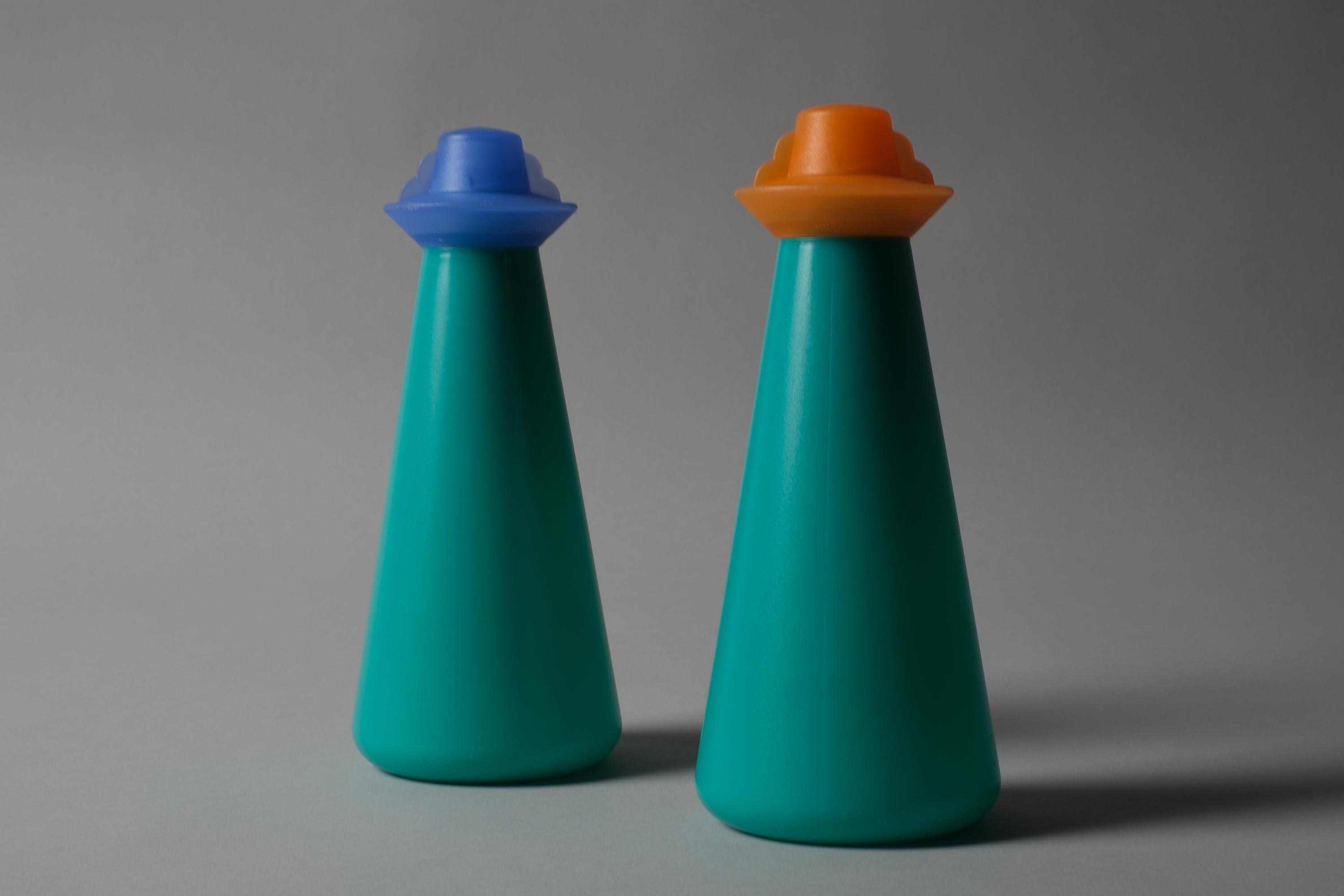 Vintage Tupperware Impressions set comprising of two oil and vinegar bottles (model 3352) and a butter dish/cheese keeper (model 1840/1841). The conical bottles are teal plastic with blue and orange push-fit caps; the butter dish is orange with a flat-fitting lid. The colour pairing across both pieces is intentional as they are part of the Impressions range colour system. All pieces fully functional, airtight seals intact.