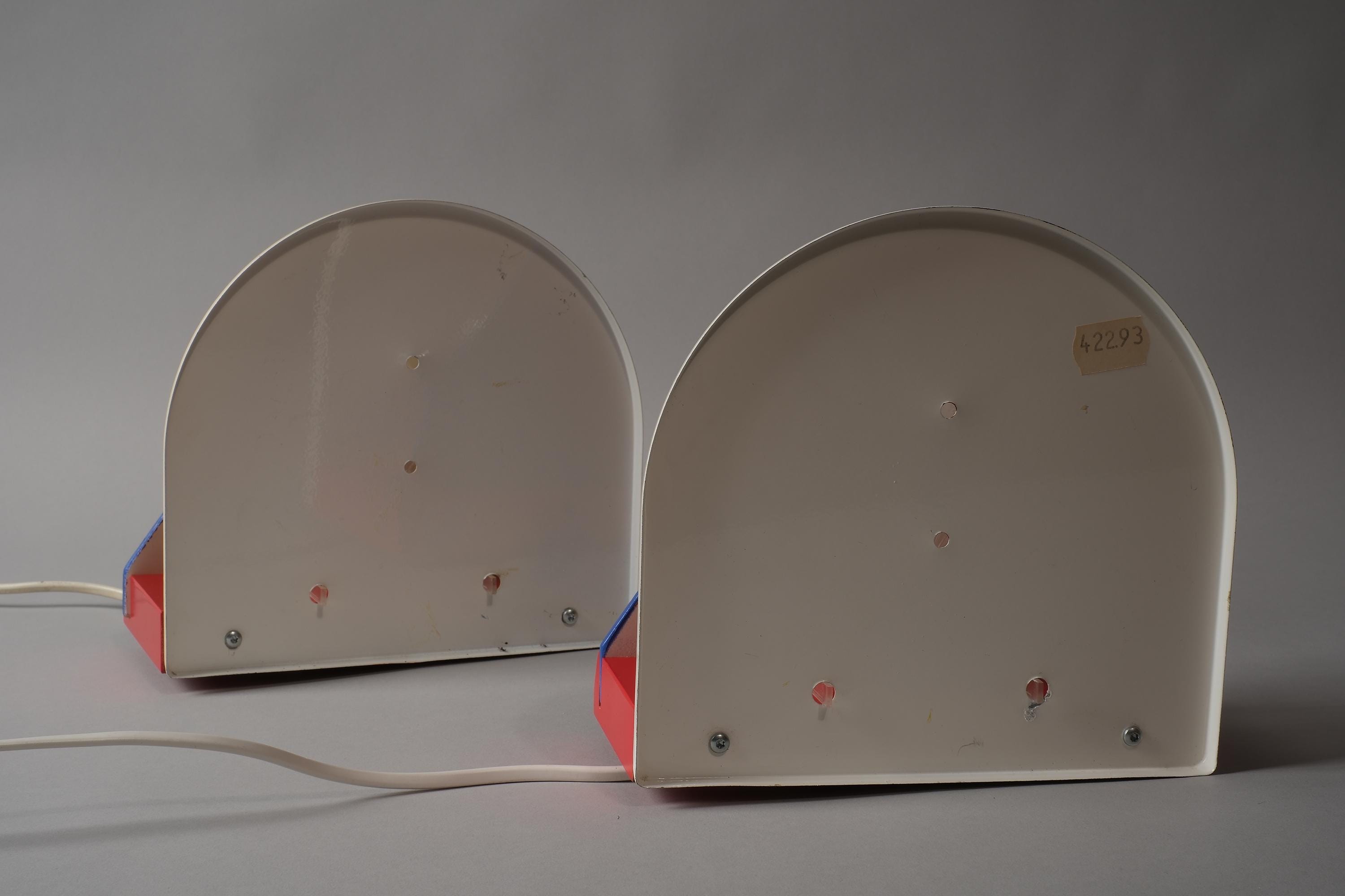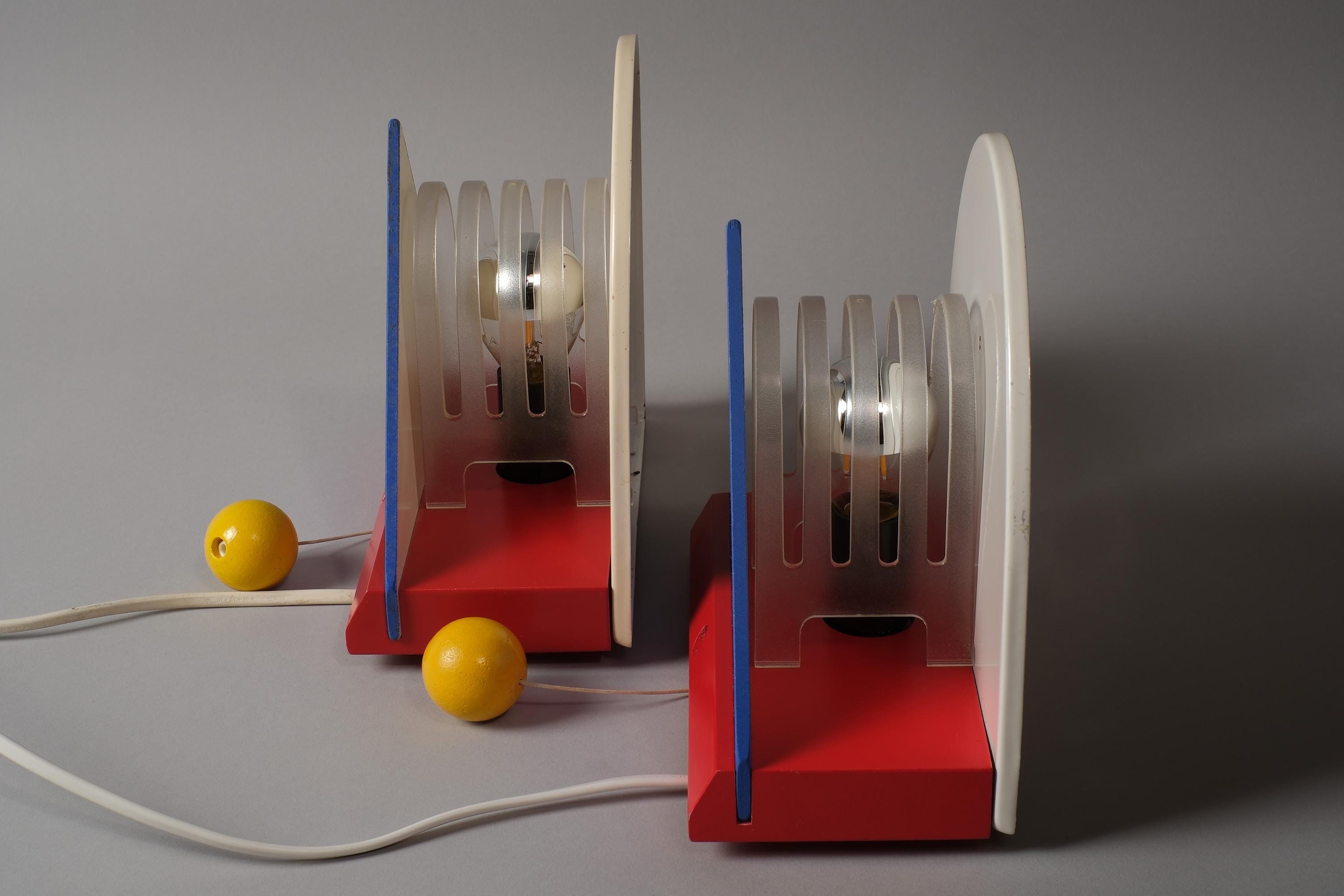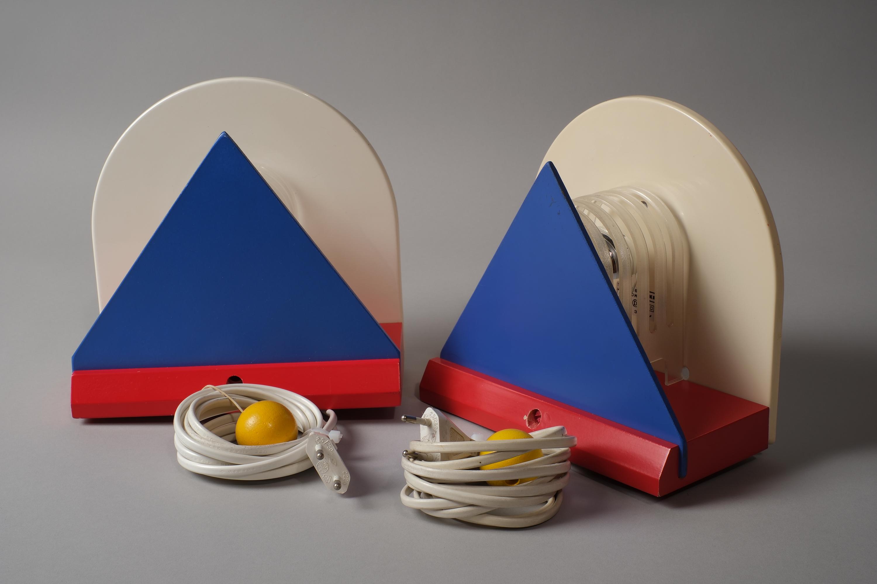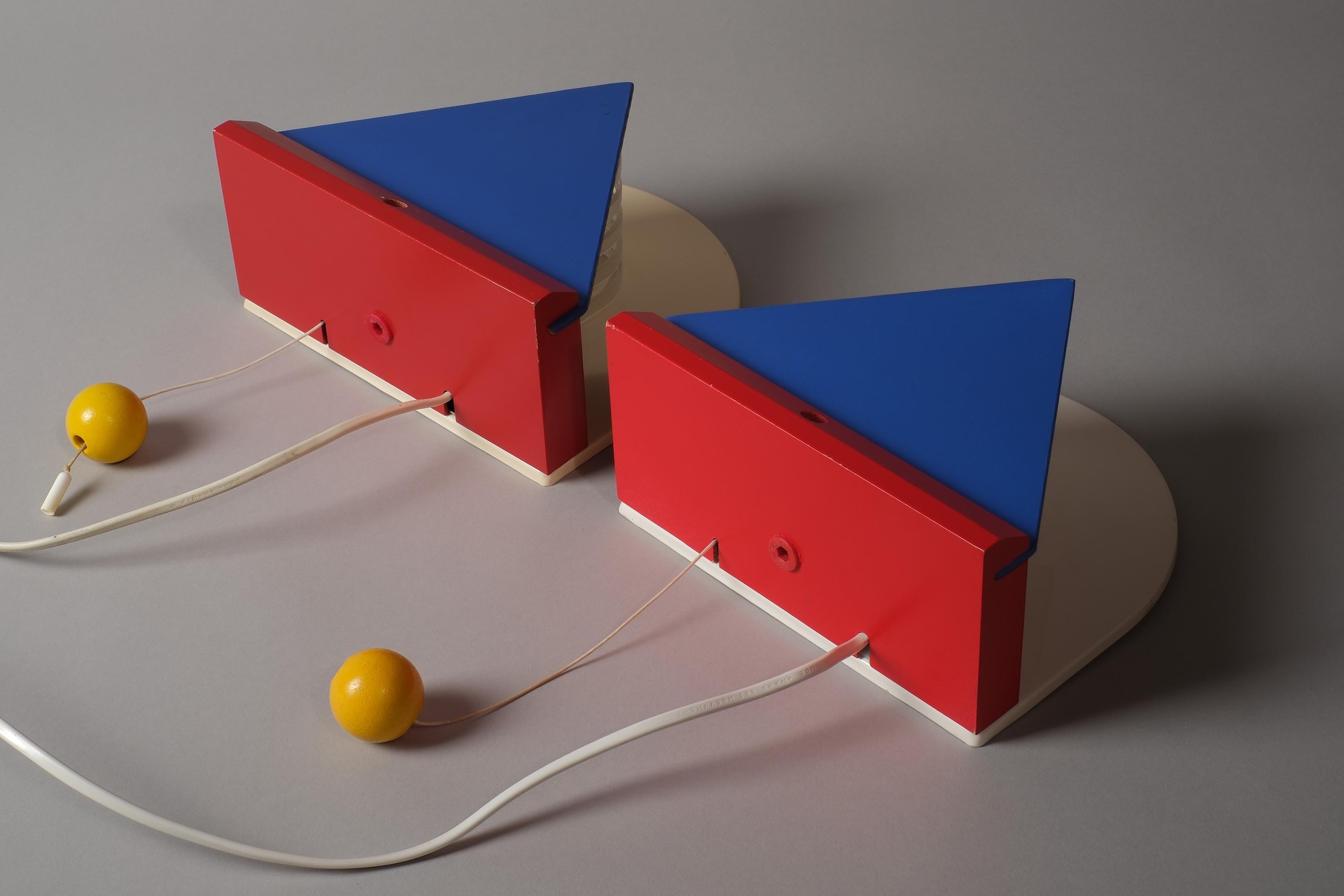 Vintage pair of colorful Memphis Design accent wall lights. A white semicircular plastic base plate supports a blue triangular wooden shade on a red rectangular body, with a yellow ball pull on/off switch. The primary colours in a geometric composition sits firmly in the Memphis postmodern design language.