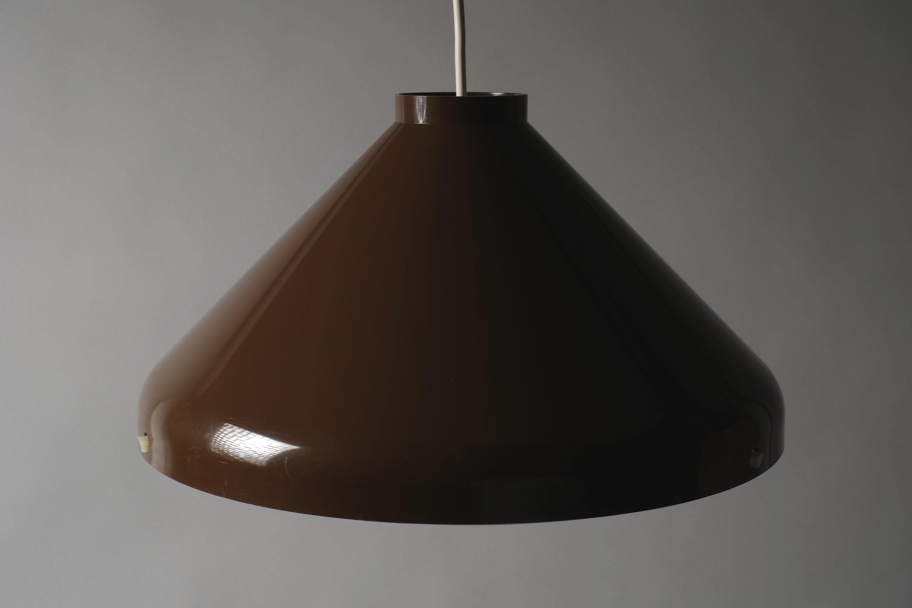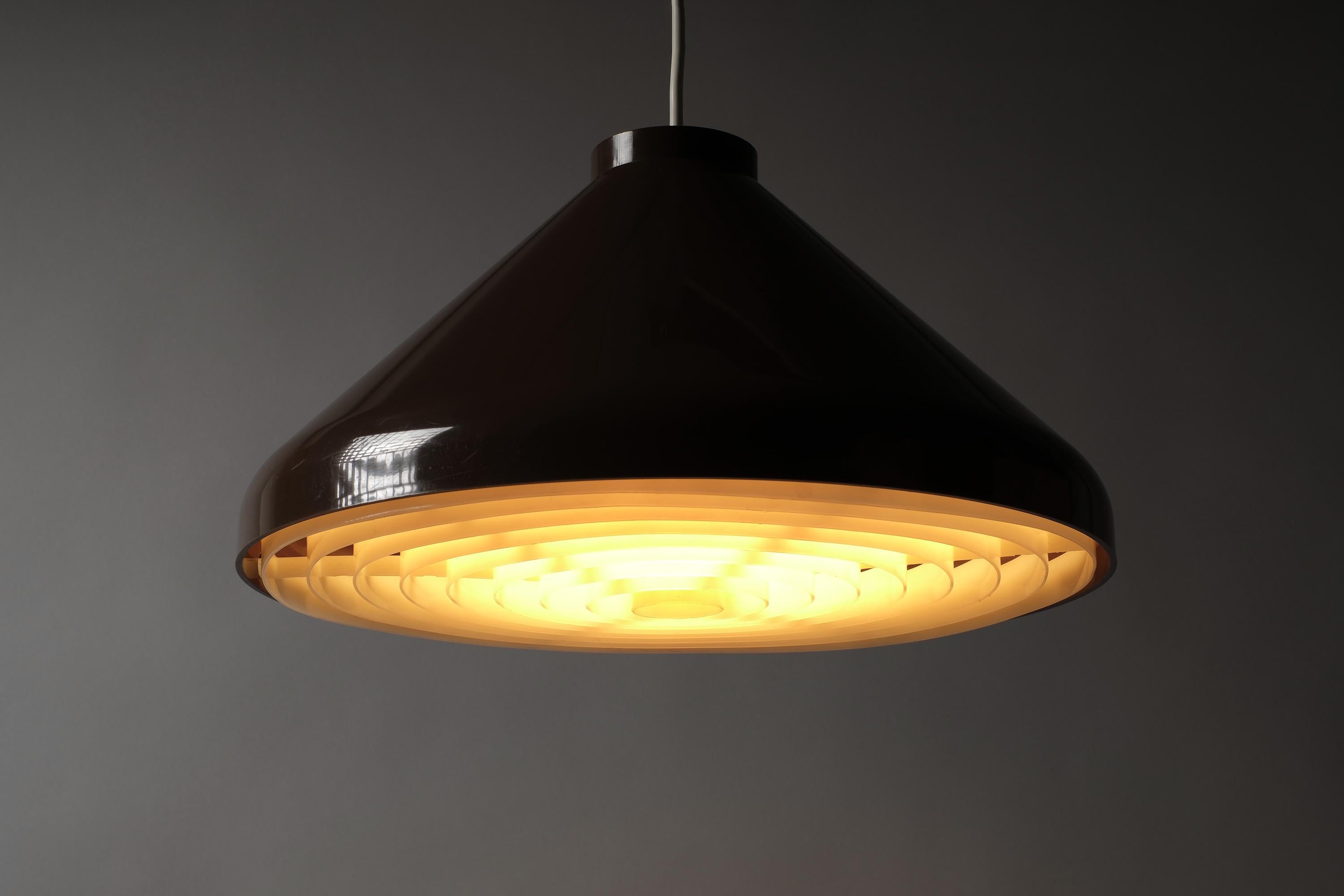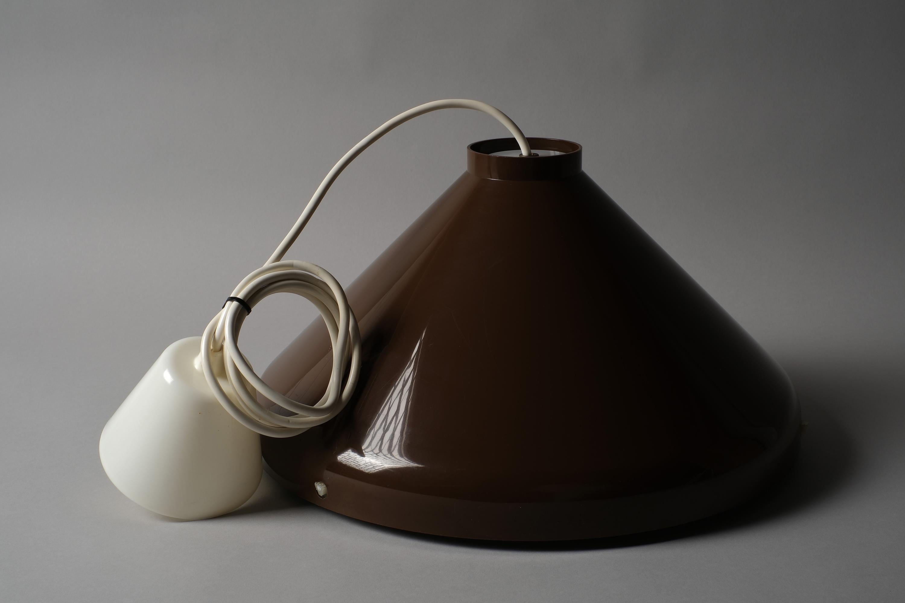Vintage 1970s cone-shaped pendant lamp, Sweden, anonymous maker. A wide dark brown plastic shade in a flat cone profile with a ribbed white raster diffuser on the interior that distributes light evenly downward. Original cord, 110cm, with white plastic ceiling rose. Clean and functional.