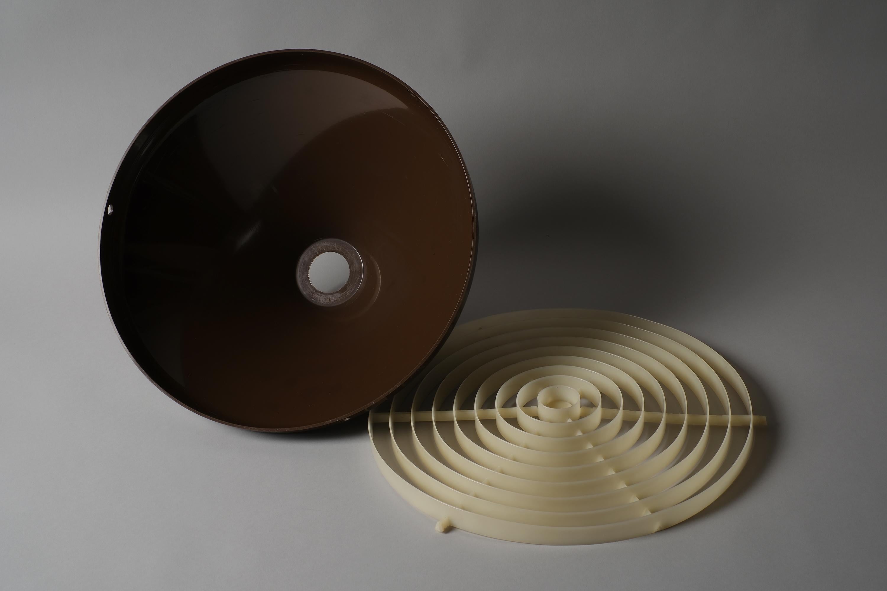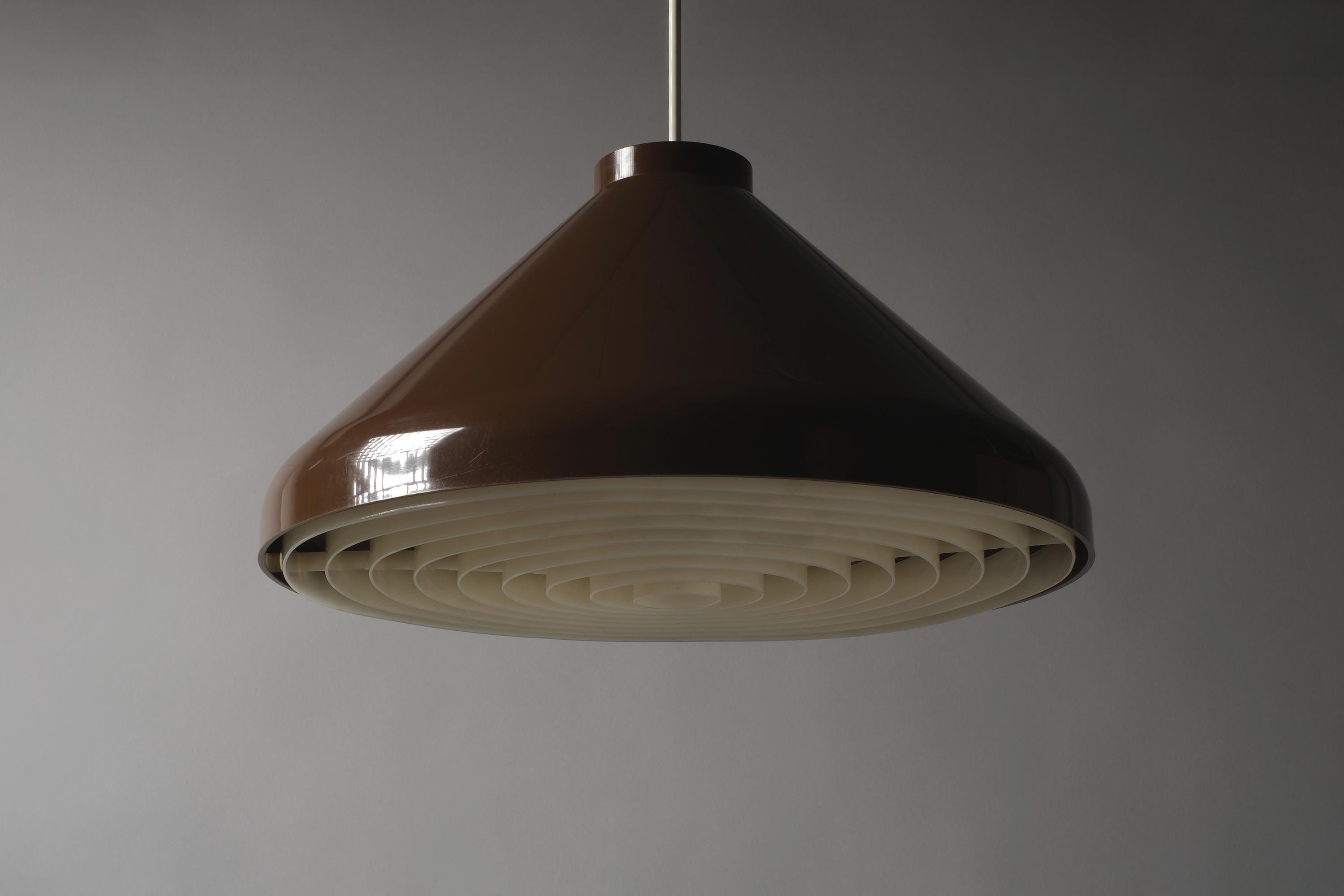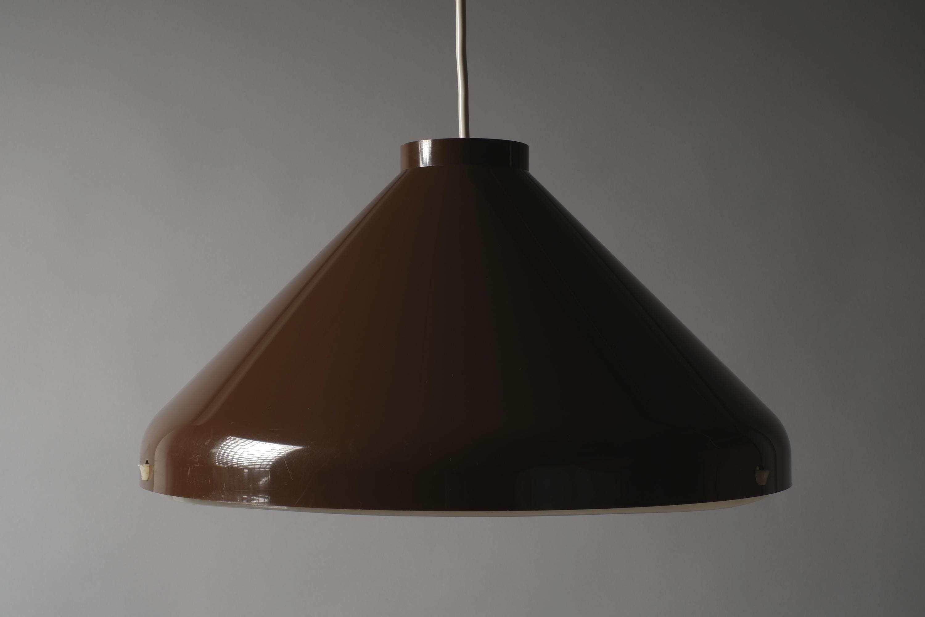 Vintage 1970s cone-shaped pendant lamp, Sweden, anonymous maker. A wide dark brown plastic shade in a flat cone profile with a ribbed white raster diffuser on the interior that distributes light evenly downward. Original cord, 110cm, with white plastic ceiling rose. Clean and functional.