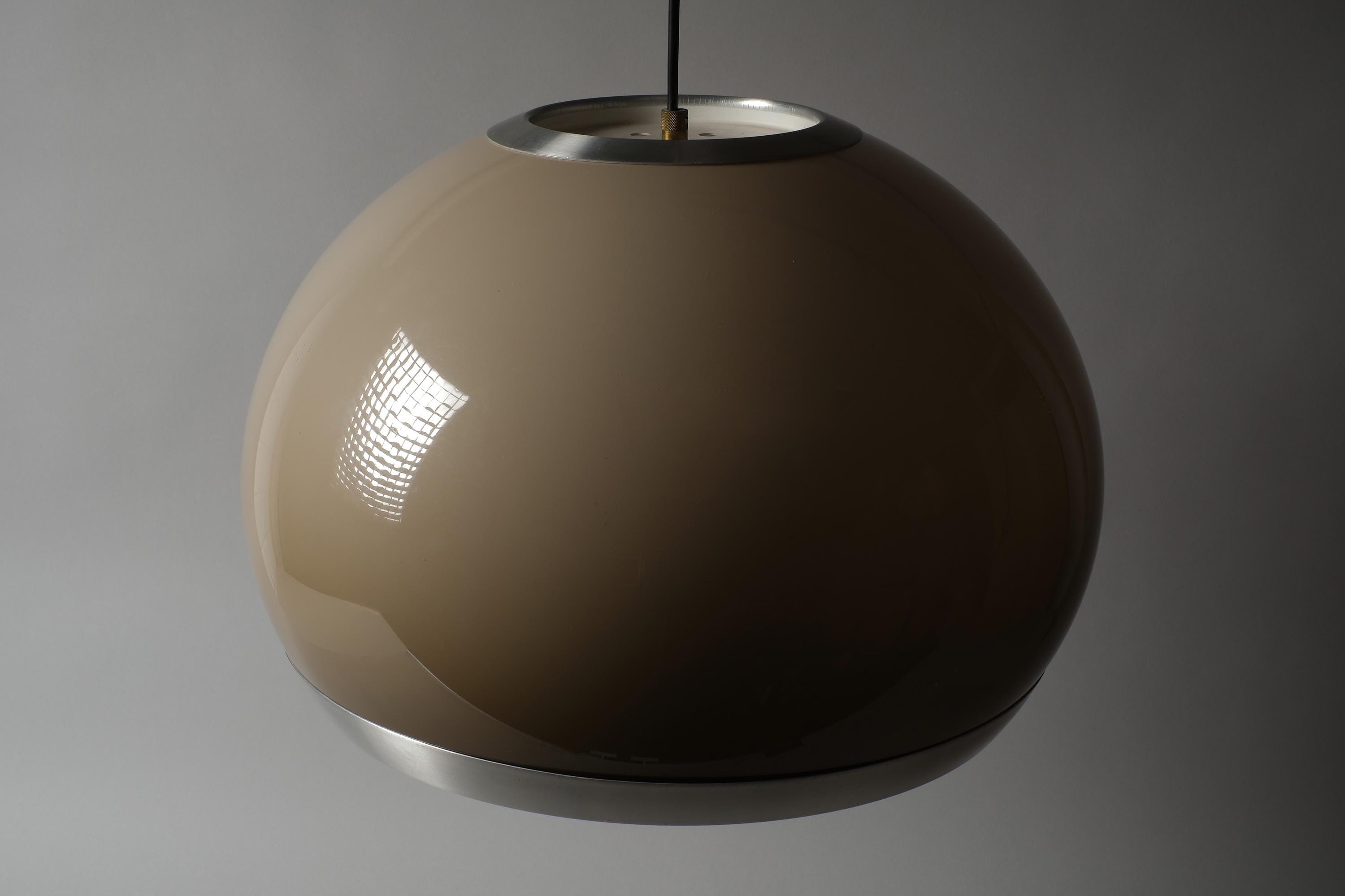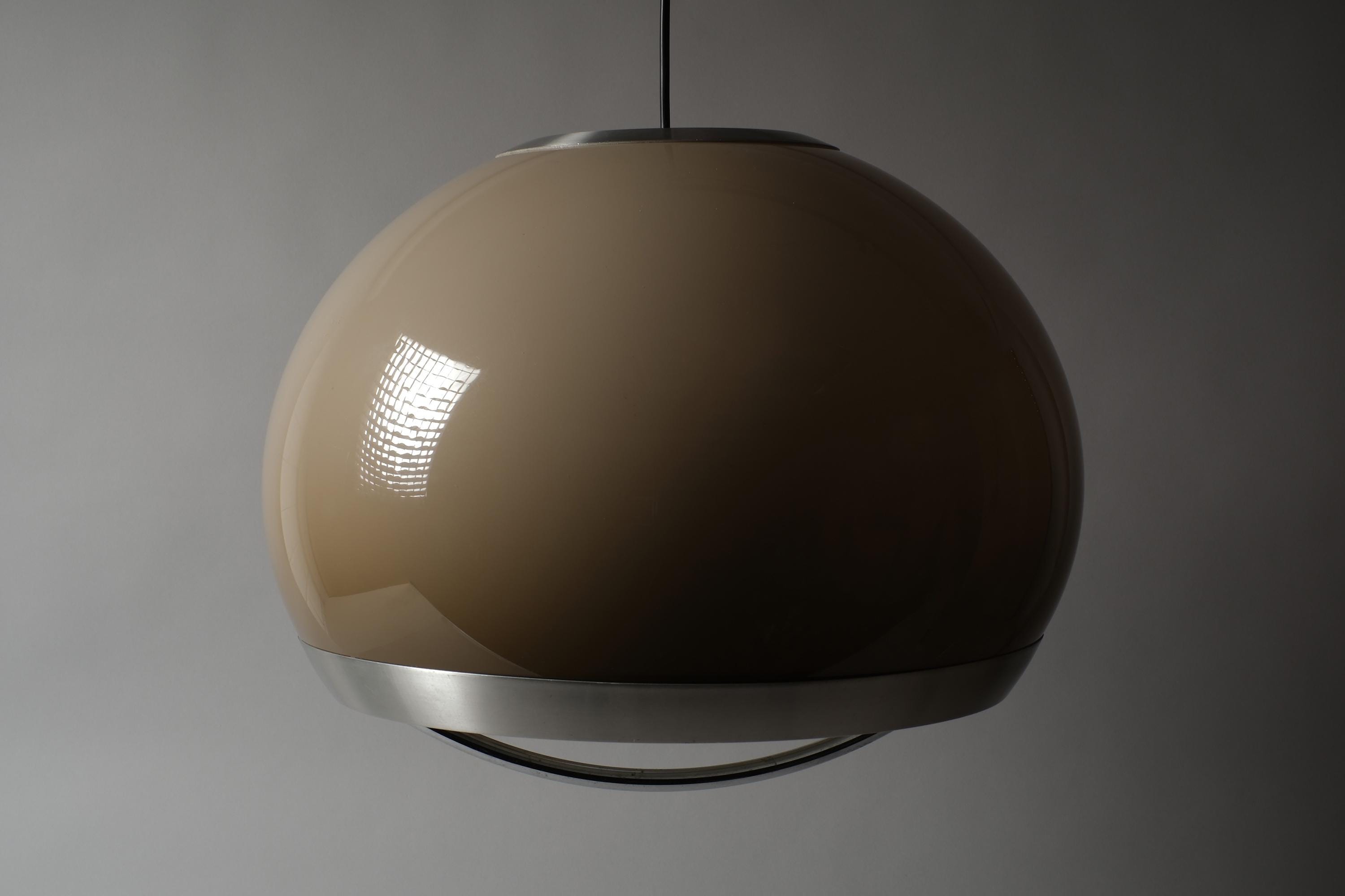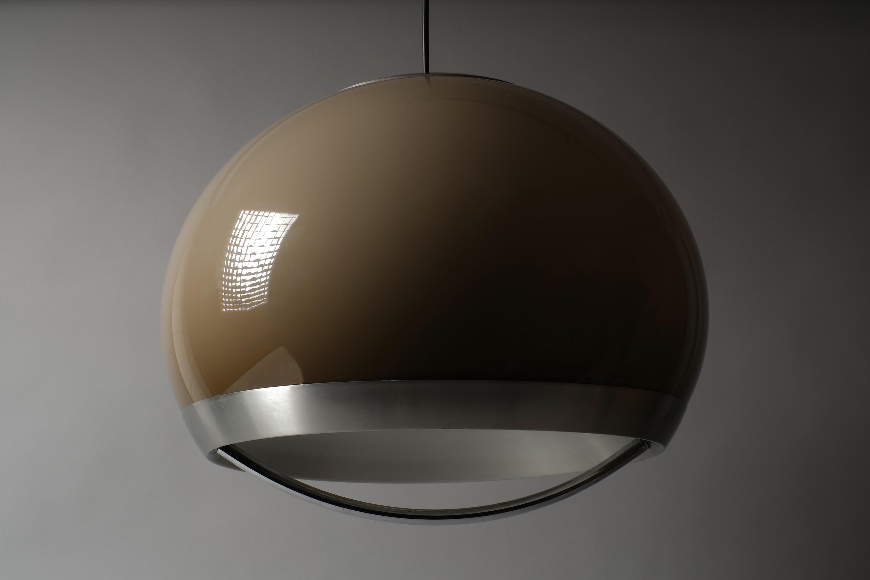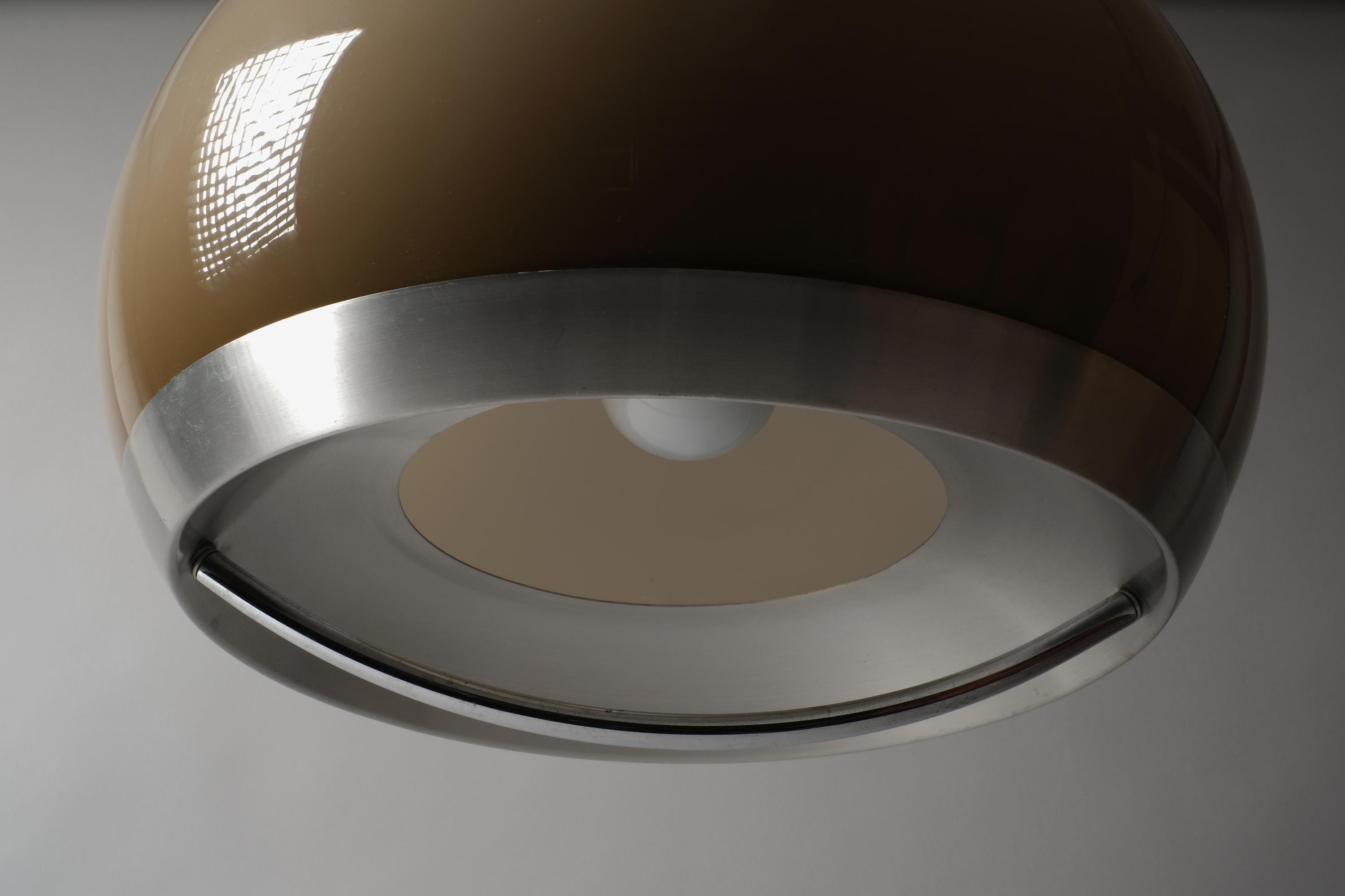 Vintage 1970s pendant lamp by Dijkstra Lampen, Haarlem, Holland. A large mocha brown acrylic dome shade with a wide brushed aluminium band. Light escapes through the gap between dome and band, casting a warm, diffused glow across the ceiling and room. The brown acrylic transmits light with a characteristic amber warmth that is the signature of Dijkstra's 1970s production.