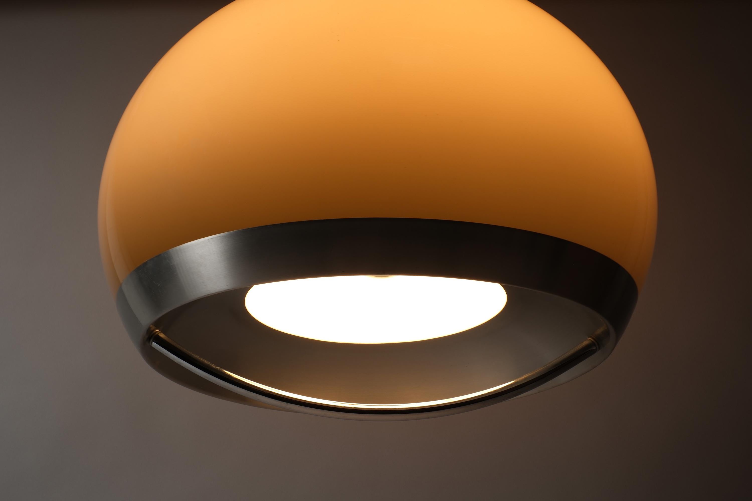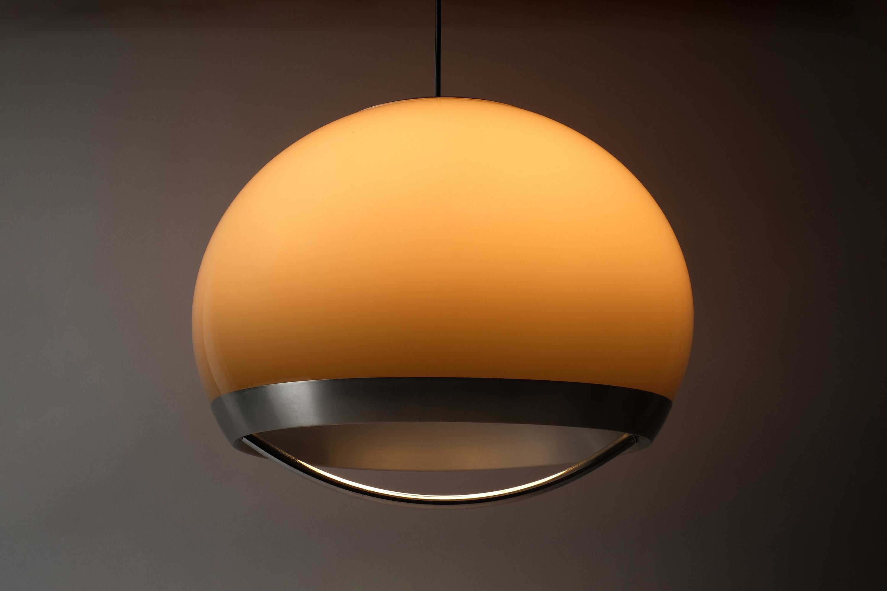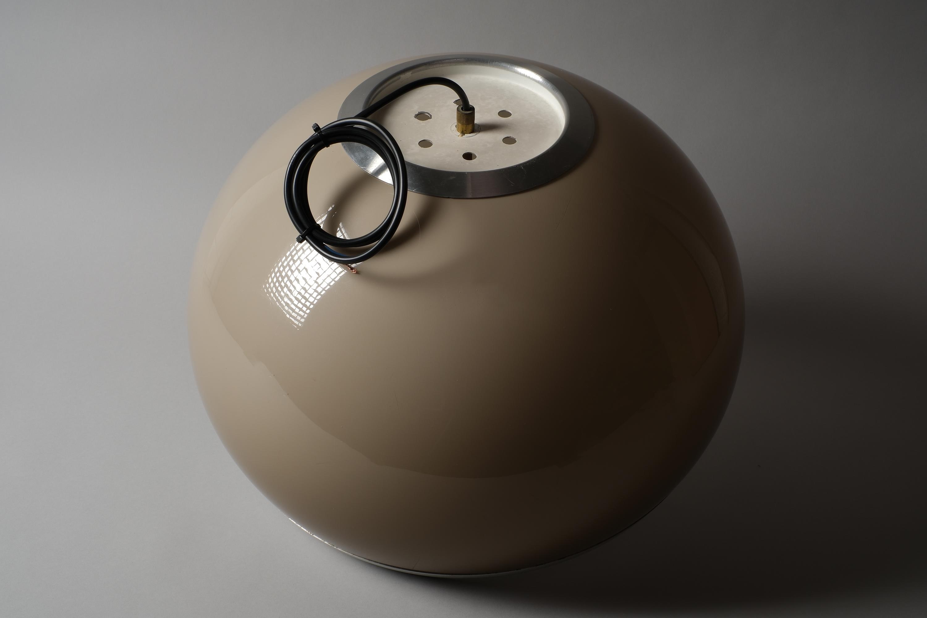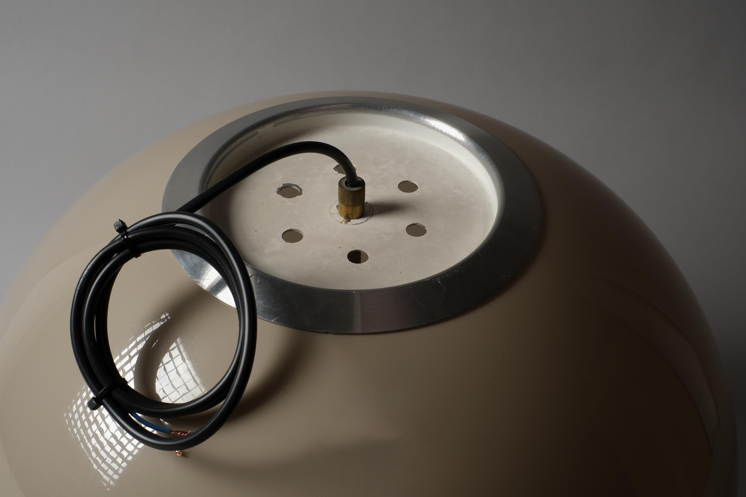 Vintage 1970s pendant lamp by Dijkstra Lampen, Haarlem, Holland. A large mocha brown acrylic dome shade with a wide brushed aluminium band. Light escapes through the gap between dome and band, casting a warm, diffused glow across the ceiling and room. The brown acrylic transmits light with a characteristic amber warmth that is the signature of Dijkstra's 1970s production.