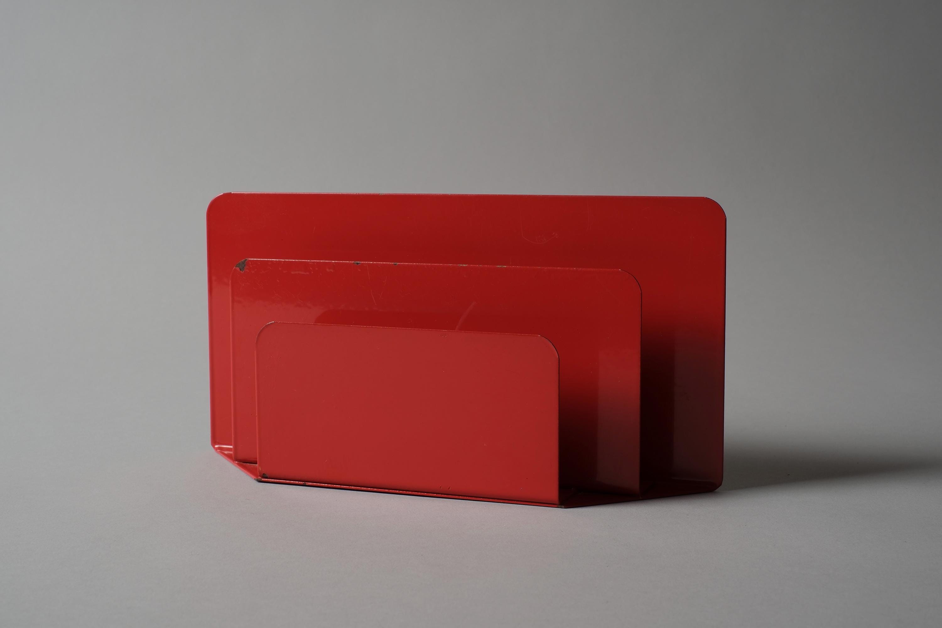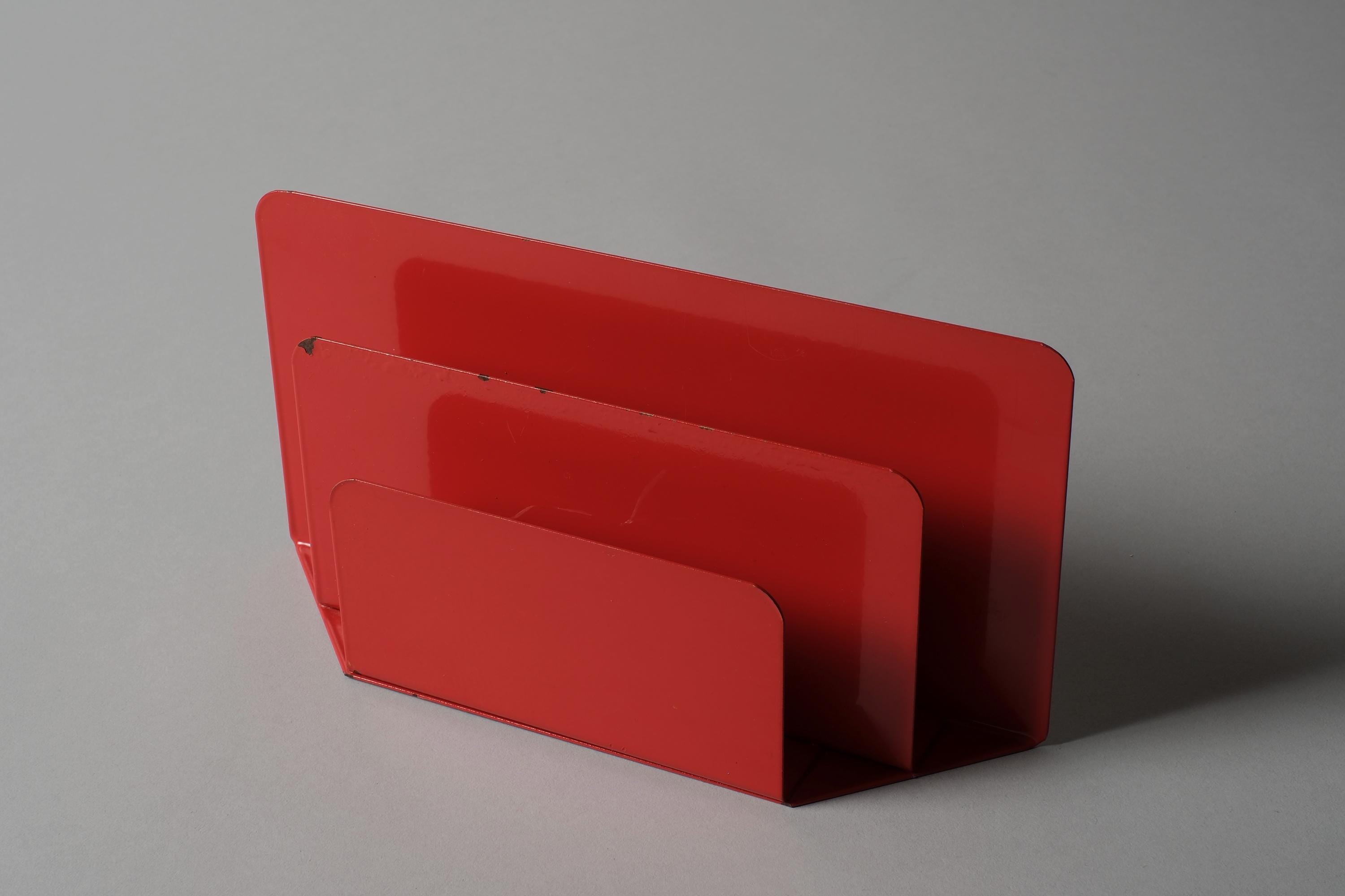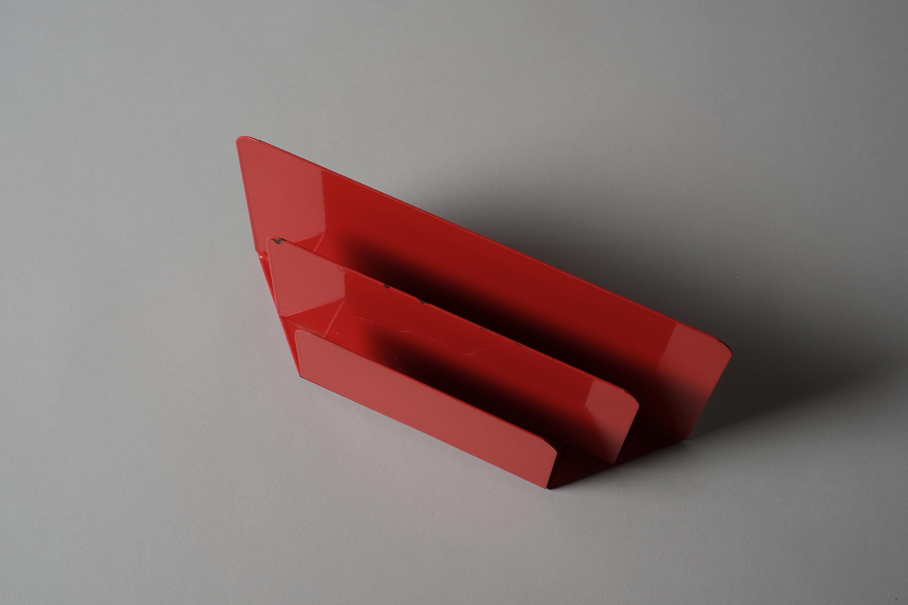 Vintage 1960s letter holder and desk organiser by NVF, Holland. A single bent red lacquered steel sheet forms two document slots in a tiered architectural design.