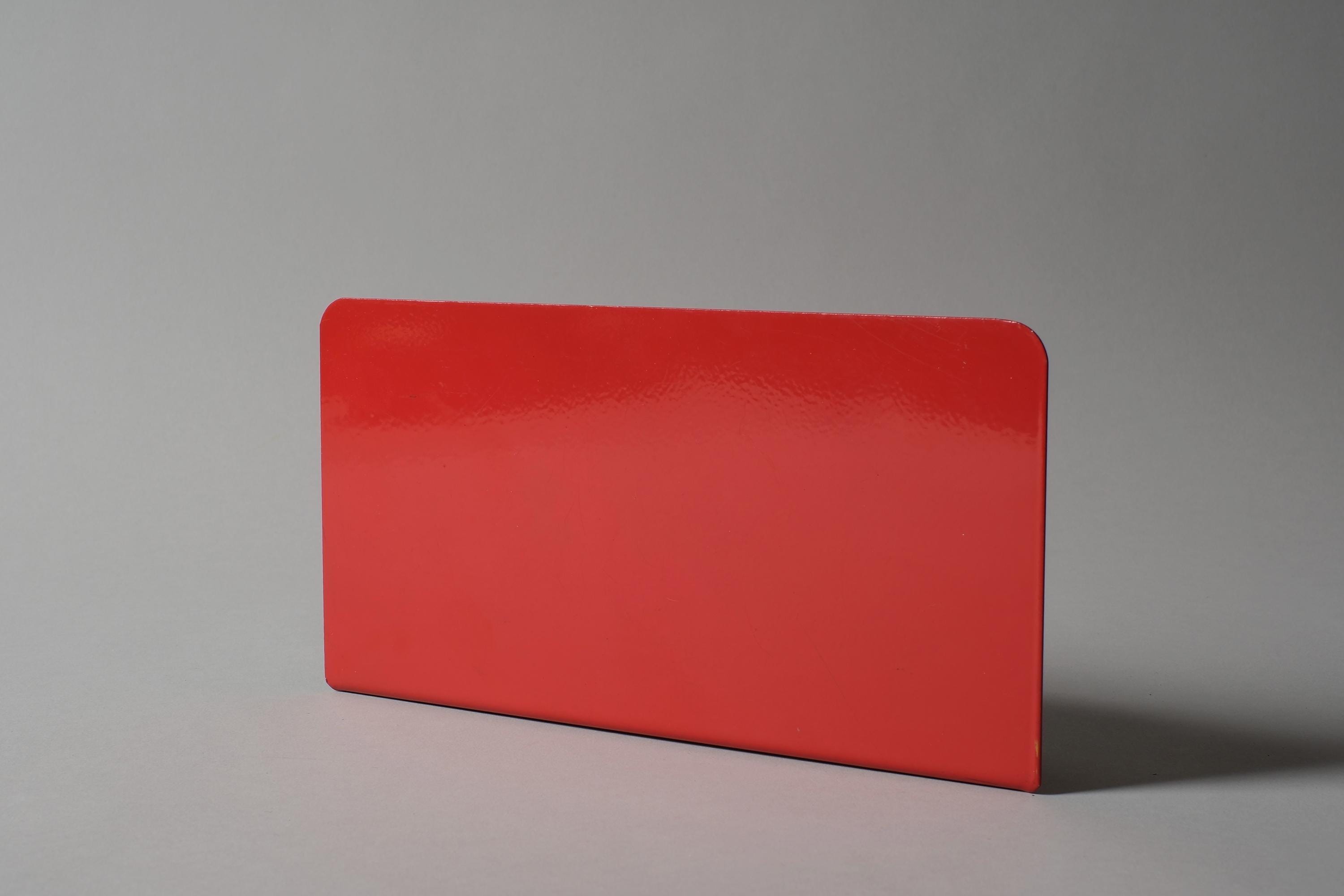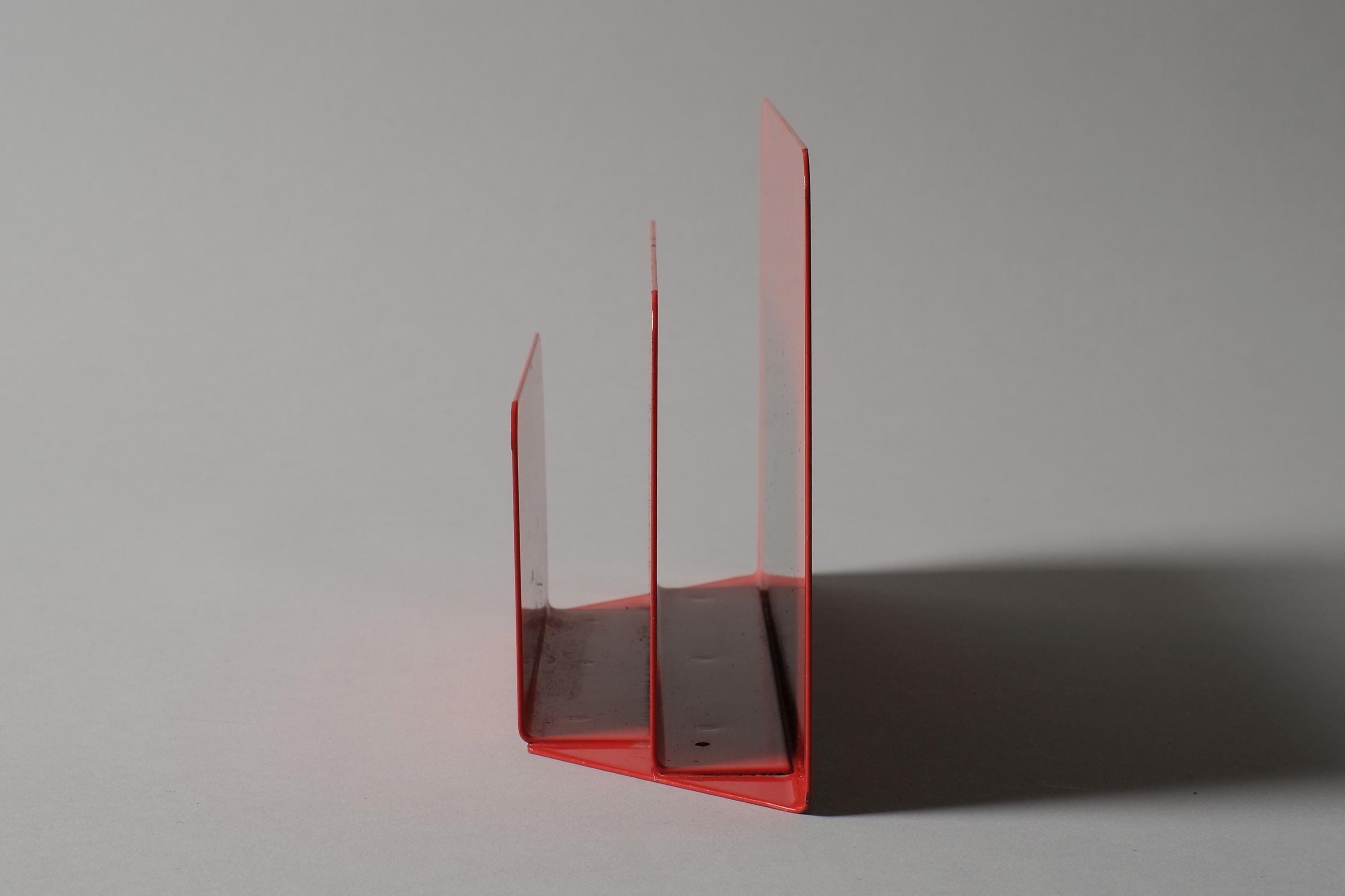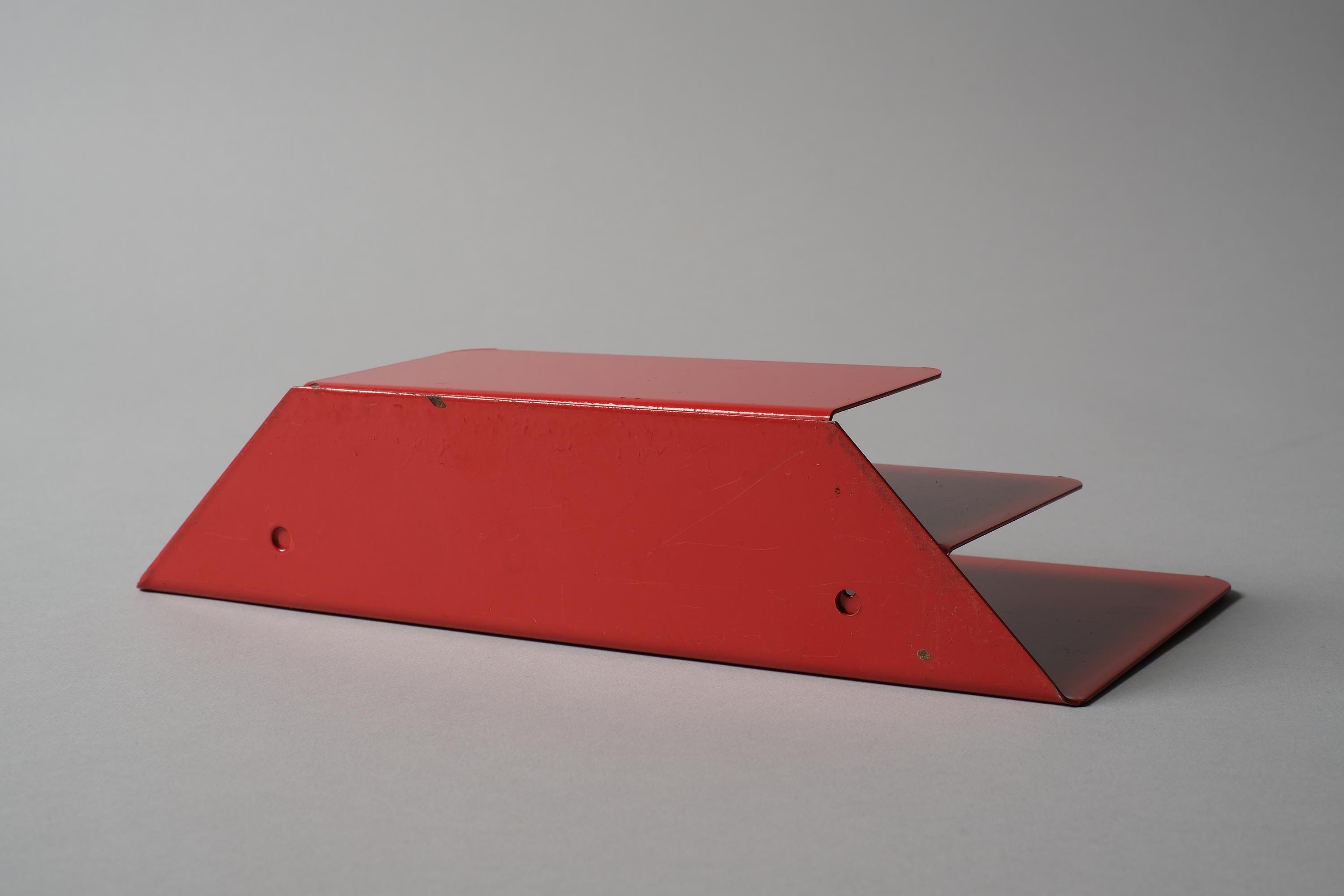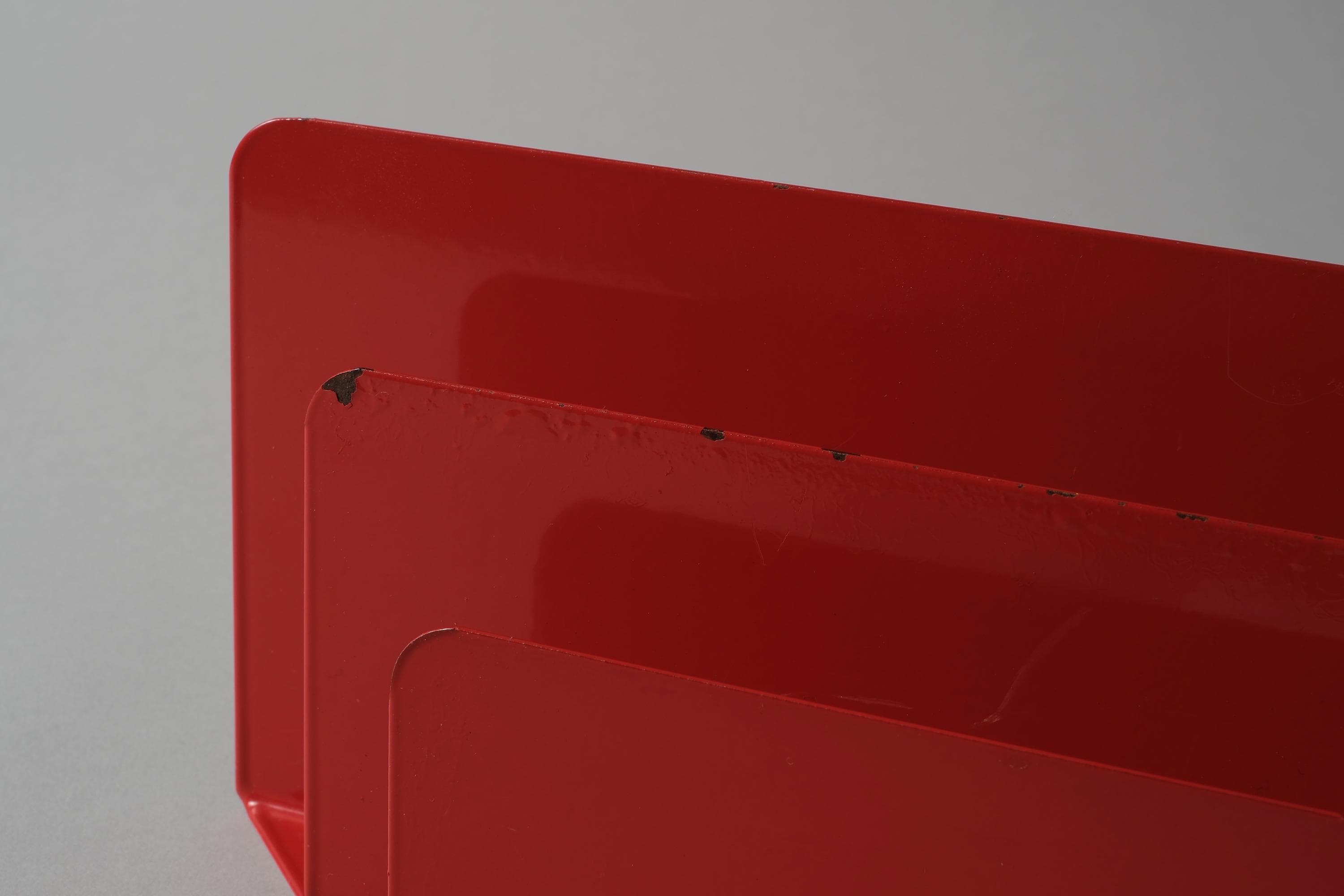 Vintage 1960s letter holder and desk organiser by NVF, Holland. A single bent red lacquered steel sheet forms two document slots in a tiered architectural design.